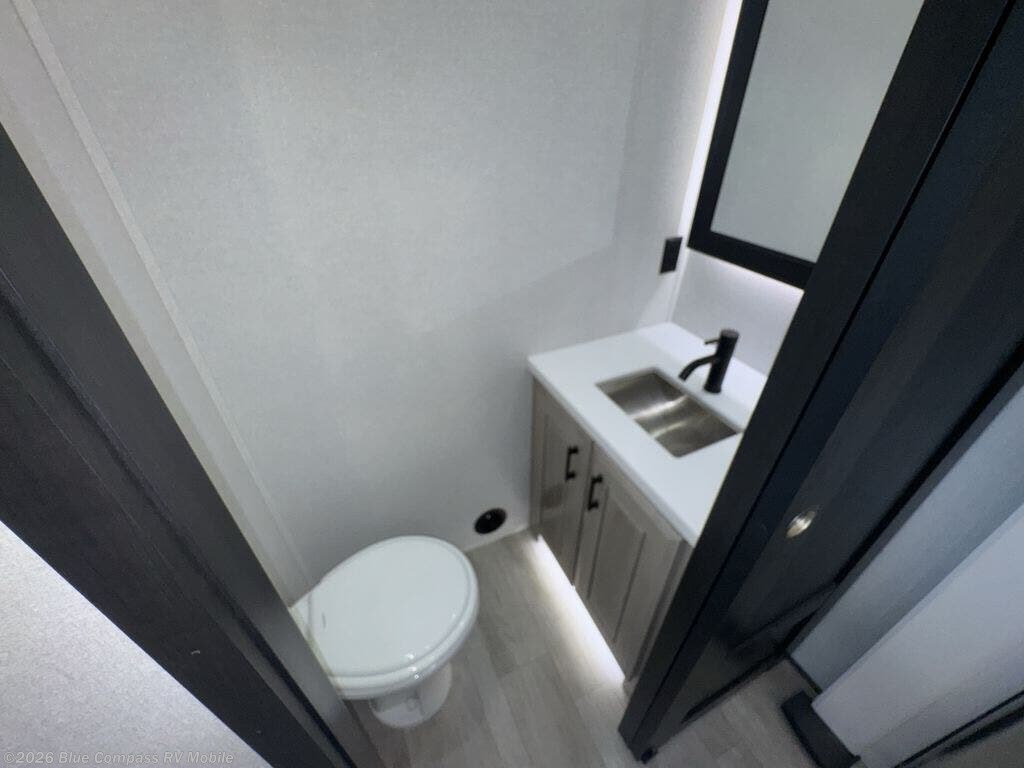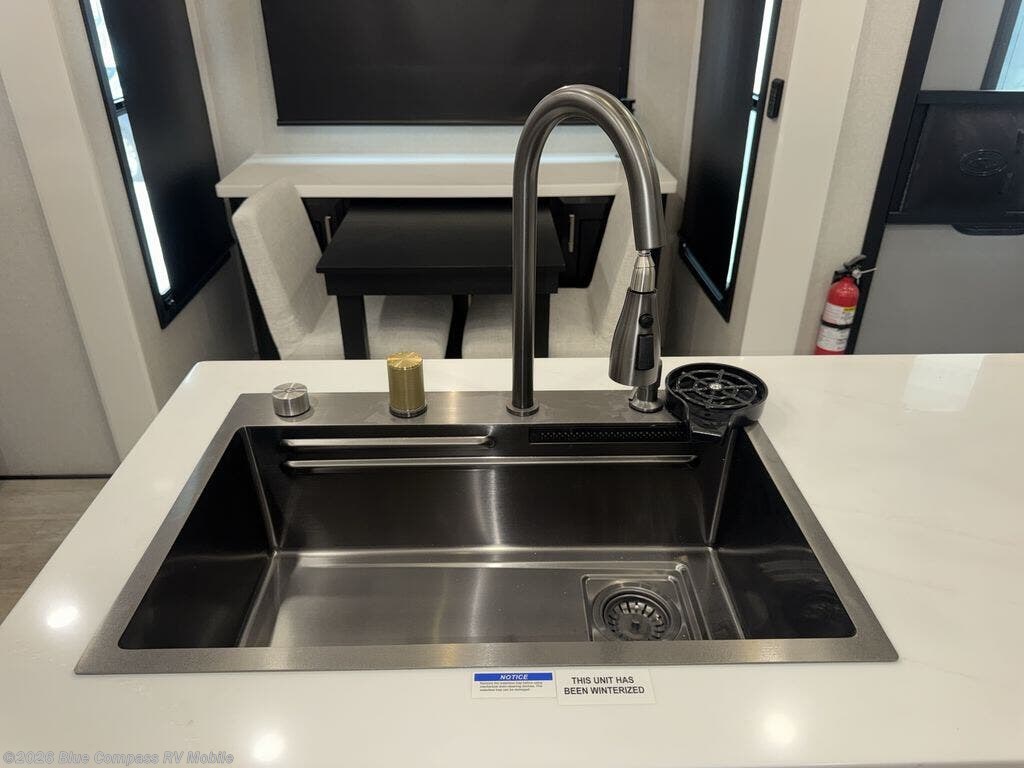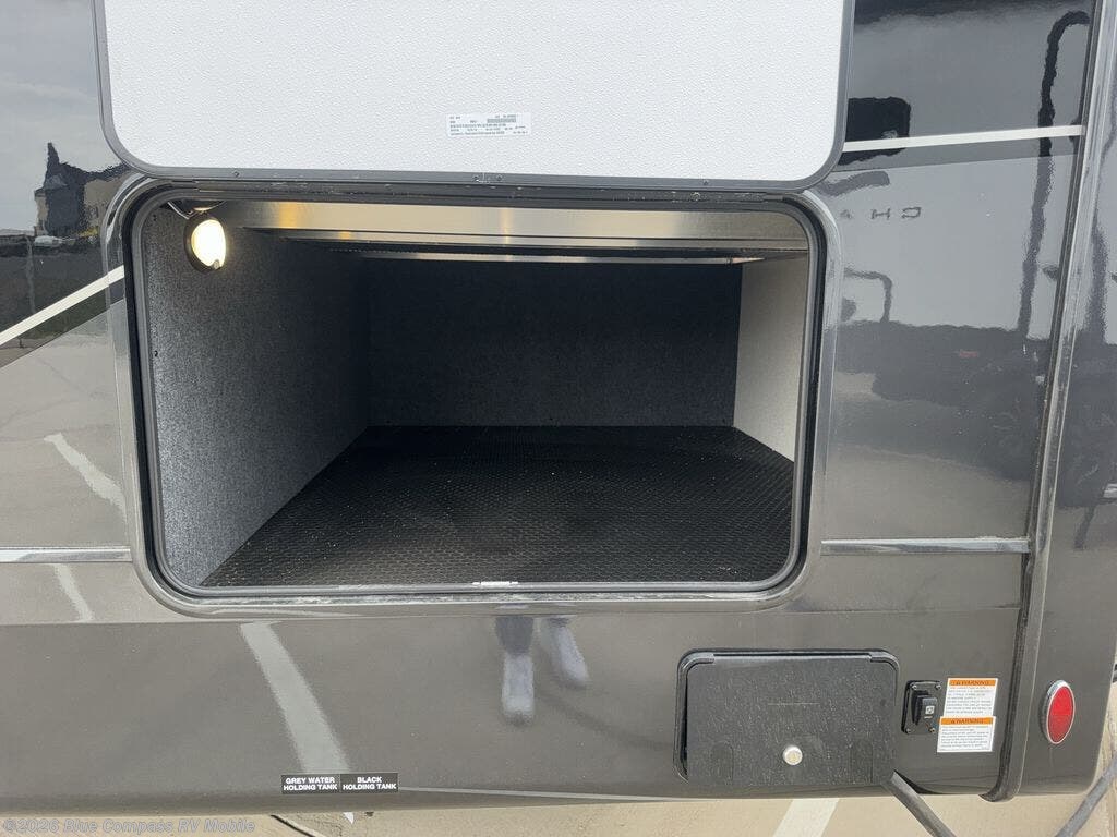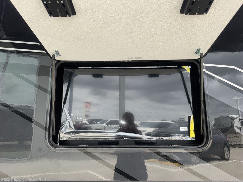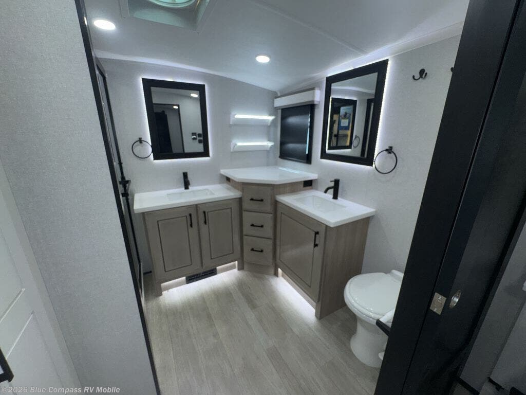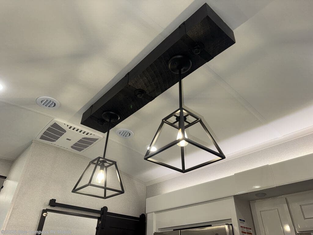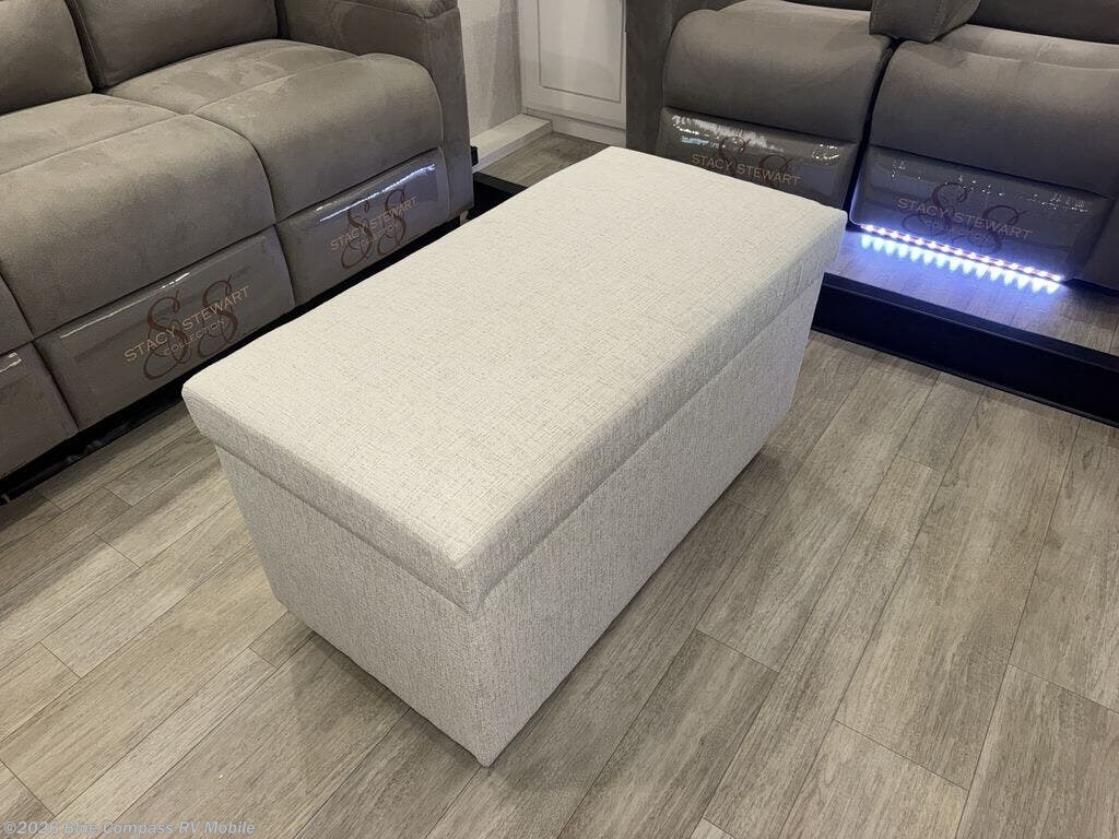 At the front of this fifth wheel, a spacious living area welcomes you with a theater seat and dual opposing slides that hold two tri-fold sofas, perfect for gathering the whole crew after a day of adventure and easily converted into extra sleeping space when needed. A 65" TV enhances cozy movie nights. Moving into the center, the kitchen opens up with its own slide-out, offering a 21-cu. ft. residential refrigerator, 30" convection microwave, 24" range, and plenty of overhead cabinets, along with a functional island equipped with a sink, pull-out cutting board, and generous prep space. A pantry sits conveniently nearby for dry goods, while a half bath across the way adds everyday convenience. Opposite the island, a roll-top dinette in another slide provides even more room to move around and the perfect spot for meals or board games. Toward the rear, the spacious bedroom features a 72" x 80" king bed in a slide for added walking space, along with a bench, a 32" TV, and dual wardrobes for clothing and essentials. At the very back, a luxurious full bathroom awaits, complete with double sinks for smooth morning routines and a 36" x 48" shower with a built-in seat for comfort and accessibility.