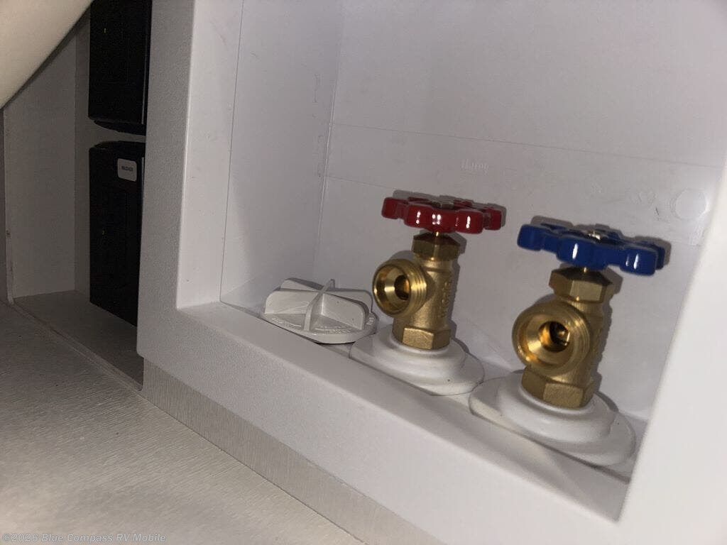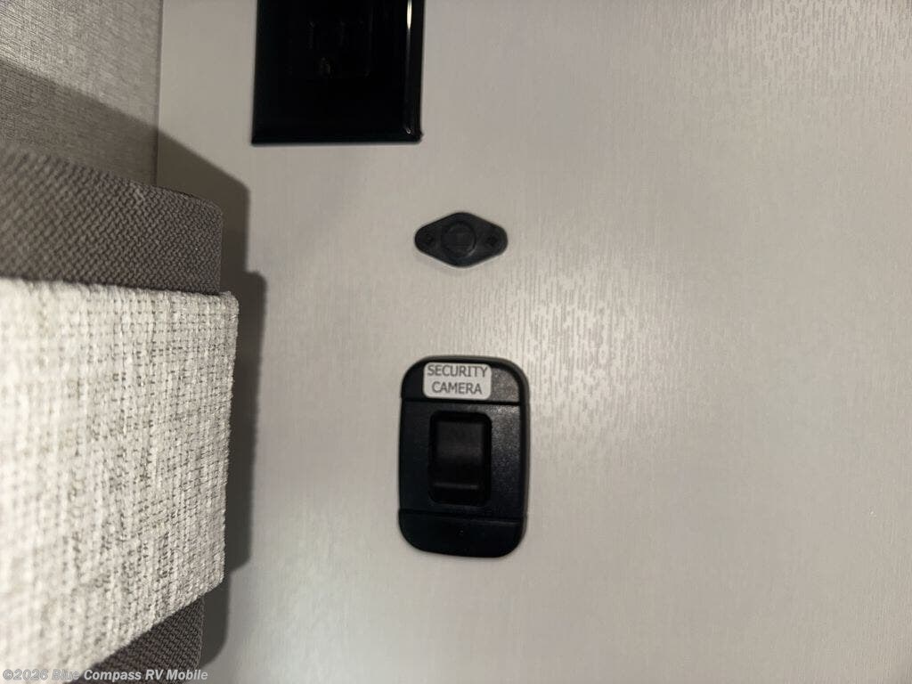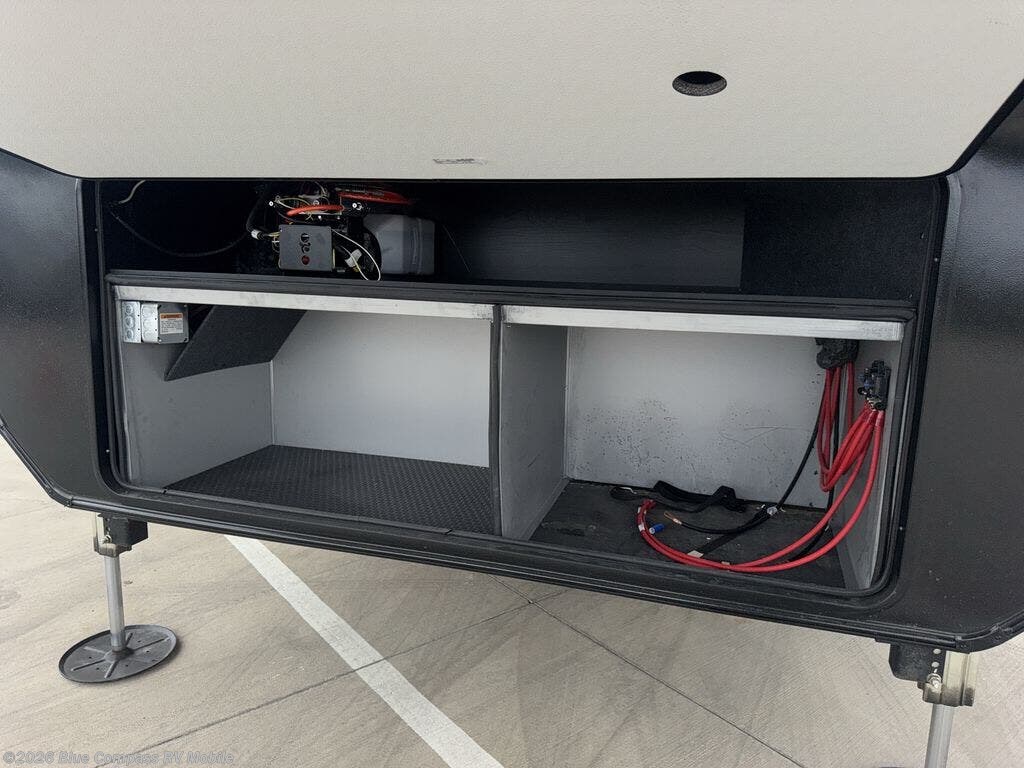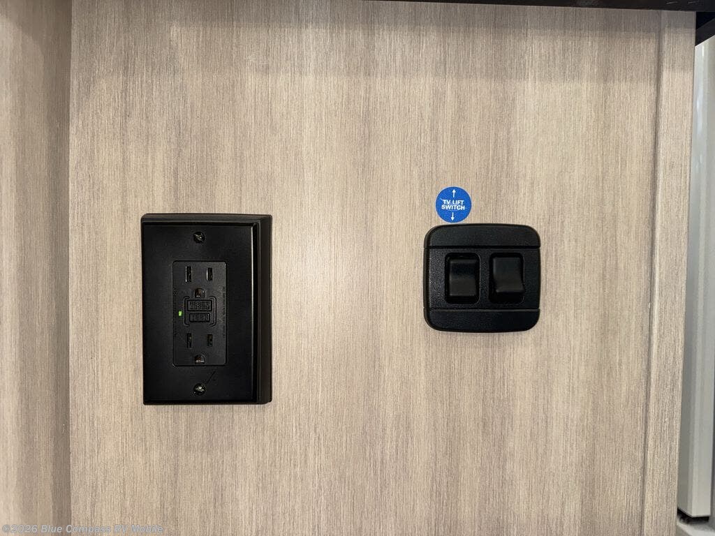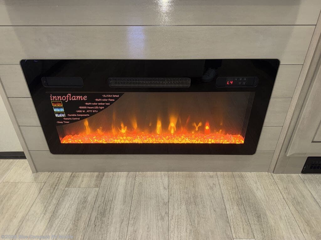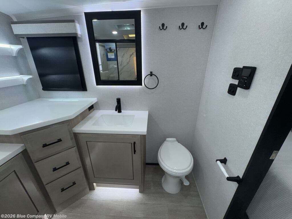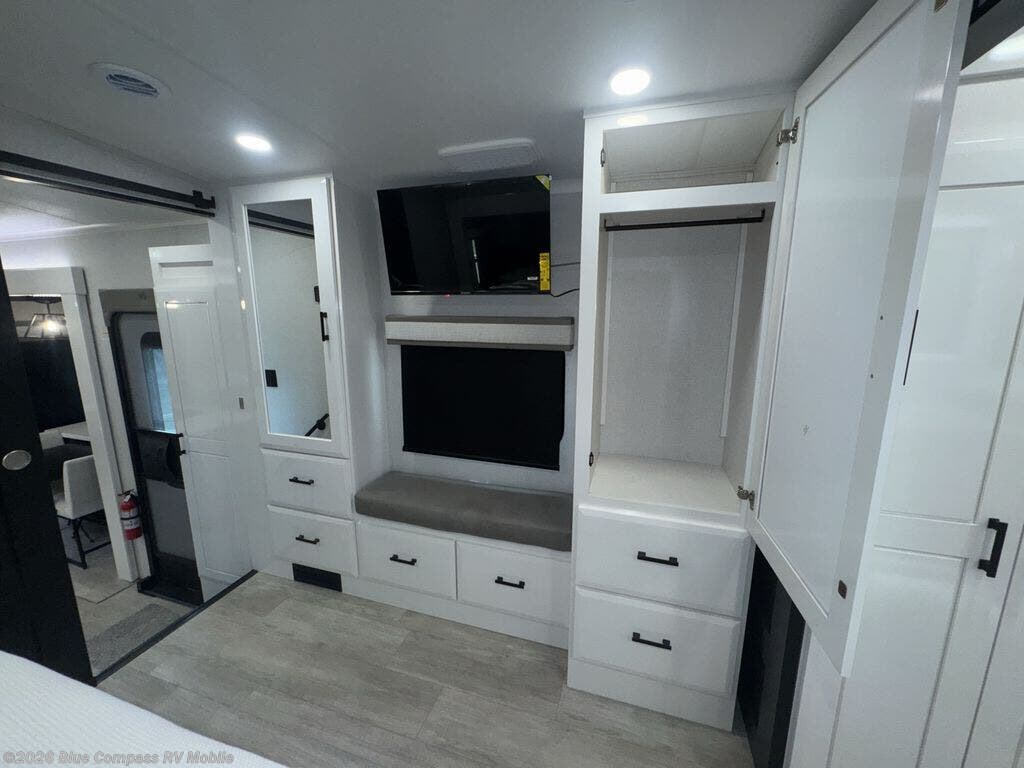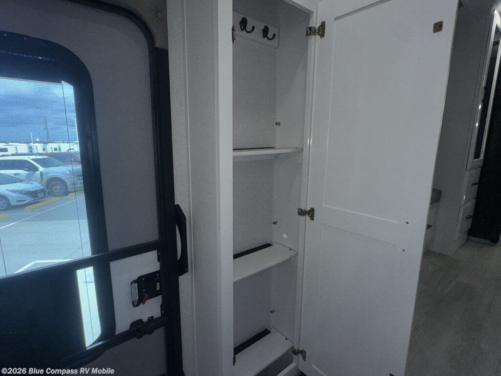 At the front of this fifth wheel, a spacious living area welcomes you with a theater seat and dual opposing slides that hold two tri-fold sofas, perfect for gathering the whole crew after a day of adventure and easily converted into extra sleeping space when needed. A 65" TV enhances cozy movie nights. Moving into the center, the kitchen opens up with its own slide-out, offering a 21-cu. ft. residential refrigerator, 30" convection microwave, 24" range, and plenty of overhead cabinets, along with a functional island equipped with a sink, pull-out cutting board, and generous prep space. A pantry sits conveniently nearby for dry goods, while a half bath across the way adds everyday convenience. Opposite the island, a roll-top dinette in another slide provides even more room to move around and the perfect spot for meals or board games. Toward the rear, the spacious bedroom features a 72" x 80" king bed in a slide for added walking space, along with a bench, a 32" TV, and dual wardrobes for clothing and essentials. At the very back, a luxurious full bathroom awaits, complete with double sinks for smooth morning routines and a 36" x 48" shower with a built-in seat for comfort and accessibility.