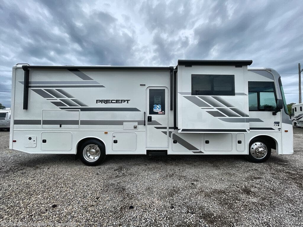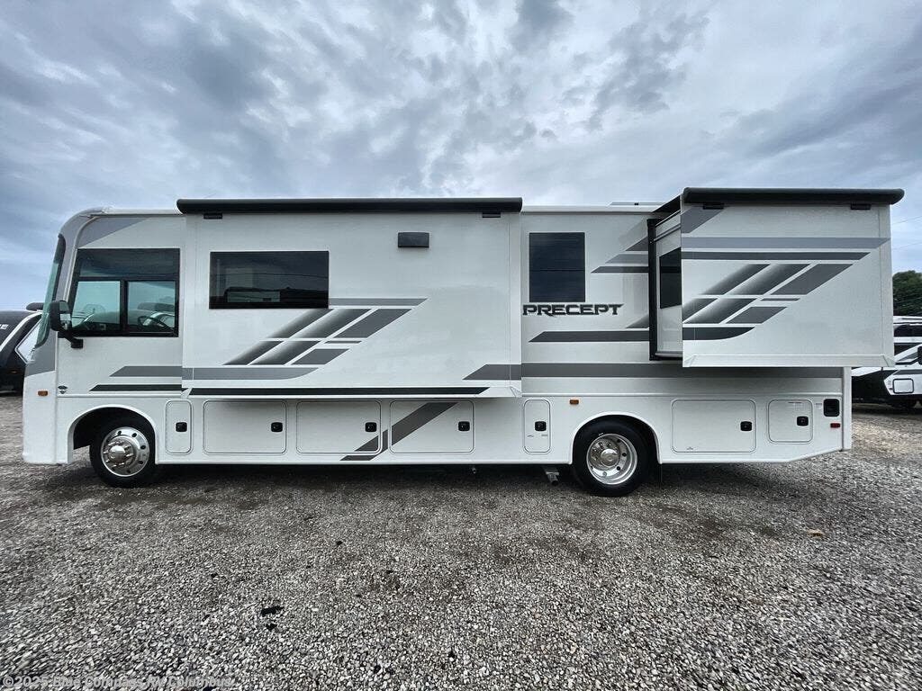 The Jayco Precept Class A gas motorhome comes with some features that you'll only find on a Jayco product, like the JRide Plus which offers you a powerful blend of precise handling and renowned stability on the road and the Firefly total coach control system which allows you to control your coach's operations from just about anywhere with your phone. You'll find two-point lap seatbelts in all designated seating locations, and the one-piece, seamless fiberglass front and rear caps resist wear and tear over the years. The Precept also offers you the lightest yet strongest construction in the industry with the Stronghold VBL lamination on the roof, floor, and sidewalls. You'll also be very pleased to find a 120" panoramic windshield, automatic hydraulic leveling jacks, and a 5,500W generator with auto-gen start.