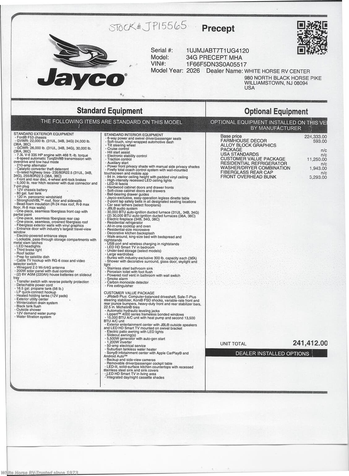 This Stock #JP15565 also has the following factory options included: Front Overhead Bunk, & Washer / Dryer Combination, Interior Decor Farmhouse & Alloy Block Graphics for Exterior Color .. all backed by Jayco’s 2+3-year warranty! Plus, this RV has an included Catalytic Converter Lock for your peace of mind at no additional charge. MSRP $241,412.00 .