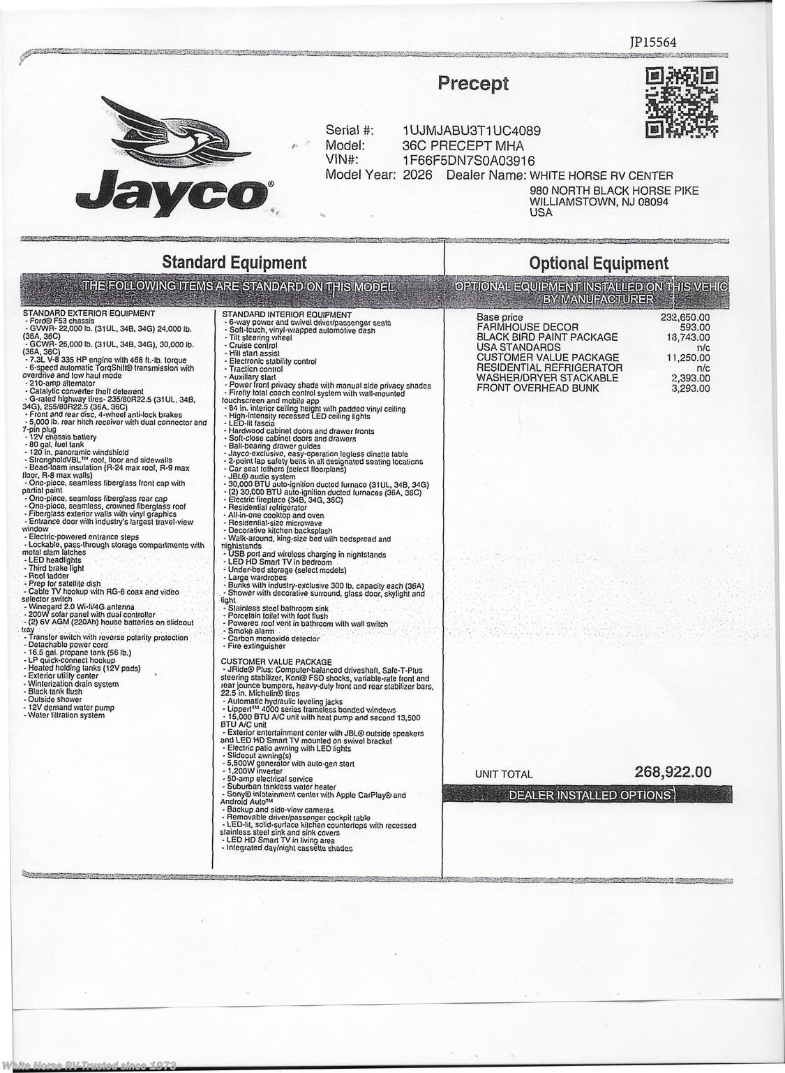 - Please visit, call or text Sales at 856-262-1717, or email for more details, then get ready to enjoy travel in comfort and style in your new 2026 Jayco Precept Class A Motorhome!!