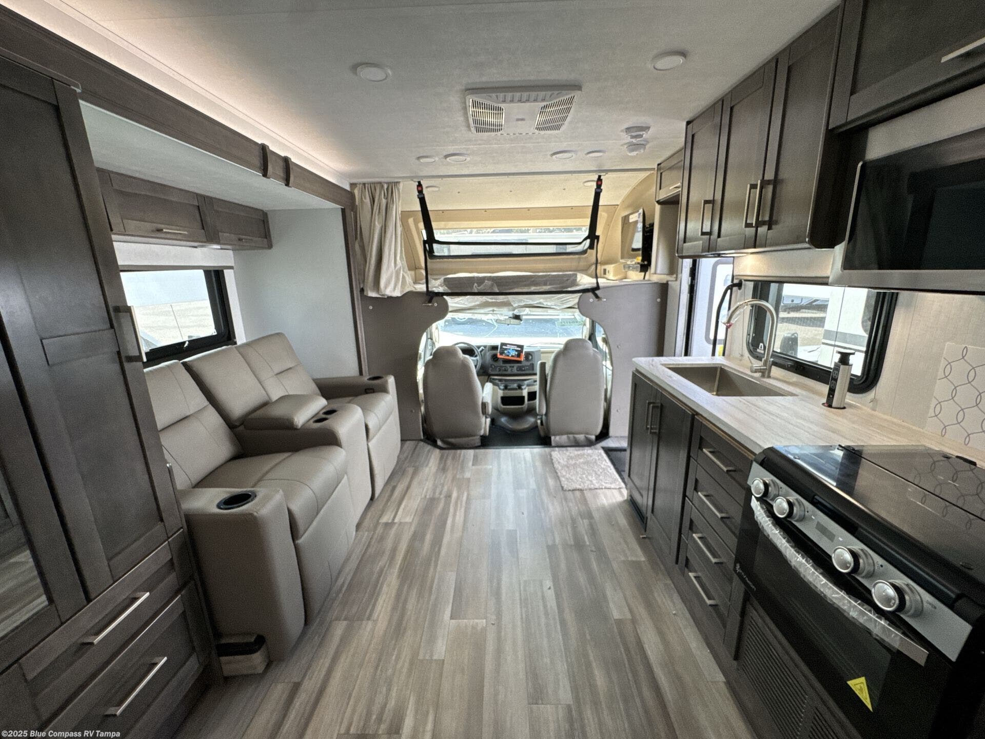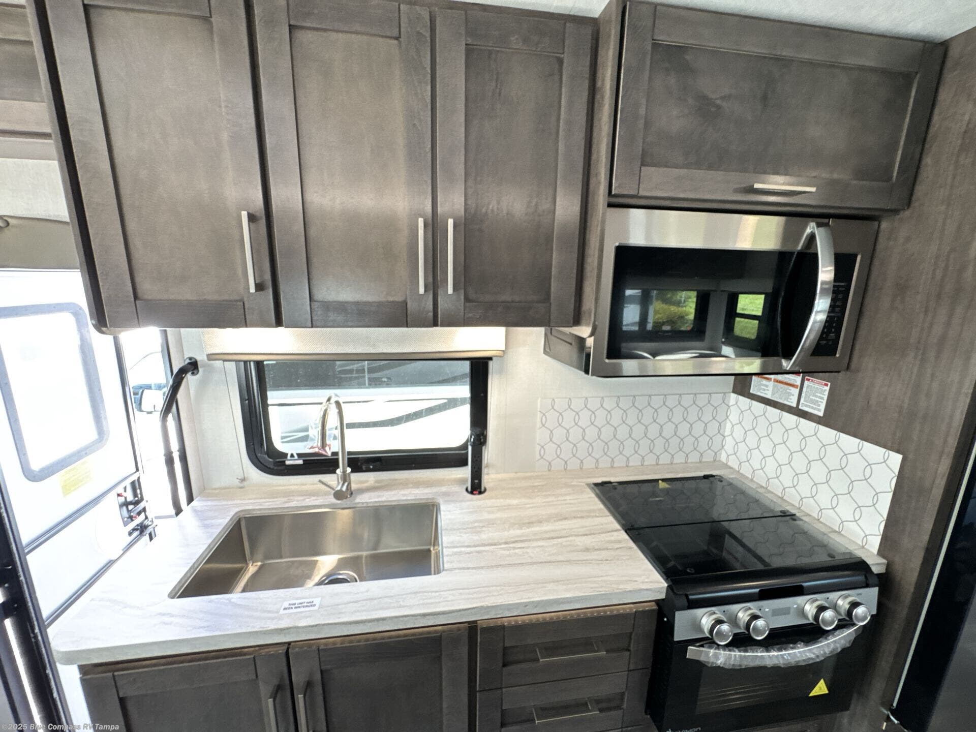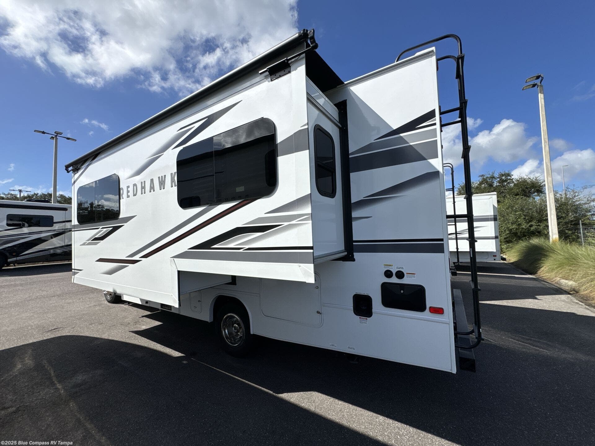 Easily load up and head out for an adventure in this Redhawk with sleeping space for five, a full bathroom, and kitchen amenities to stay fed the whole trip. Once at your campsite, easily let out the slide and the 16' electric awning and plan your next activity. You an use the full bath, make a meal in the kitchen with the Furrion all-in-one cooktop and oven, plus the residential-size microwave, and grab your beverage from the 10 cu. ft. refrigerator. The driver and passenger seats swivel for more interior seating, and if you like, choose the theater seating option in place of the U-shaped dinette.