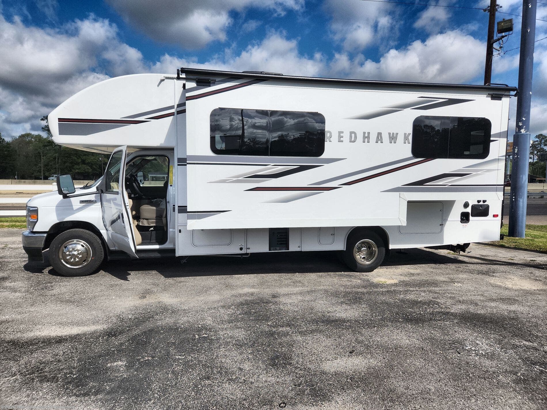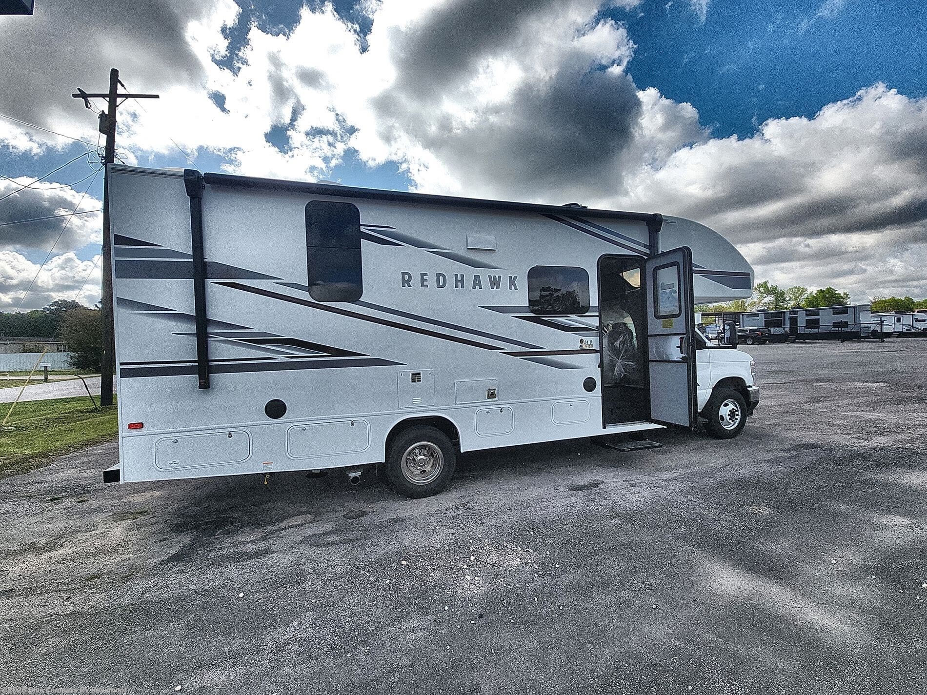 Easily load up and head out for an adventure in this Redhawk with sleeping space for five, a full bathroom, and kitchen amenities to stay fed the whole trip. Once at your campsite, easily let out the slide and the 16' electric awning and plan your next activity. You can use the full bath, make a meal in the kitchen with the all-in-one cooktop and oven, plus the residential-size microwave, and grab your beverage from the 10-cu. ft. refrigerator. The driver and passenger seats swivel for more interior seating, and if you like, choose the theater seating option in place of the U-shaped dinette.