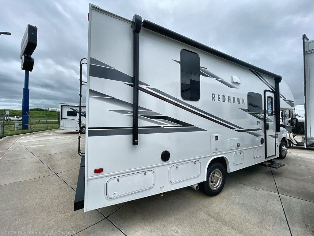 Easily load up and head out for an adventure in this Redhawk with sleeping space for five, a full bathroom, and kitchen amenities to stay fed the whole trip. Once at your campsite, easily let out the slide and the 16' electric awning and plan your next activity. You an use the full bath, make a meal in the kitchen with the Furrion all-in-one cooktop and oven, plus the residential-size microwave, and grab your beverage from the 10 cu. ft. refrigerator. The driver and passenger seats swivel for more interior seating, and if you like, choose the theater seating option in place of the U-shaped dinette.