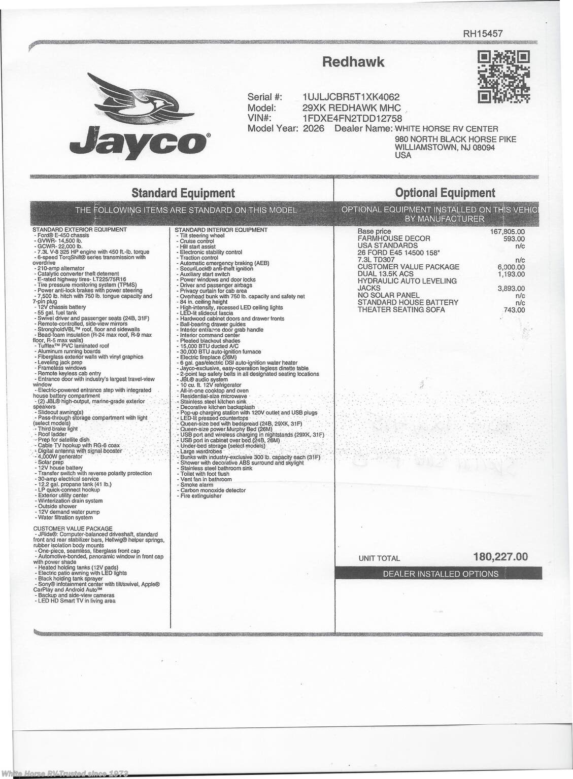 This Stock #RH15457 also has the following factory options included: Automatic Hydraulic Leveling Jacks, Dual Air Conditioning, and Theater Seating (in lieu of Sofa) ... all backed by Jayco’s 2+3 year warranty! MSRP $180,227.00.