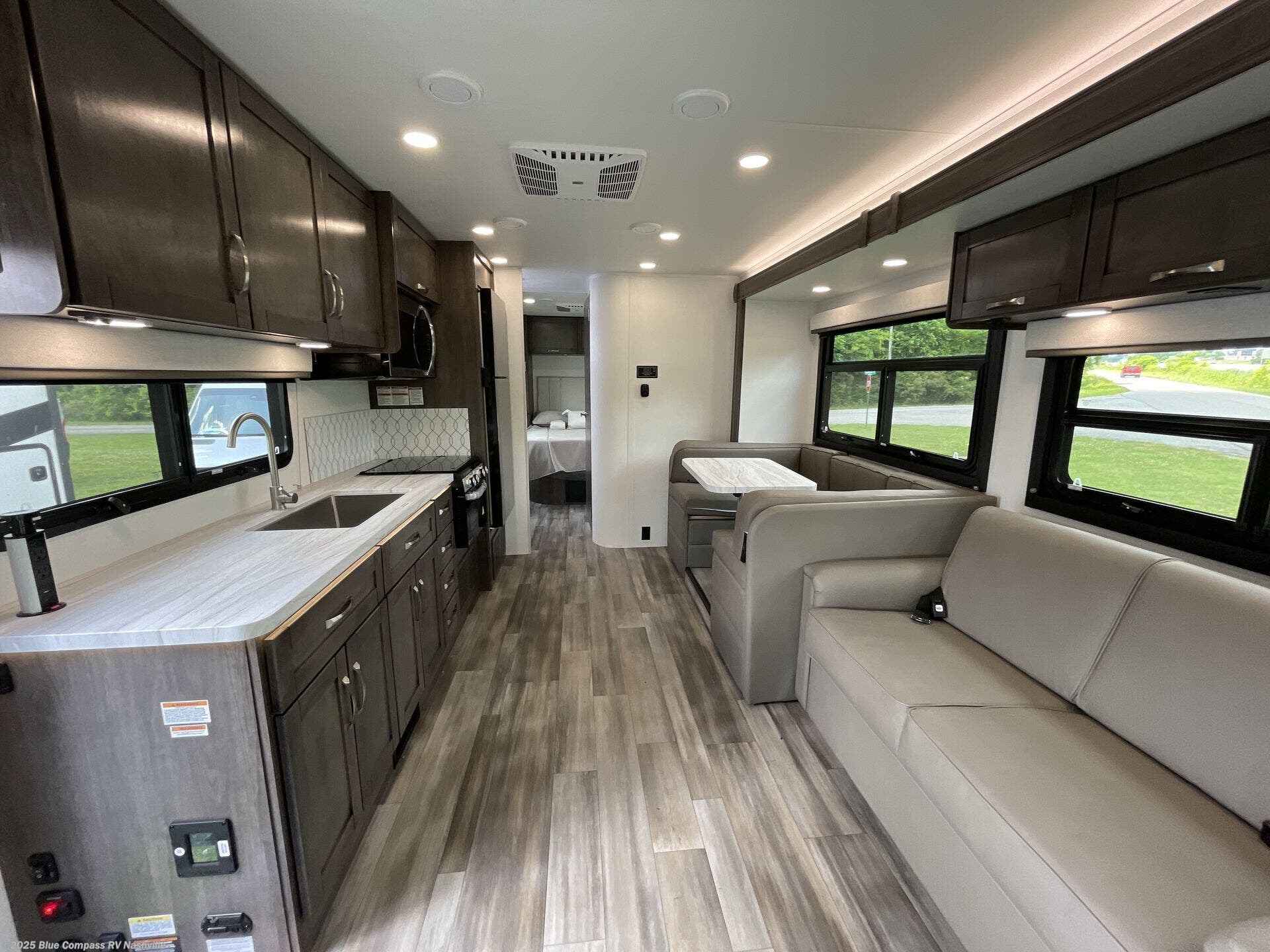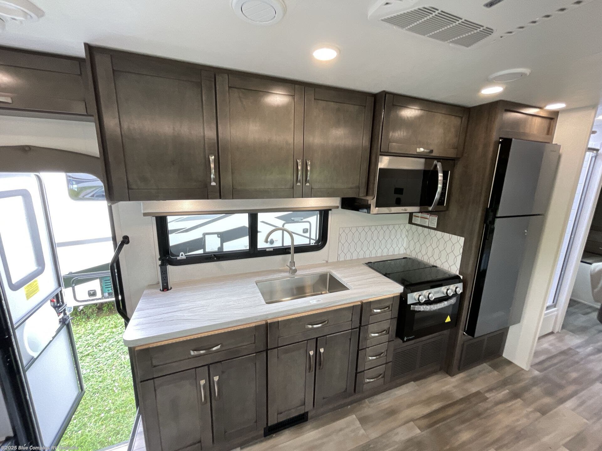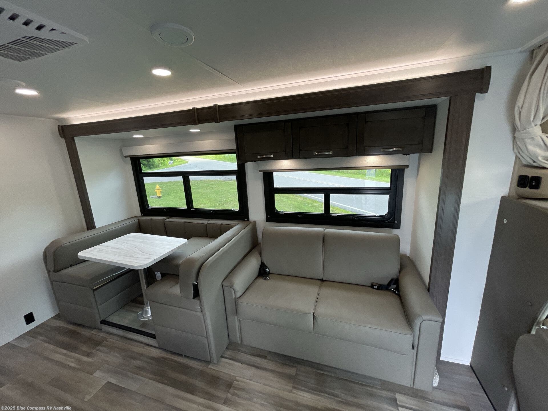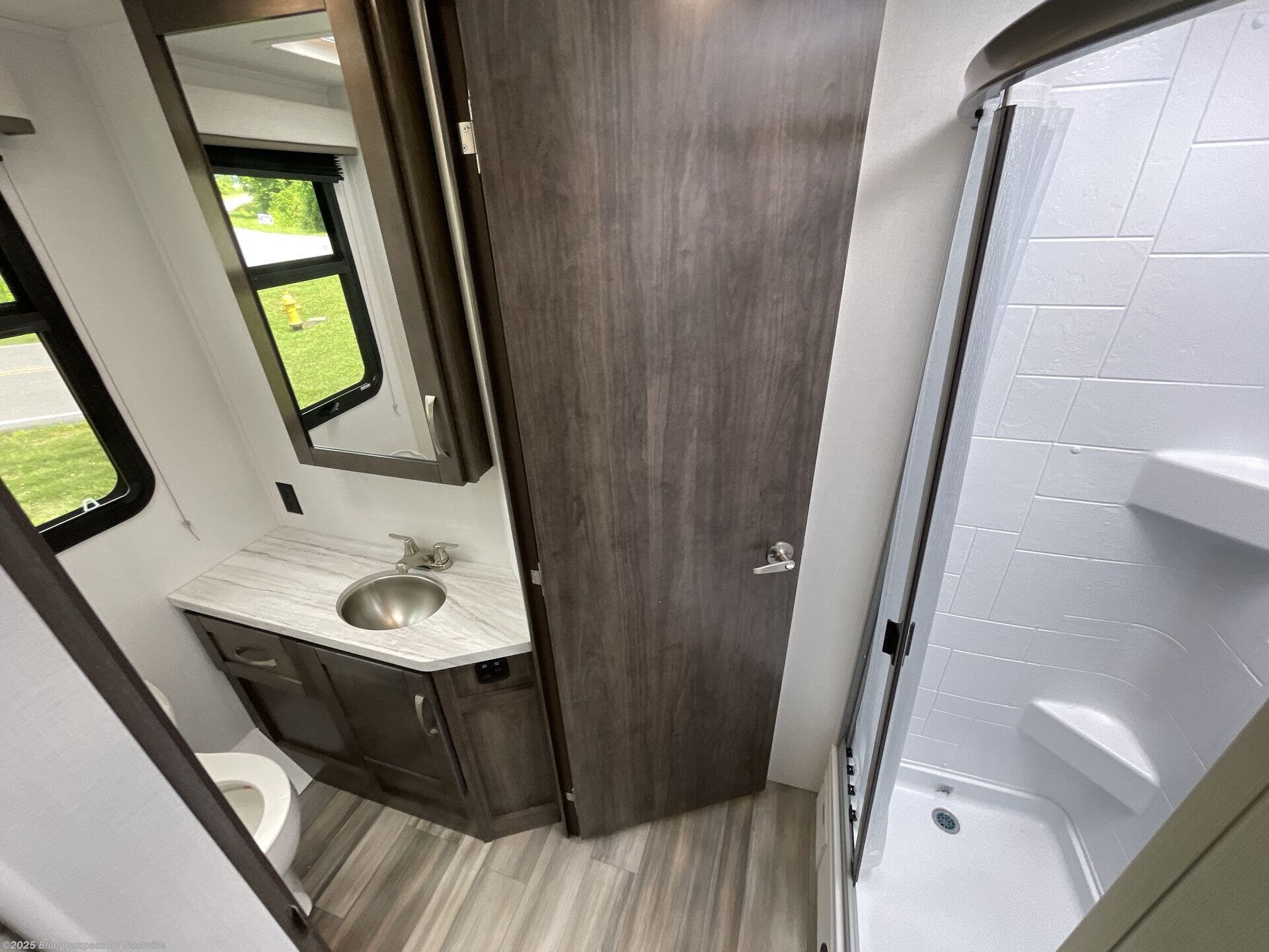Explore new places as you travel in this coach with the comforts of home and the conveniences you are accustom to. In the rear bedroom, you will appreciate privacy when you close the divider to enjoy the walk-around queen bed with storage for your clothes. There is a private toilet and sink with the shower right across the hall so two people can freshen up at once. The chef will love the galley kitchen which is spacious thanks to the furniture slide out. The Furrion all-in-one cooktop along with the residential-size microwave, plus the 10 cu. ft. refrigerator will give the cook everything for warm meals for two or more. The driver and passenger seats swivel to become a part of the living area seating, and the cab-over bunk her will be a big plus for the little ones. You can also choose the optional theater seating in place of the sofa if you're not needing the additional sleeping space.