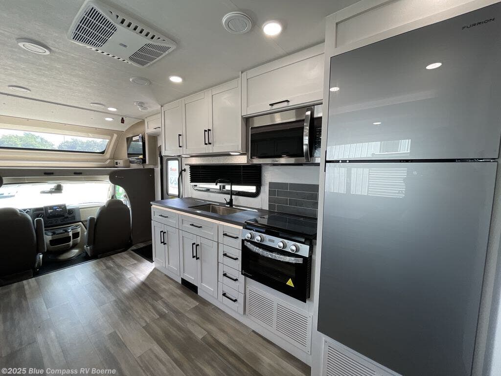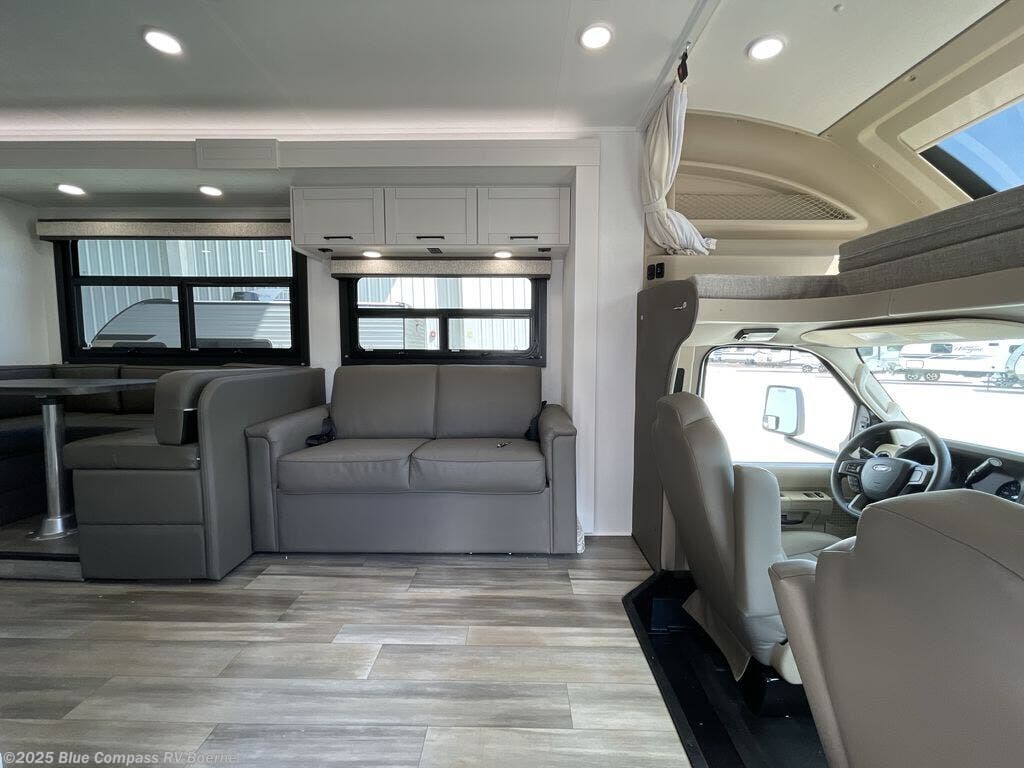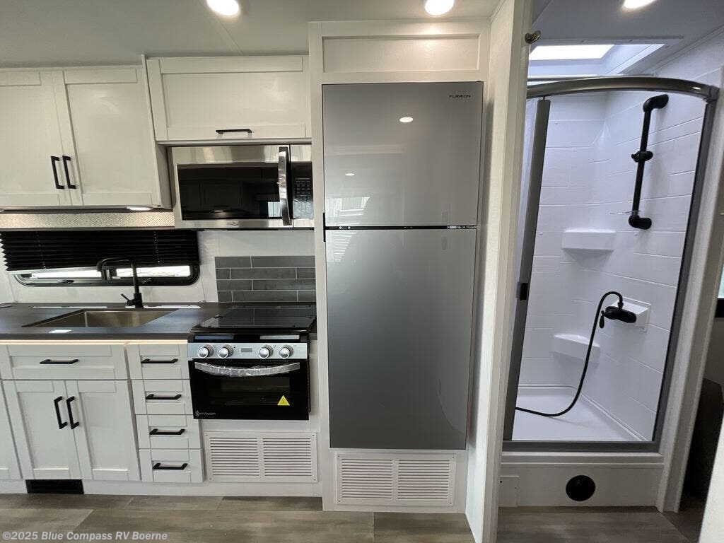 Explore new places as you travel in this coach with the comforts of home and the conveniences you are accustom to. In the rear bedroom, you will appreciate privacy when you close the divider to enjoy the walk-around queen bed with storage for your clothes. There is a private toilet and sink with the shower right across the hall so two people can freshen up at once. The chef will love the galley kitchen which is spacious thanks to the furniture slide out. The Furrion all-in-one cooktop along with the residential-size microwave, plus the 10 cu. ft. refrigerator will give the cook everything for warm meals for two or more. The driver and passenger seats swivel to become a part of the living area seating, and the cab-over bunk her will be a big plus for the little ones. You can also choose the optional theater seating in place of the sofa if you're not needing the additional sleeping space.