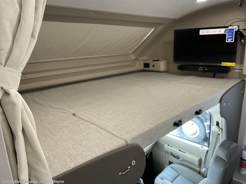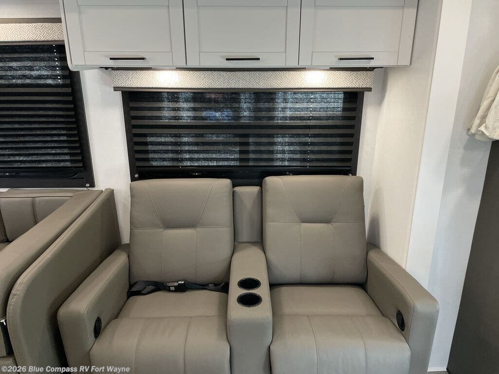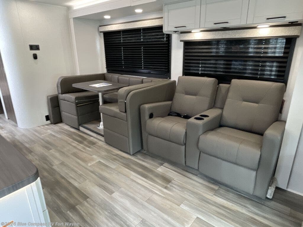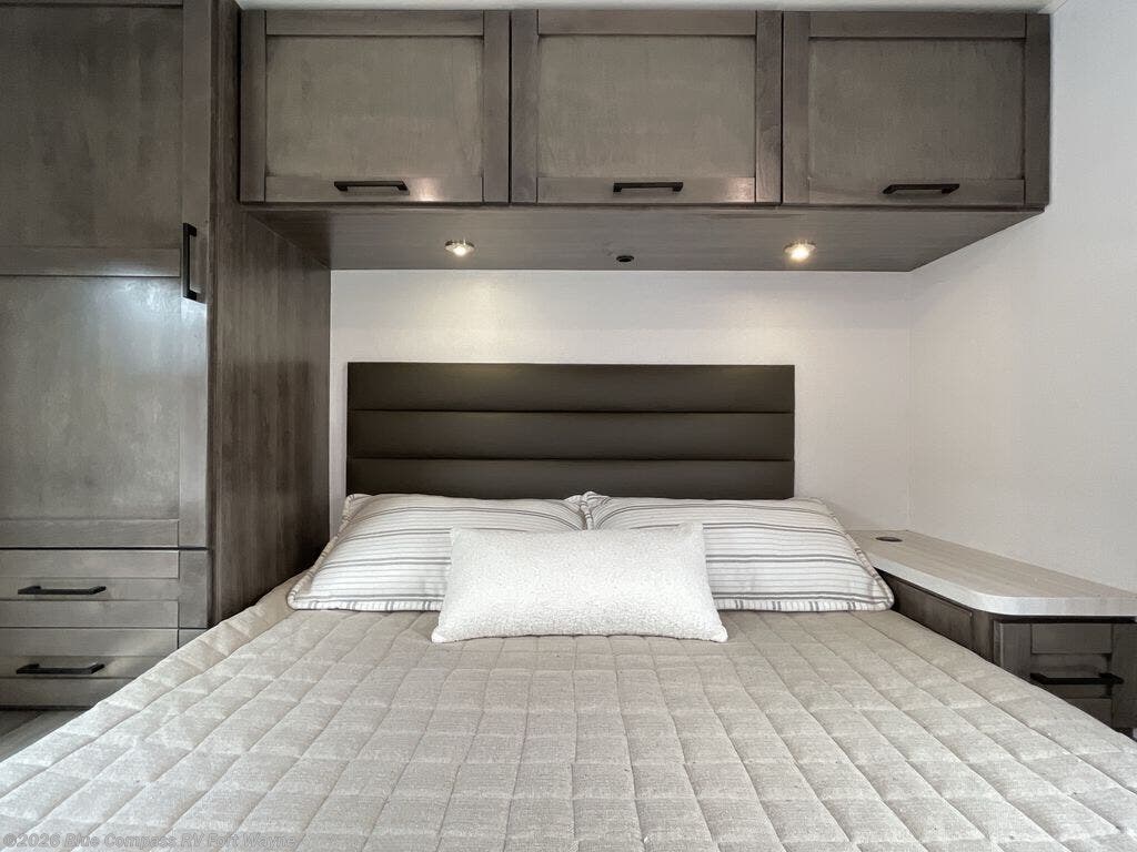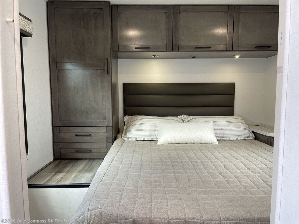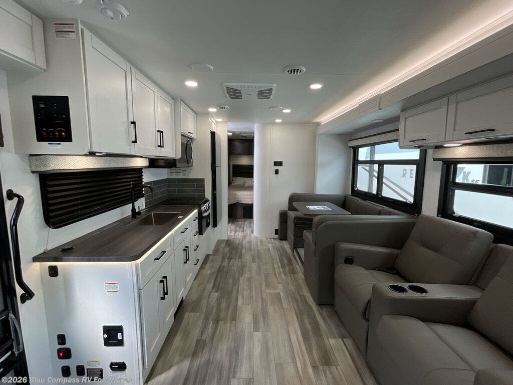 Explore new places as you travel in this coach with the comforts of home and the conveniences you are accustom to. In the rear bedroom, you will appreciate privacy when you close the divider to enjoy the walk-around queen bed with storage for your clothes. There is a private toilet and sink with the shower right across the hall so two people can freshen up at once. The chef will love the galley kitchen which is spacious thanks to the furniture slide out. The Furrion all-in-one cooktop along with the residential-size microwave, plus the 10 cu. ft. refrigerator will give the cook everything for warm meals for two or more. The driver and passenger seats swivel to become a part of the living area seating, and the cab-over bunk her will be a big plus for the little ones. You can also choose the optional theater seating in place of the sofa if you're not needing the additional sleeping space.