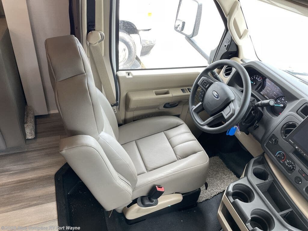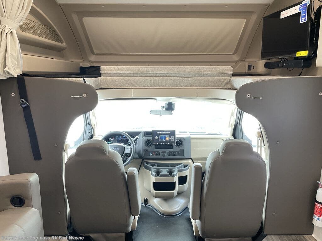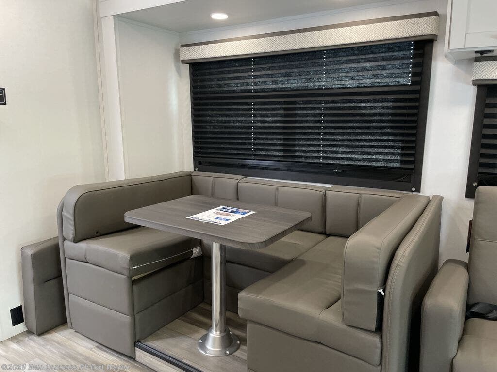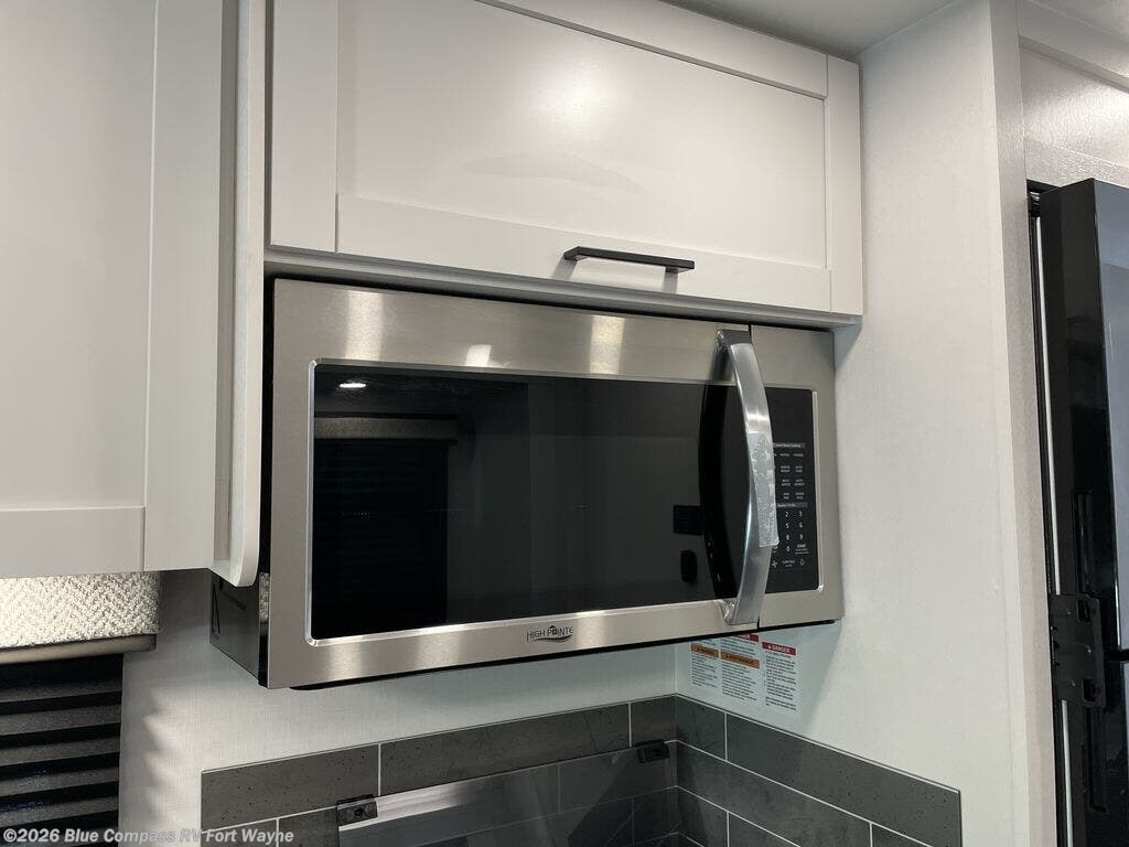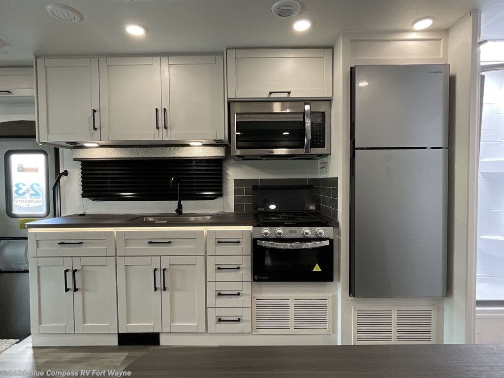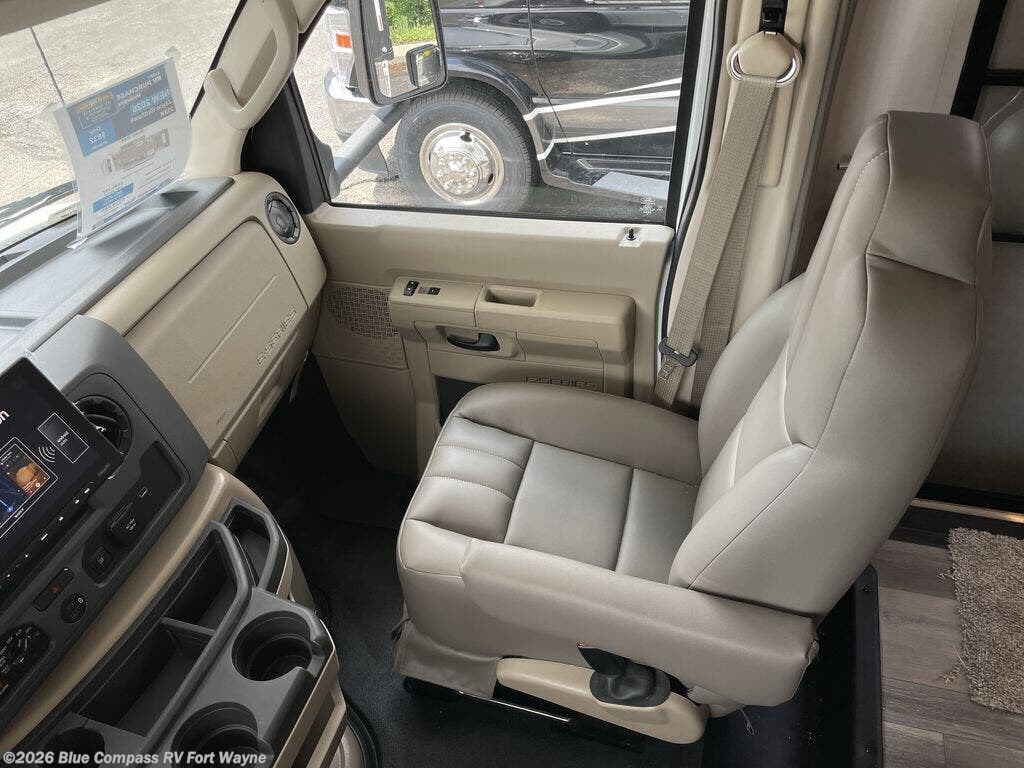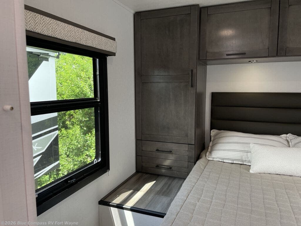 Explore new places as you travel in this coach with the comforts of home and the conveniences you are accustom to. In the rear bedroom, you will appreciate privacy when you close the divider to enjoy the walk-around queen bed with storage for your clothes. There is a private toilet and sink with the shower right across the hall so two people can freshen up at once. The chef will love the galley kitchen which is spacious thanks to the furniture slide out. The Furrion all-in-one cooktop along with the residential-size microwave, plus the 10 cu. ft. refrigerator will give the cook everything for warm meals for two or more. The driver and passenger seats swivel to become a part of the living area seating, and the cab-over bunk her will be a big plus for the little ones. You can also choose the optional theater seating in place of the sofa if you're not needing the additional sleeping space.