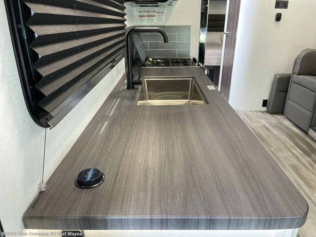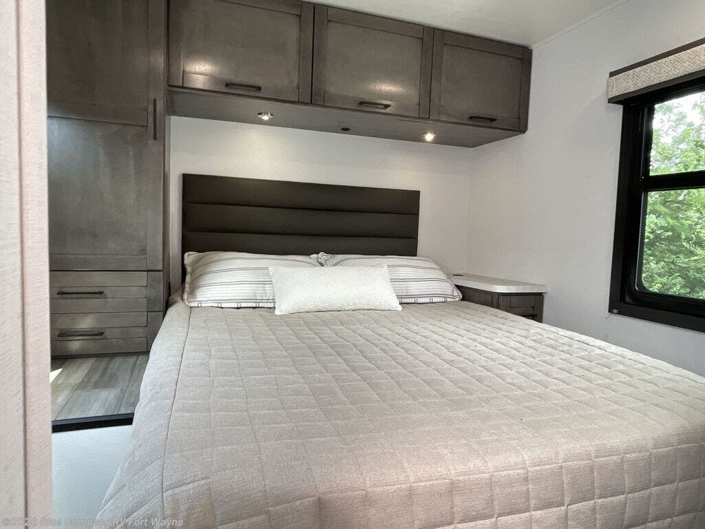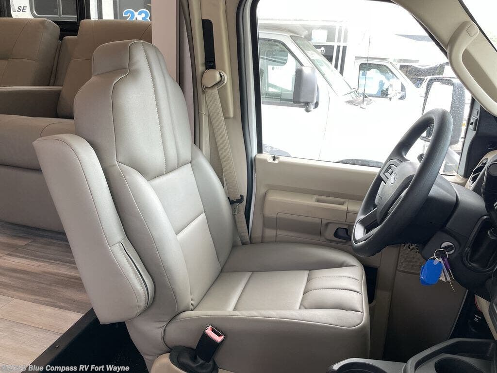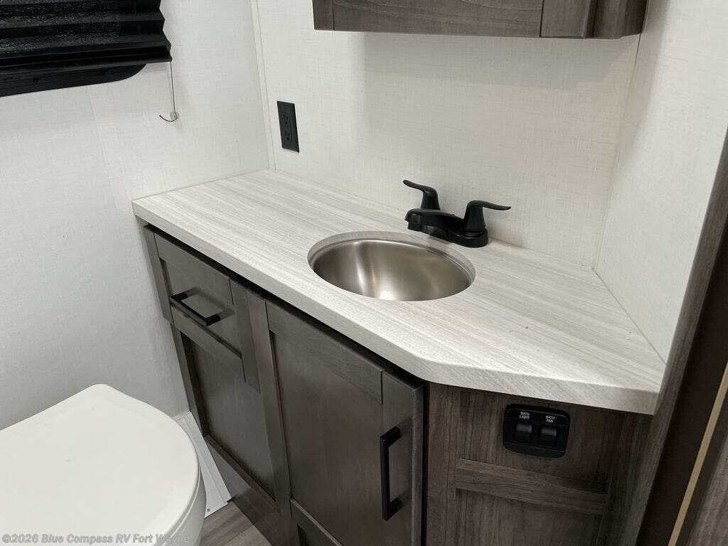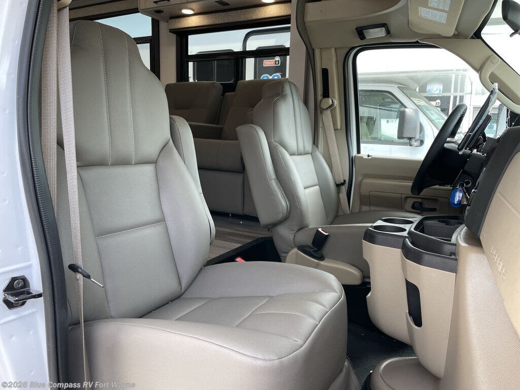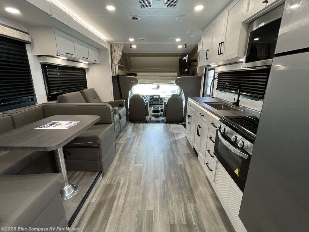 Explore new places as you travel in this coach with the comforts of home and the conveniences you are accustom to. In the rear bedroom, you will appreciate privacy when you close the divider to enjoy the walk-around queen bed with storage for your clothes. There is a private toilet and sink with the shower right across the hall so two people can freshen up at once. The chef will love the galley kitchen which is spacious thanks to the furniture slide out. The Furrion all-in-one cooktop along with the residential-size microwave, plus the 10 cu. ft. refrigerator will give the cook everything for warm meals for two or more. The driver and passenger seats swivel to become a part of the living area seating, and the cab-over bunk her will be a big plus for the little ones. You can also choose the optional theater seating in place of the sofa if you're not needing the additional sleeping space.