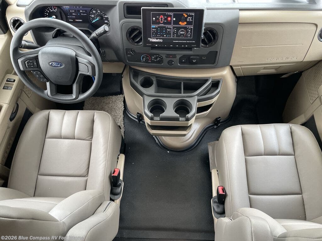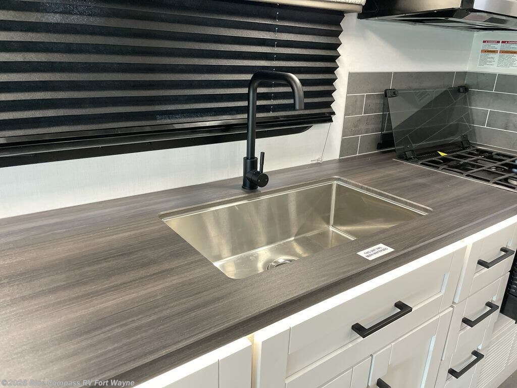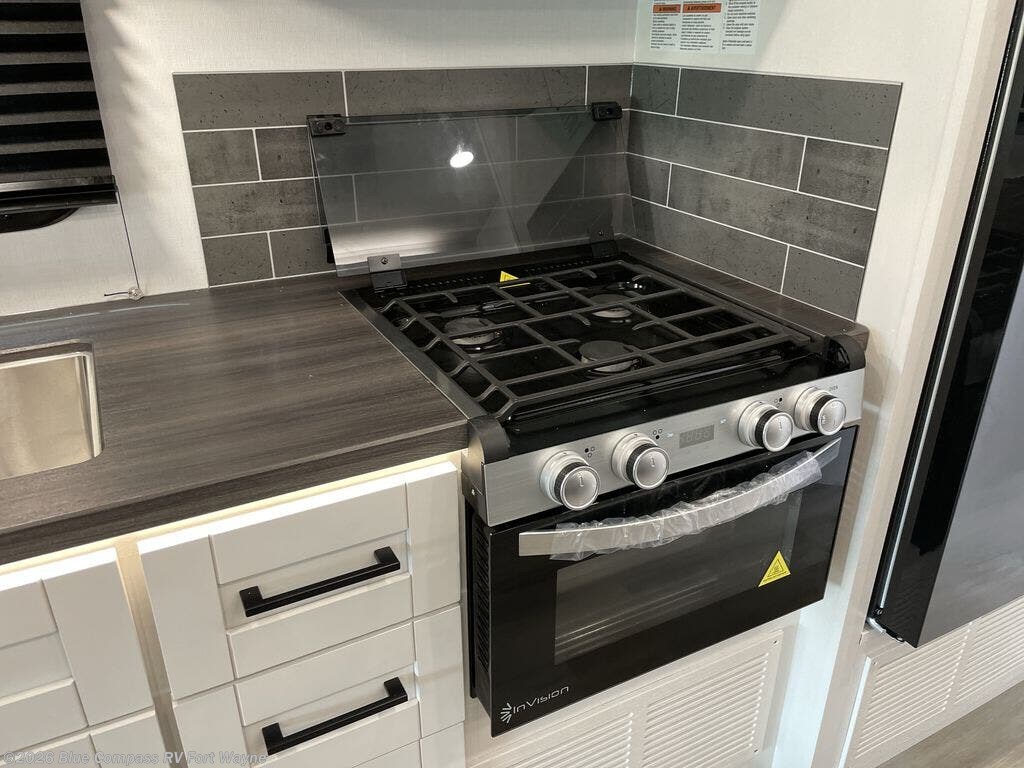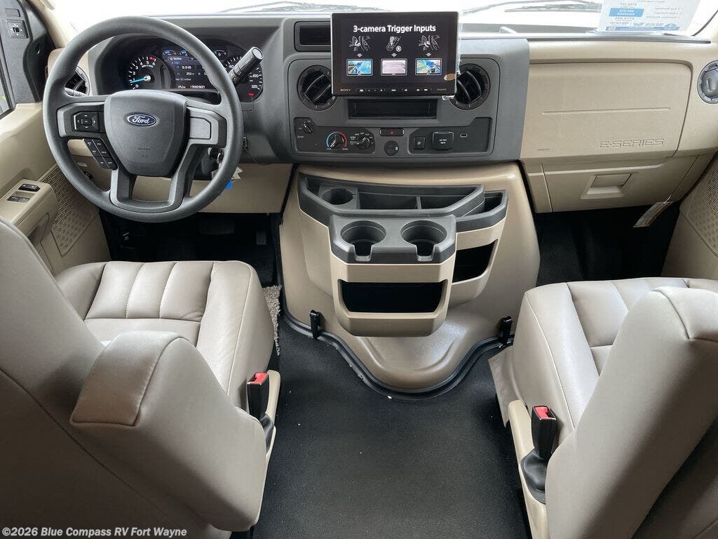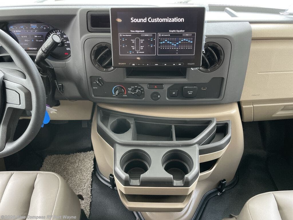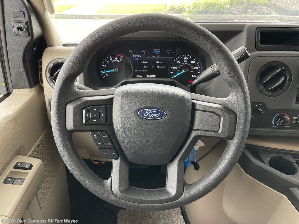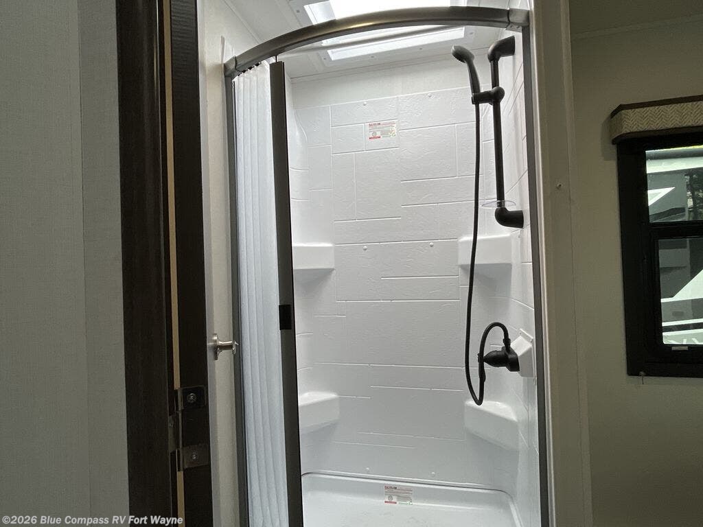 Explore new places as you travel in this coach with the comforts of home and the conveniences you are accustom to. In the rear bedroom, you will appreciate privacy when you close the divider to enjoy the walk-around queen bed with storage for your clothes. There is a private toilet and sink with the shower right across the hall so two people can freshen up at once. The chef will love the galley kitchen which is spacious thanks to the furniture slide out. The Furrion all-in-one cooktop along with the residential-size microwave, plus the 10 cu. ft. refrigerator will give the cook everything for warm meals for two or more. The driver and passenger seats swivel to become a part of the living area seating, and the cab-over bunk her will be a big plus for the little ones. You can also choose the optional theater seating in place of the sofa if you're not needing the additional sleeping space.