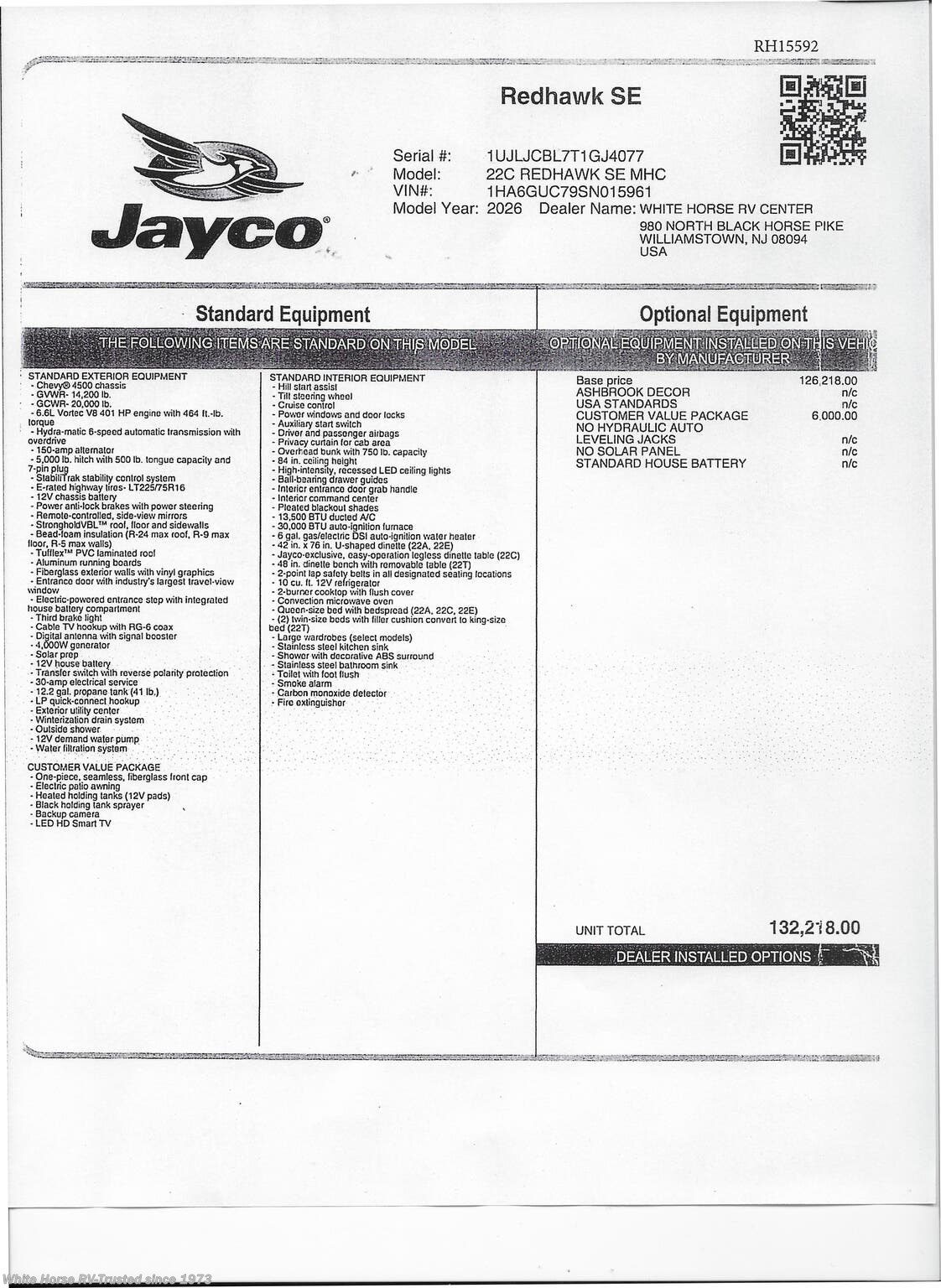 Customer Value Package: One-piece, seamless, fiberglass front cap; Heated holding tanks (12V pads); Electric patio awning; Black holding tank sprayer; Backup camera and LED HD Smart TV,... all backed by Jayco’s 2+3 year warranty! MSRP $132,218.00.