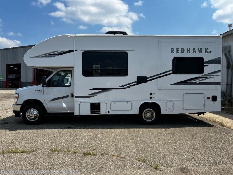 Experience easy living in any one of these Jayco Redhawk SE Class C gas motorhomes! They are built with a Stronghold VBL lamination which is the lightest and strongest construction in the RV industry. The one-piece seamless front cap which helps to resist wear and tear, the Ford E-350 chassis, and the 7.3L V8 325 HP engine shows these units are built to last for years to come. The mandatory Customer Value package includes an electric patio awning to protect you rain or shine, an LED HD Smart TV, and a backup camera to make parking and maneuvering easier. You will also love your options that include automatic hydraulic leveling jacks and an optional 200W solar panel with a dual controller and second house battery for off-grid capabilities!