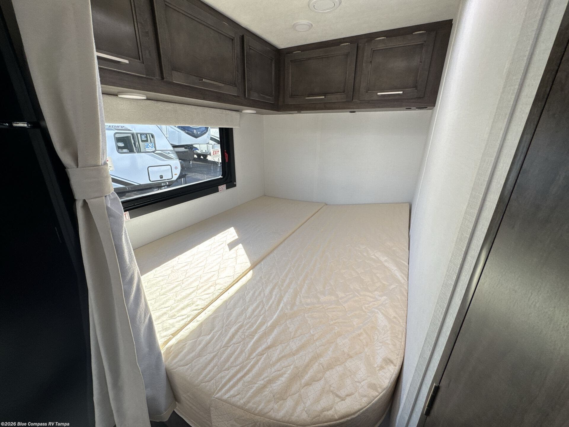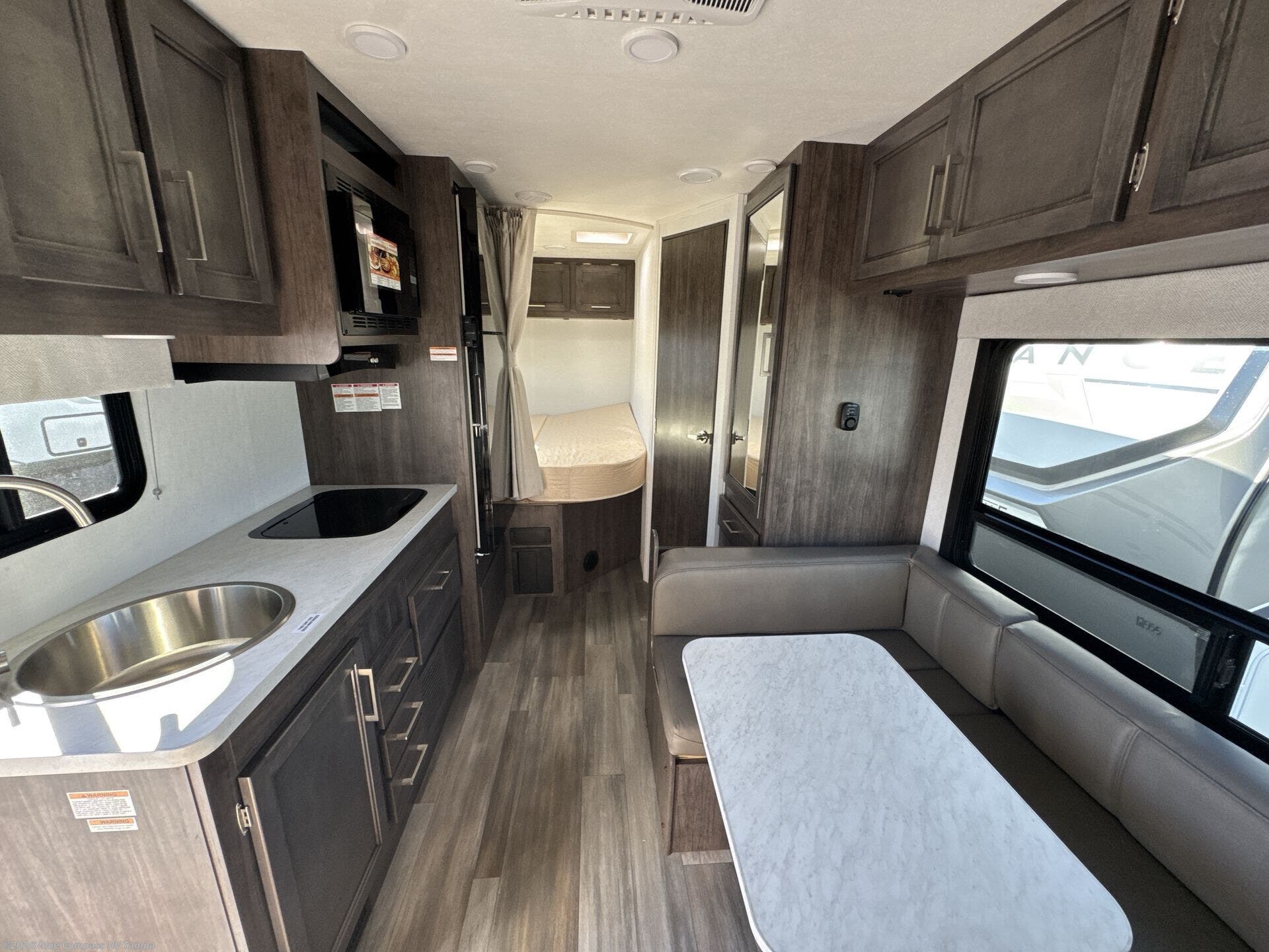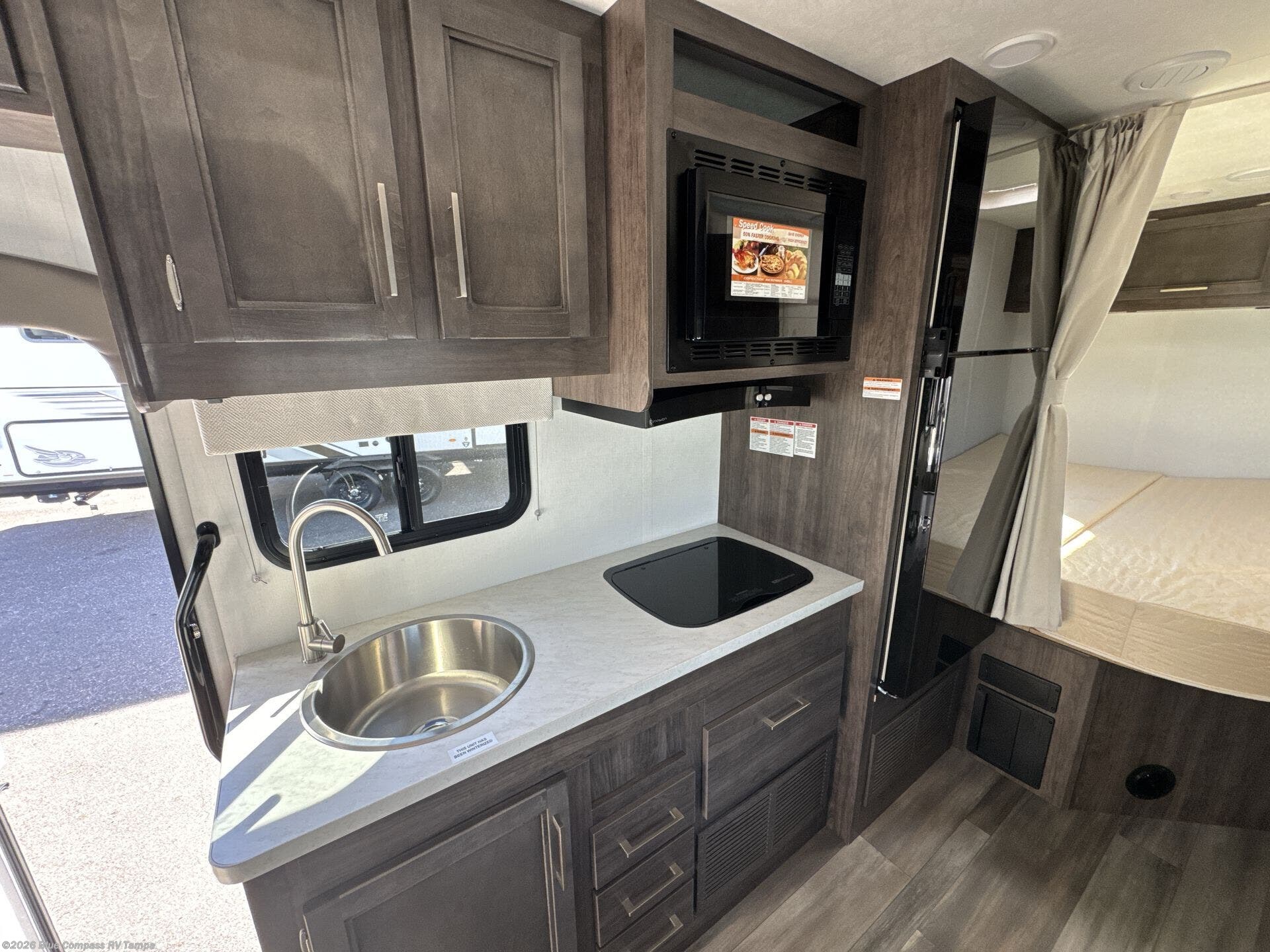 This coach will feel just like home with its fixed RV queen bed, full bath, and additional sleeping space on the dinette and cab-over bunk! The two burner cooktop with a flush cover and the convection microwave will let you create your best meals, and you can take your plate outdoors to sit under the 16' power awning if the weather is nice! There are also multiple overhead cabinets to keep your things organized, along with a wardrobe!