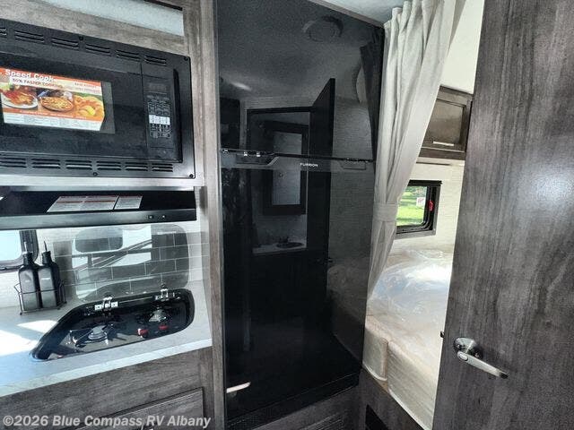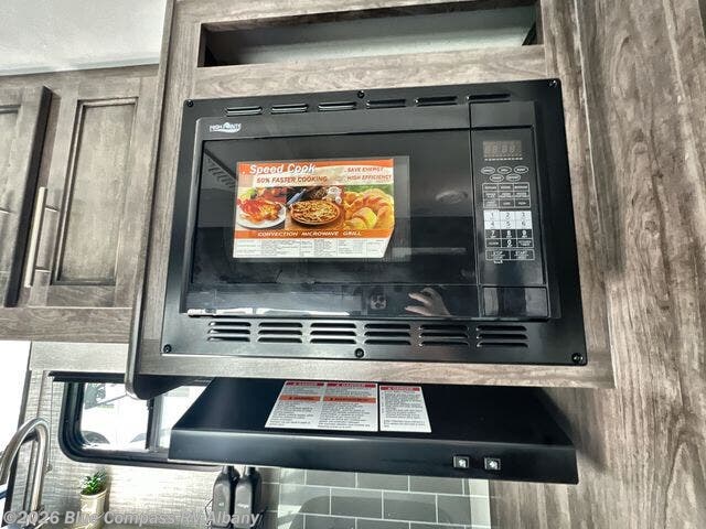 This coach will feel just like home with its fixed RV queen bed, full bath, and additional sleeping space on the dinette and cab-over bunk! The two burner cooktop with a flush cover and the convection microwave will let you create your best meals, and you can take your plate outdoors to sit under the 16' power awning if the weather is nice! There are also multiple overhead cabinets to keep your things organized, along with a wardrobe!