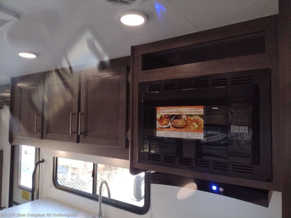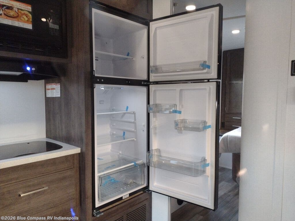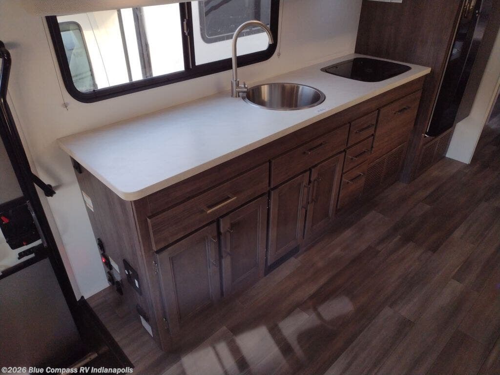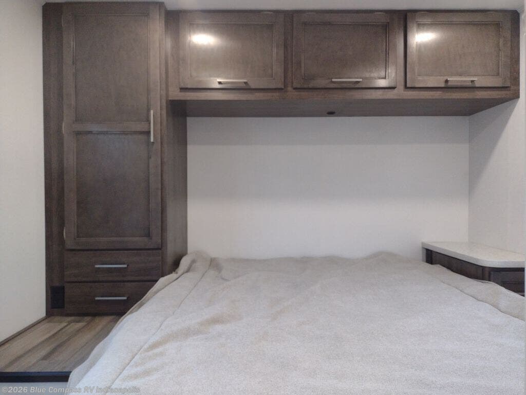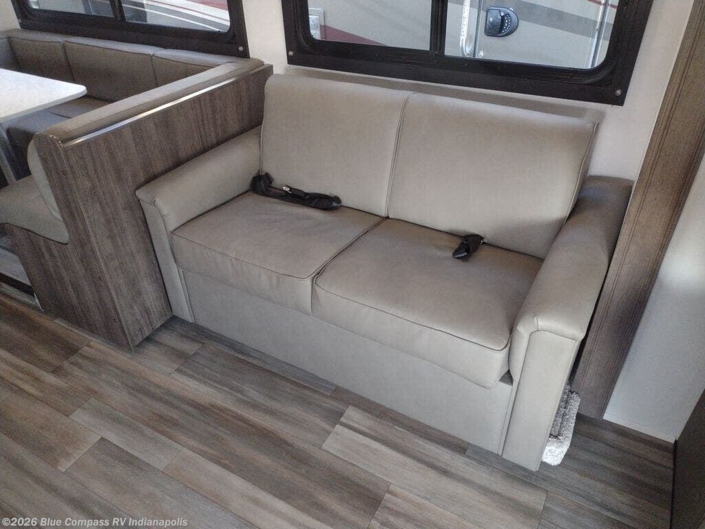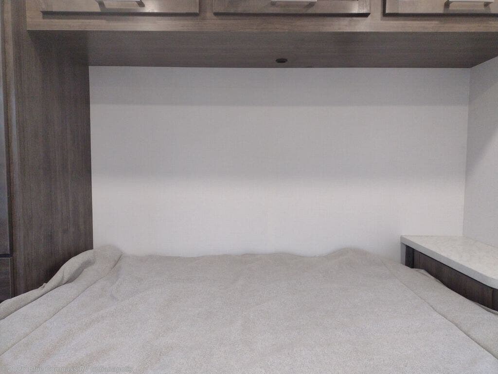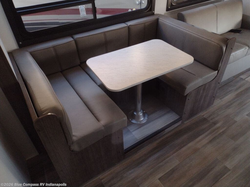 As you step inside, you’re greeted by a cozy cab-over bunk, perfect for accommodating an extra guest in comfort. The slide-out provides ample living space and houses a 42" x 74" U-dinette, ideal for enjoying meals, playing board games, or simply gathering with friends and family. Also, in the slide-out is a 60" jack-knife sofa, offering a comfortable place to relax, and both the dinette and sofa can easily convert into additional sleeping space if needed. Across from the living area, the well-equipped kitchen includes a stainless-steel sink, a convection microwave oven, a two-burner cooktop with flush cover, and a 10-cu. ft. refrigerator, giving you everything you need to cook with ease while on the road. The bathroom provides a 24" x 36" shower and a foot-flush toilet for added convenience. At the rear, the private bedroom offers a 60" x 74" queen bed for restful sleep, along with a wardrobe and overhead cabinets to keep your clothing and essentials neatly organized.