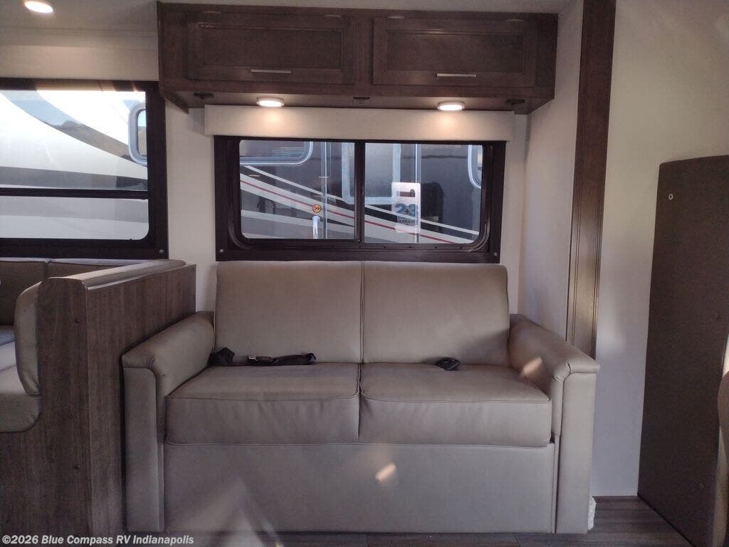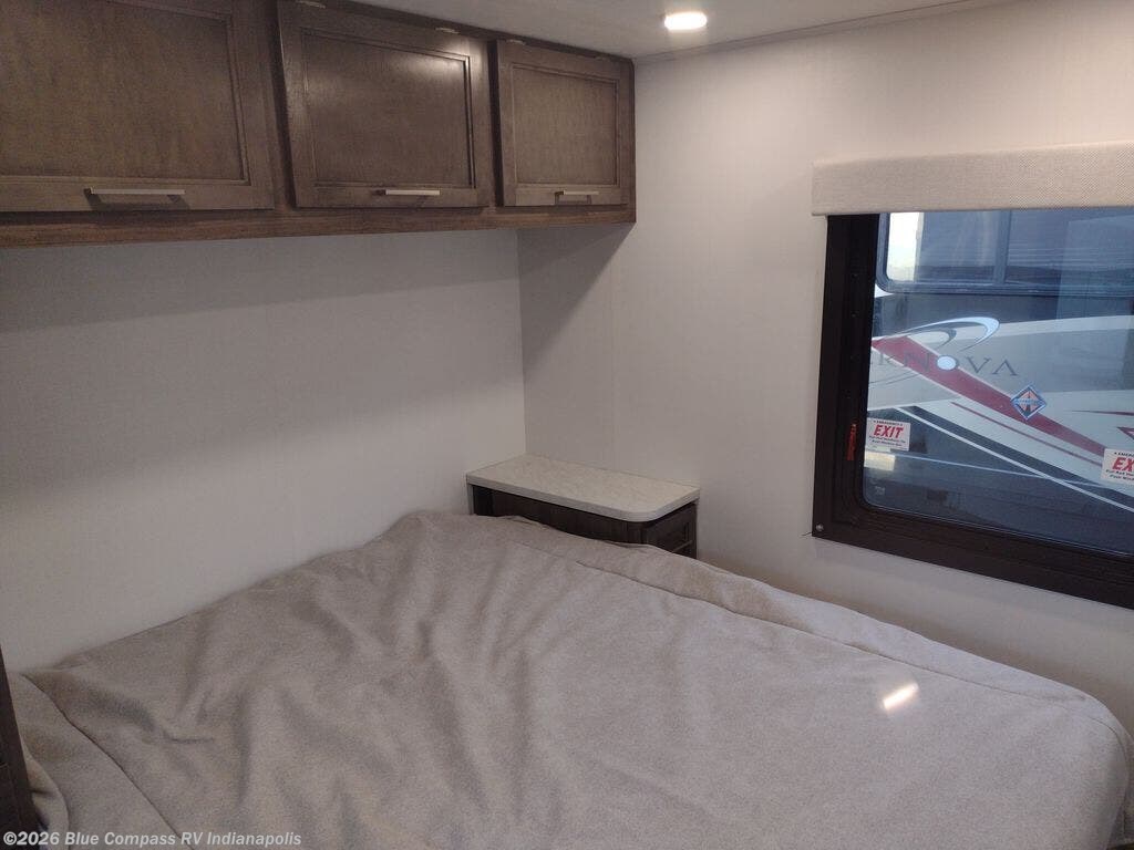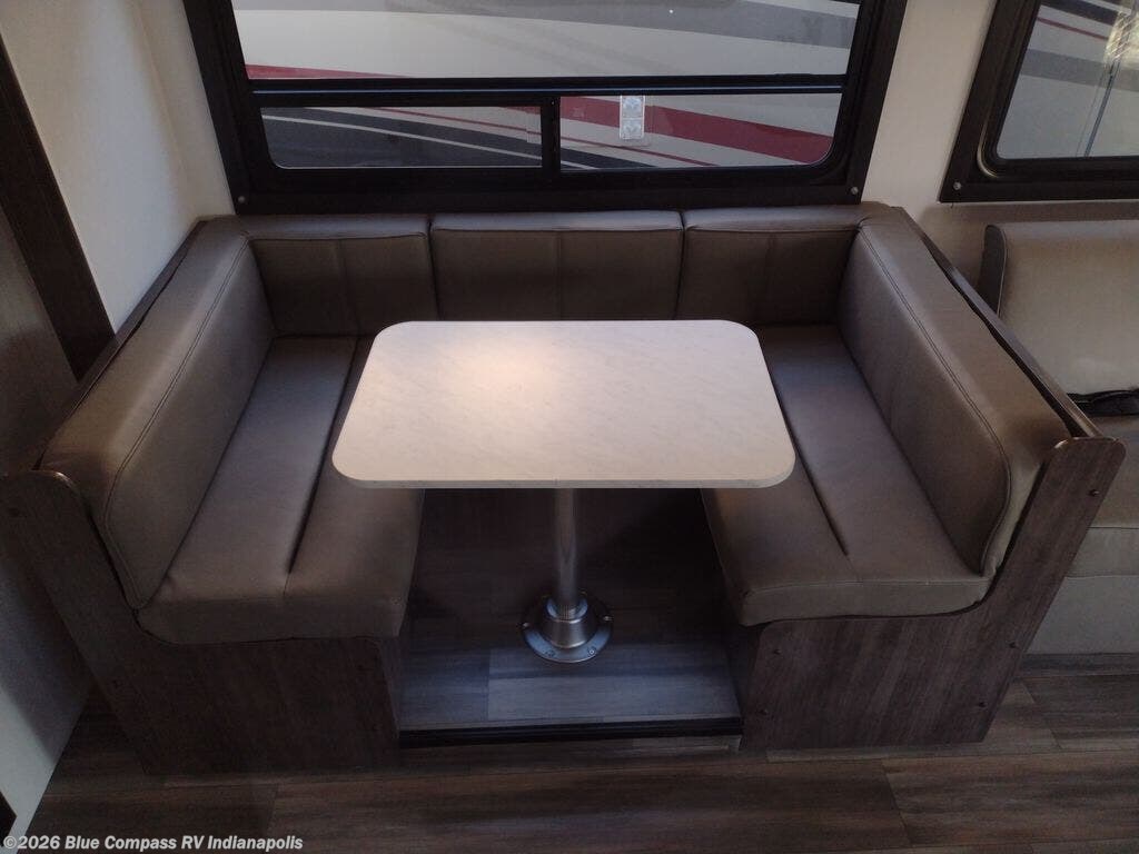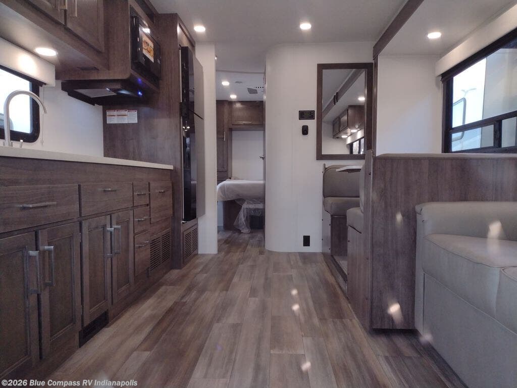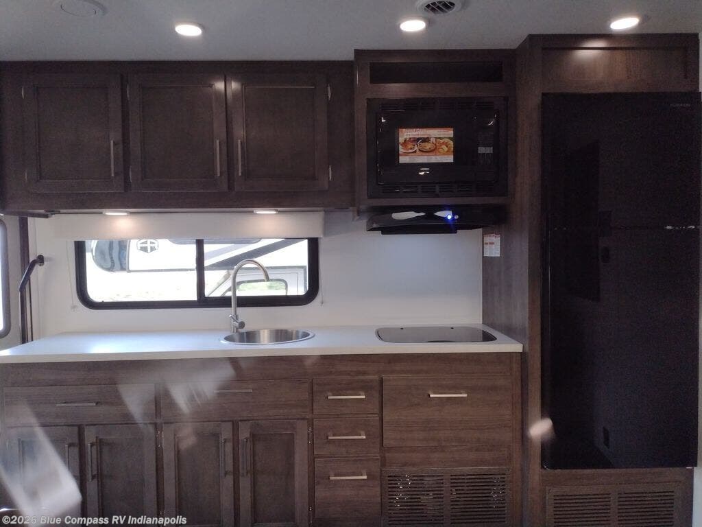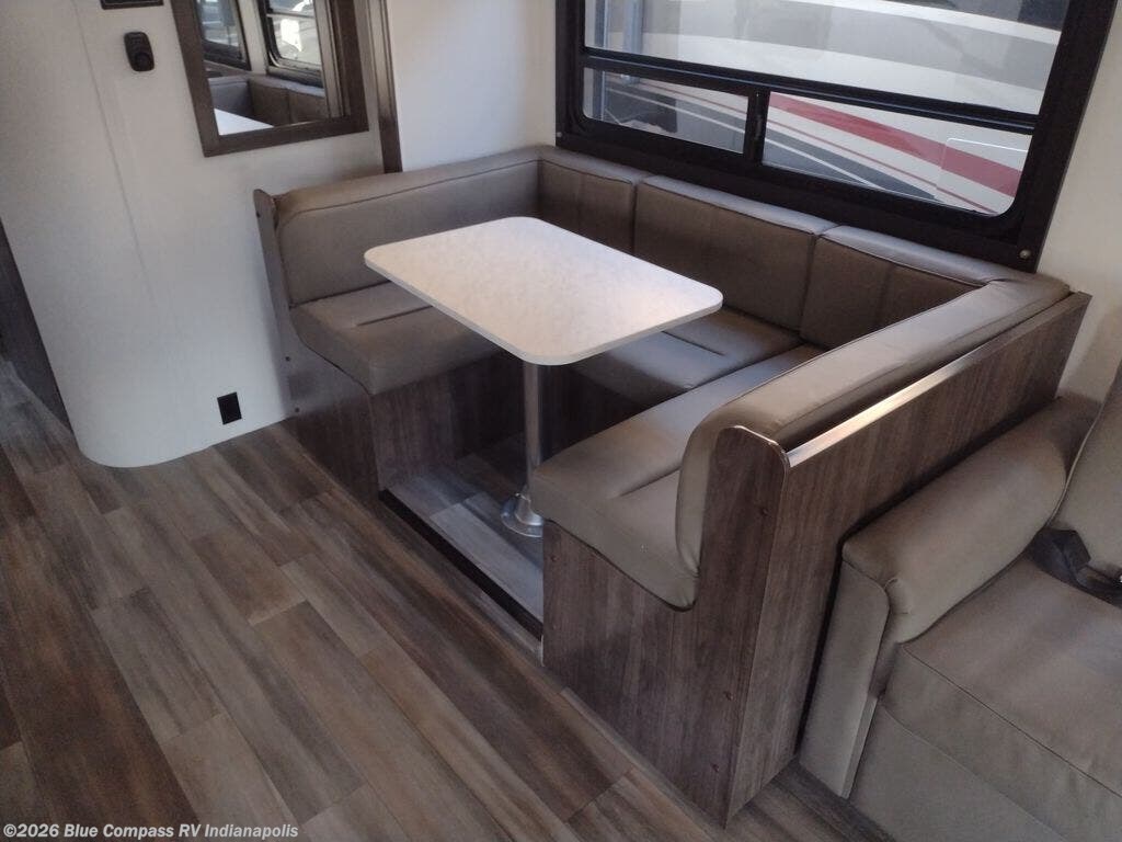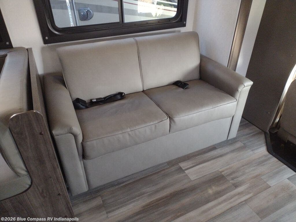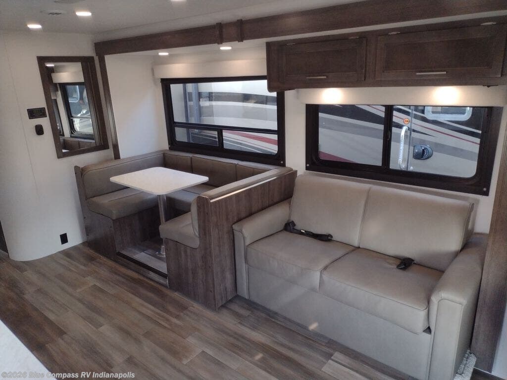 As you step inside, you’re greeted by a cozy cab-over bunk, perfect for accommodating an extra guest in comfort. The slide-out provides ample living space and houses a 42" x 74" U-dinette, ideal for enjoying meals, playing board games, or simply gathering with friends and family. Also, in the slide-out is a 60" jack-knife sofa, offering a comfortable place to relax, and both the dinette and sofa can easily convert into additional sleeping space if needed. Across from the living area, the well-equipped kitchen includes a stainless-steel sink, a convection microwave oven, a two-burner cooktop with flush cover, and a 10-cu. ft. refrigerator, giving you everything you need to cook with ease while on the road. The bathroom provides a 24" x 36" shower and a foot-flush toilet for added convenience. At the rear, the private bedroom offers a 60" x 74" queen bed for restful sleep, along with a wardrobe and overhead cabinets to keep your clothing and essentials neatly organized.