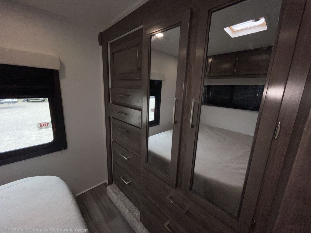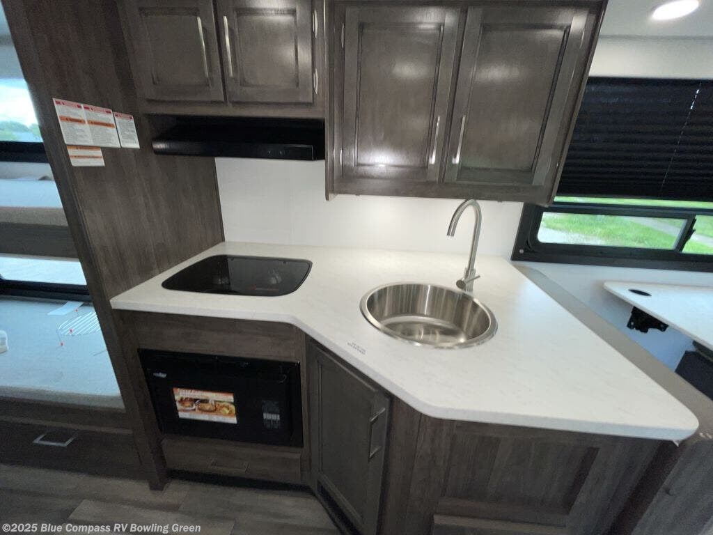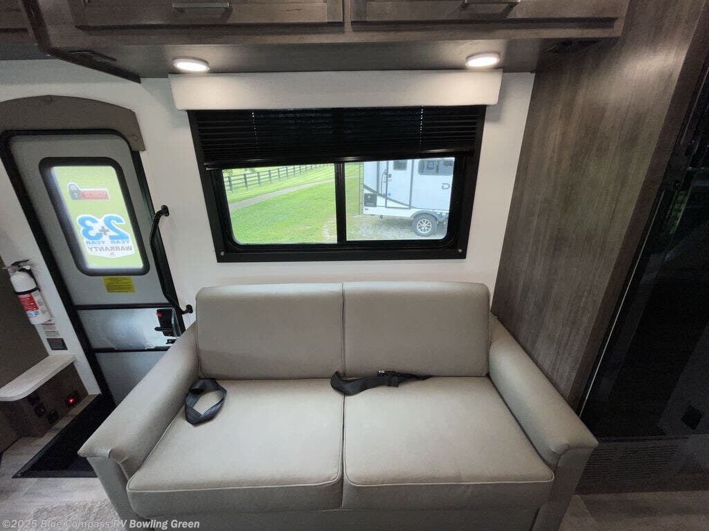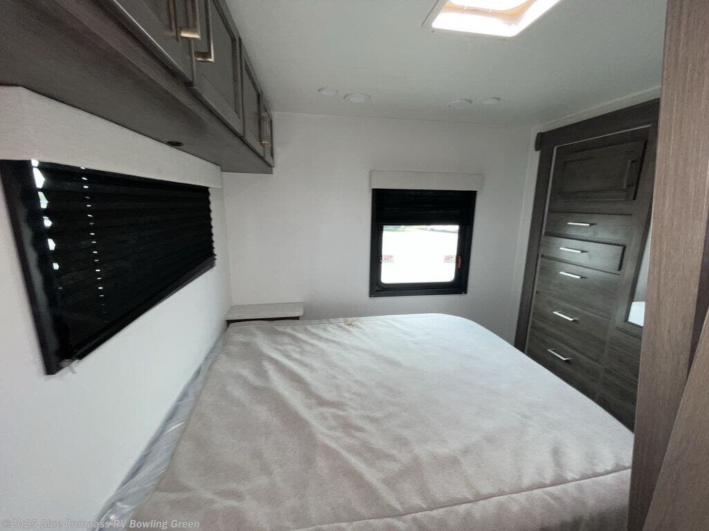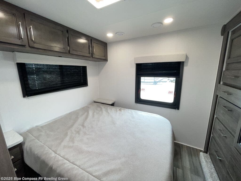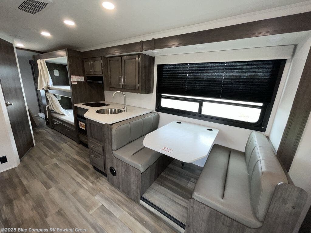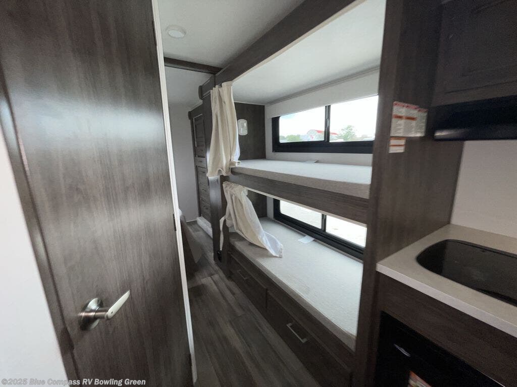 This coach will be perfect if you enjoy traveling with a larger group. Between the cab-over bunk and bunk beds, plus the RV queen bed and living area furniture, you can comfortably sleep eight! You can prepare meals for your crew on the two burner cooktop or in the convection microwave, and there is a 10 cu. ft. 12V refrigerator plus a pantry for food storage. The bunk beds are across from the dual entry bath for easy nighttime use, and you'll appreciate the rear private bedroom all to yourselves. Along with the RV queen bed, there is a wardrobe and drawers to keep shoes, clothes and more stored away!