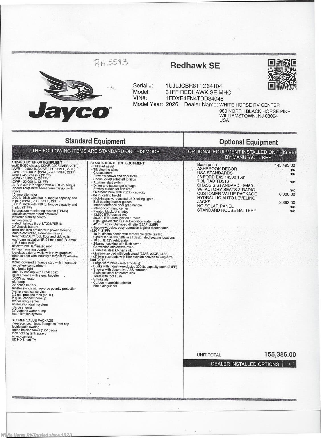 RH15593 also has the factory option: Hydraulic Auto Leveling Jacks,... all backed by Jayco’s 2+3 year warranty! MSRP $155,386.00.