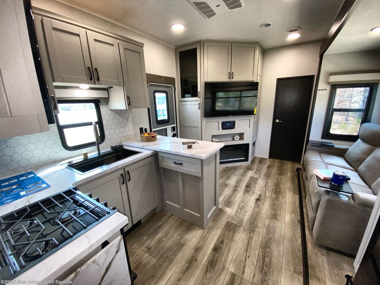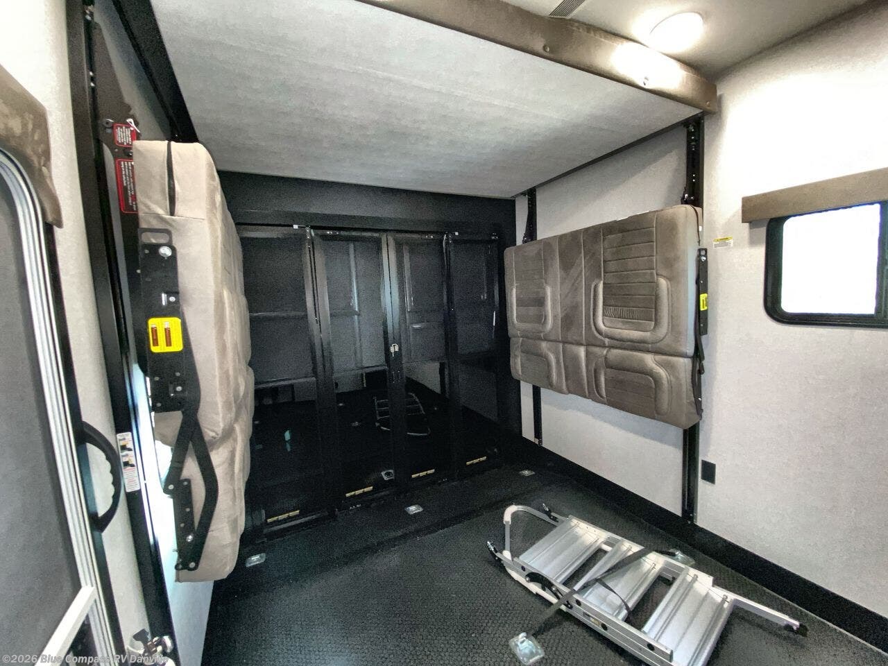 Get ready for outdoor adventures in this spacious toy hauler. Your guests will have the 11' separate garage area with its own half bath, a queen bed with rear convertible sofas, plus an overhead storage area for their things. The main living area includes a large slide out for added space, and here you can relax on the sofa that sits across from the entertainment center and fireplace. The chef will love the U-shaped kitchen counter, 17 cu. ft. 12V refrigerator, and residential oven with a three-burner cooktop. You will feel right at home in the front private bedroom with its slide out wardrobe and Olympic queen bed for all-around comfort.