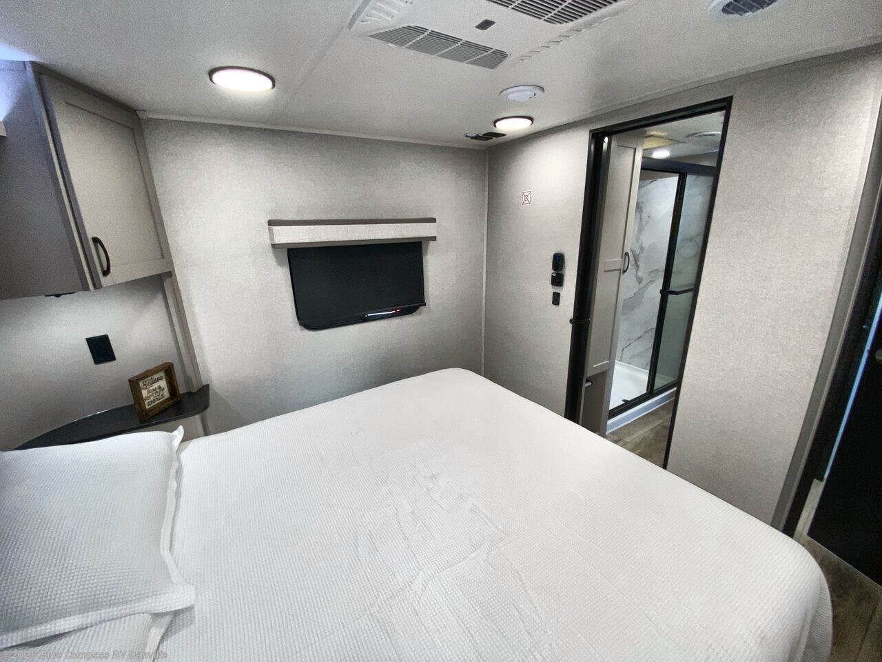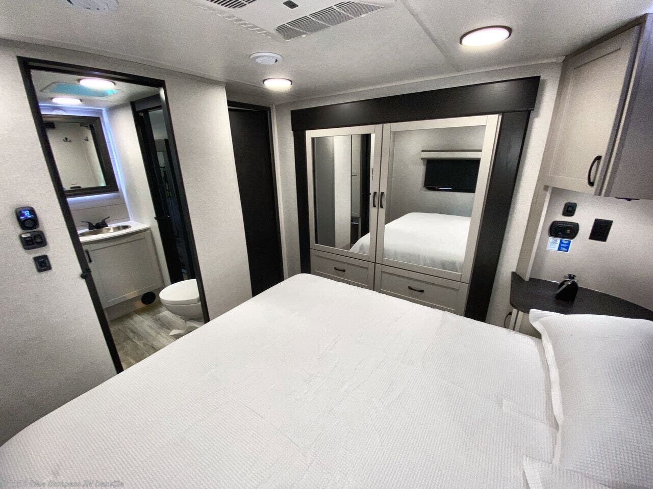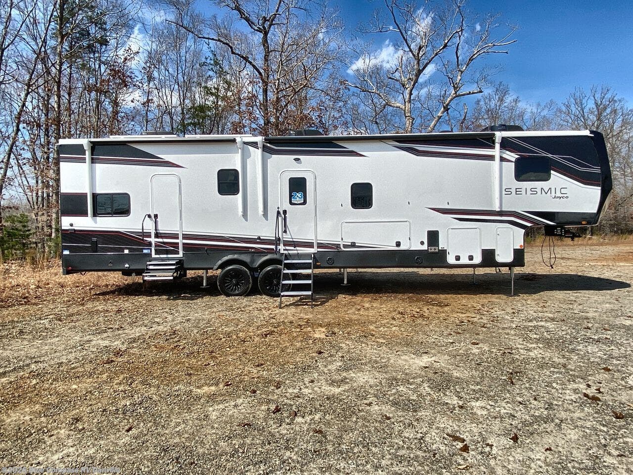 One look at the Seismic toy hauler fifth wheels by Jayco, and you'll never go back! Each model features a custom automotive-grade vinyl exterior graphics package, a painted fiberglass front cap with built-in LED lighting, and 102" wide-body structural steel I-beam construction. You'll find the pass-through storage with Slam-Latch baggage doors will make unpacking easier than ever, and the rear ramp door/patio with anti-slip, non-skid flooring will allow you to unload your toys with no trouble at all. These toy haulers feature a three-season garage wall/doors, a 30-gallon fuel tank with a timer, and exterior marine-grade speakers to keep the party going. The Climate Shield zero degree tested weather protection includes a 35,000 BTU furnace and a fully enclosed and heated underbelly for better protection against the elements. And we haven't even touched on the interior luxuries you'll find, like solid hardwood cabinet doors, residential vinyl flooring made in the USA, night roller shades, and more!