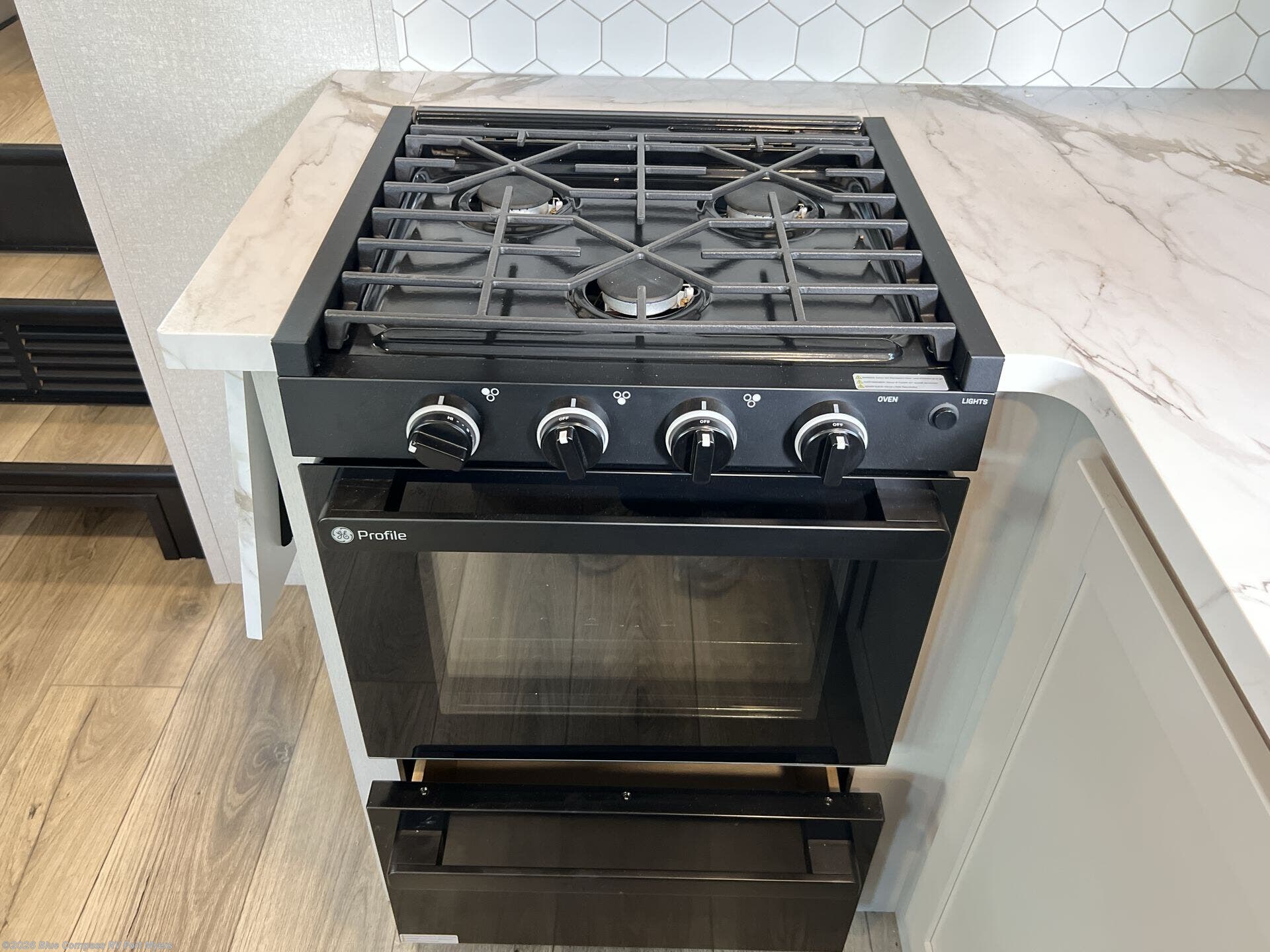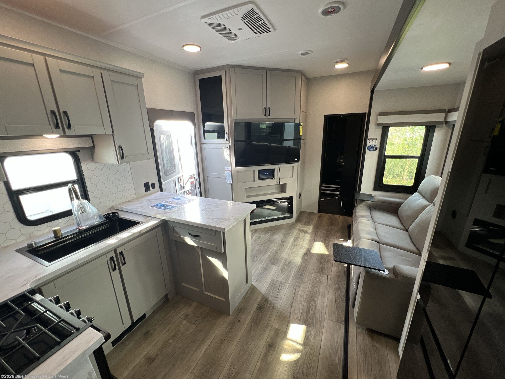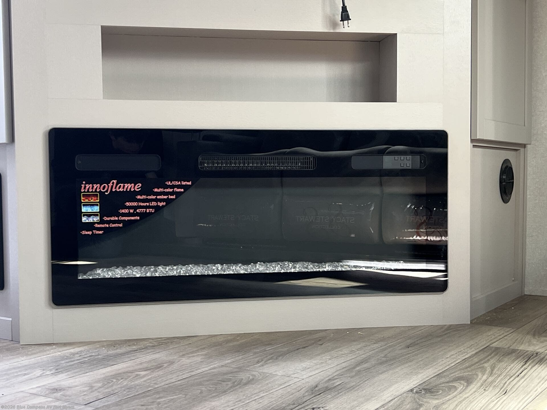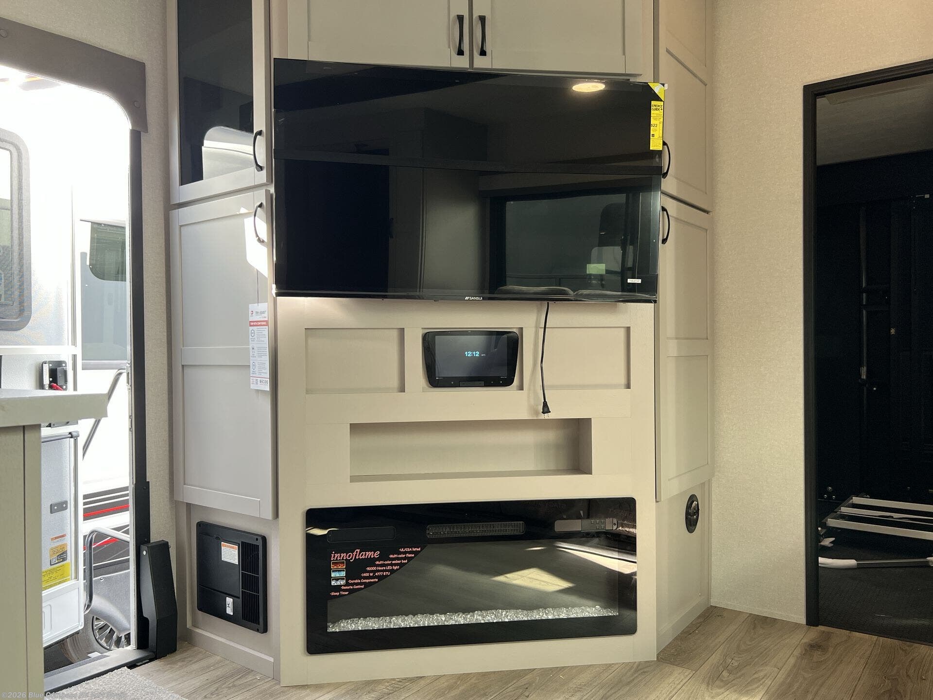 Get ready for outdoor adventures in this spacious toy hauler. Your guests will have the 11' separate garage area with its own half bath, a queen bed with rear convertible sofas, plus an overhead storage area for their things. The main living area includes a large slide out for added space, and here you can relax on the sofa that sits across from the entertainment center and fireplace. The chef will love the U-shaped kitchen counter, 17 cu. ft. 12V refrigerator, and residential oven with a three-burner cooktop. You will feel right at home in the front private bedroom with its slide out wardrobe and Olympic queen bed for all-around comfort.