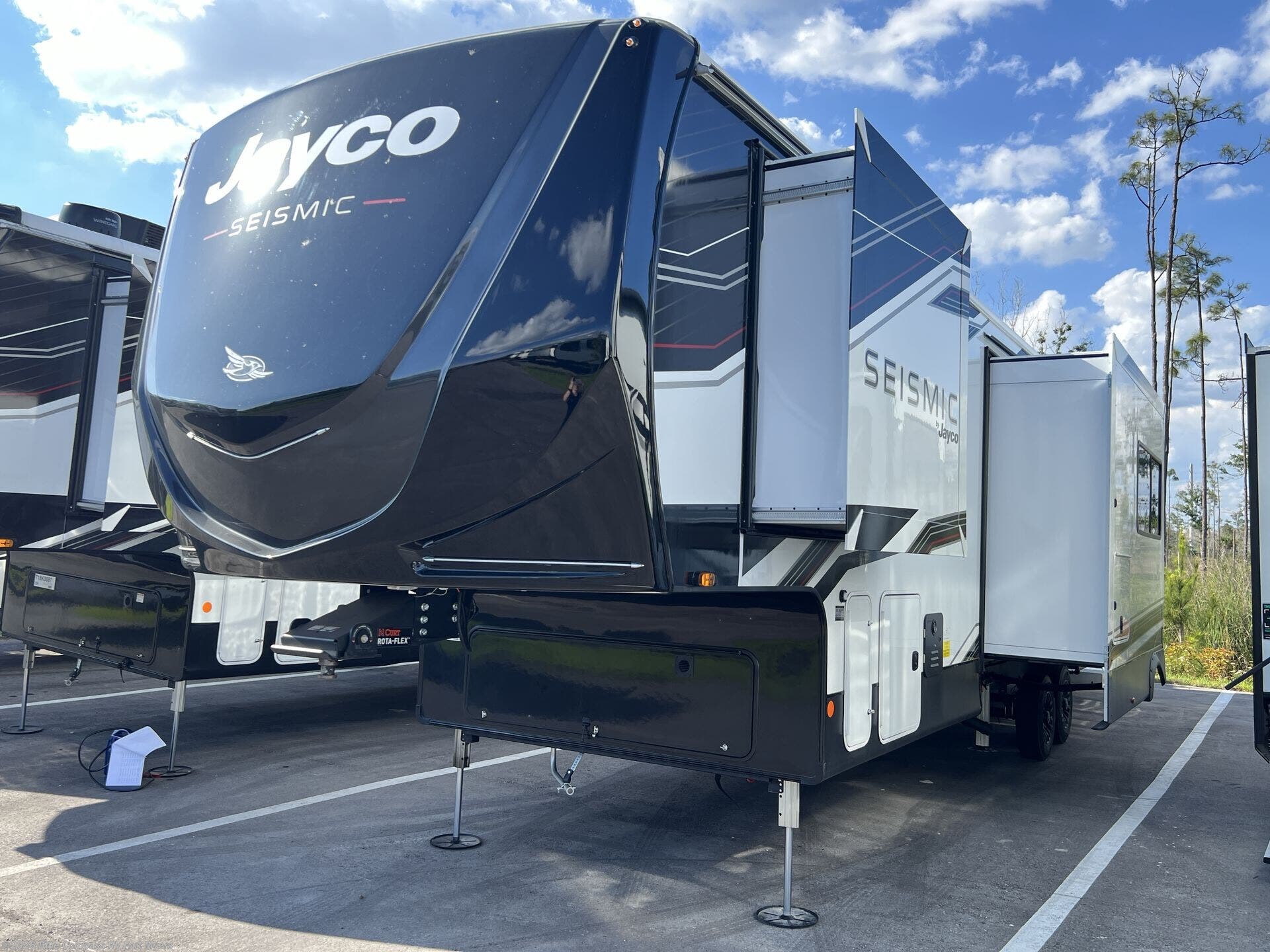 One look at the Seismic toy hauler fifth wheels by Jayco, and you'll never go back! Each model features a custom automotive-grade vinyl exterior graphics package, a painted fiberglass front cap with built-in LED lighting, and 102" wide-body structural steel I-beam construction. You'll find the pass-through storage with Slam-Latch baggage doors will make unpacking easier than ever, and the rear ramp door/patio with anti-slip, non-skid flooring will allow you to unload your toys with no trouble at all. These toy haulers feature a three-season garage wall/doors, a 30-gallon fuel tank with a timer, and exterior marine-grade speakers to keep the party going. The Climate Shield zero degree tested weather protection includes a 35,000 BTU furnace and a fully enclosed and heated underbelly for better protection against the elements. And we haven't even touched on the interior luxuries you'll find, like solid hardwood cabinet doors, residential vinyl flooring made in the USA, night roller shades, and more!