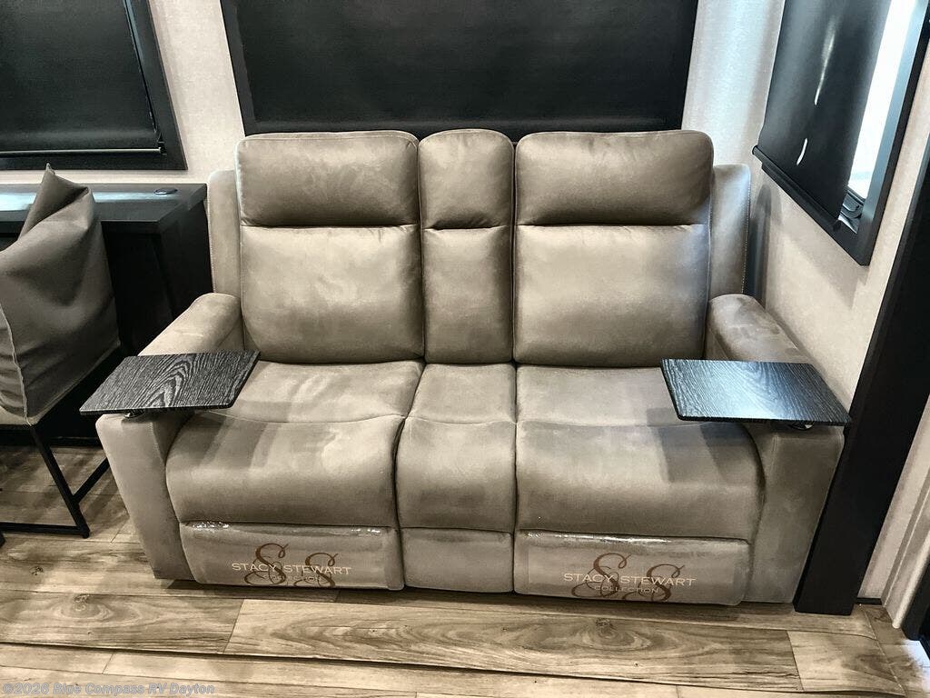 Take your outdoor adventures up a notch with this Seismic toy hauler. You can take the whole gang along for some fun with triple slides and dual entry for easy access going in and out. Your friends will sleep comfortably on the convertible sofas with overhead queen bed above in the 14' cargo garage space. There is also a storage space/loft above for their things and additional sleeping if needed. Inside, a full bath can be shared by all to get cleaned up each day, and all can gather inside in the spacious living area featuring dual opposing slides. Theater seating and an L-shaped tri-fold sofa create plenty of space for lounging. There is also a dining table for four inside and the second table in the garage area allows for more seating during meals inside when the weather isn't that nice. Two side awnings provide protection from the elements, along with a rear awning, and the rear ramp party deck with steps create even more outdoor living space to enjoy!