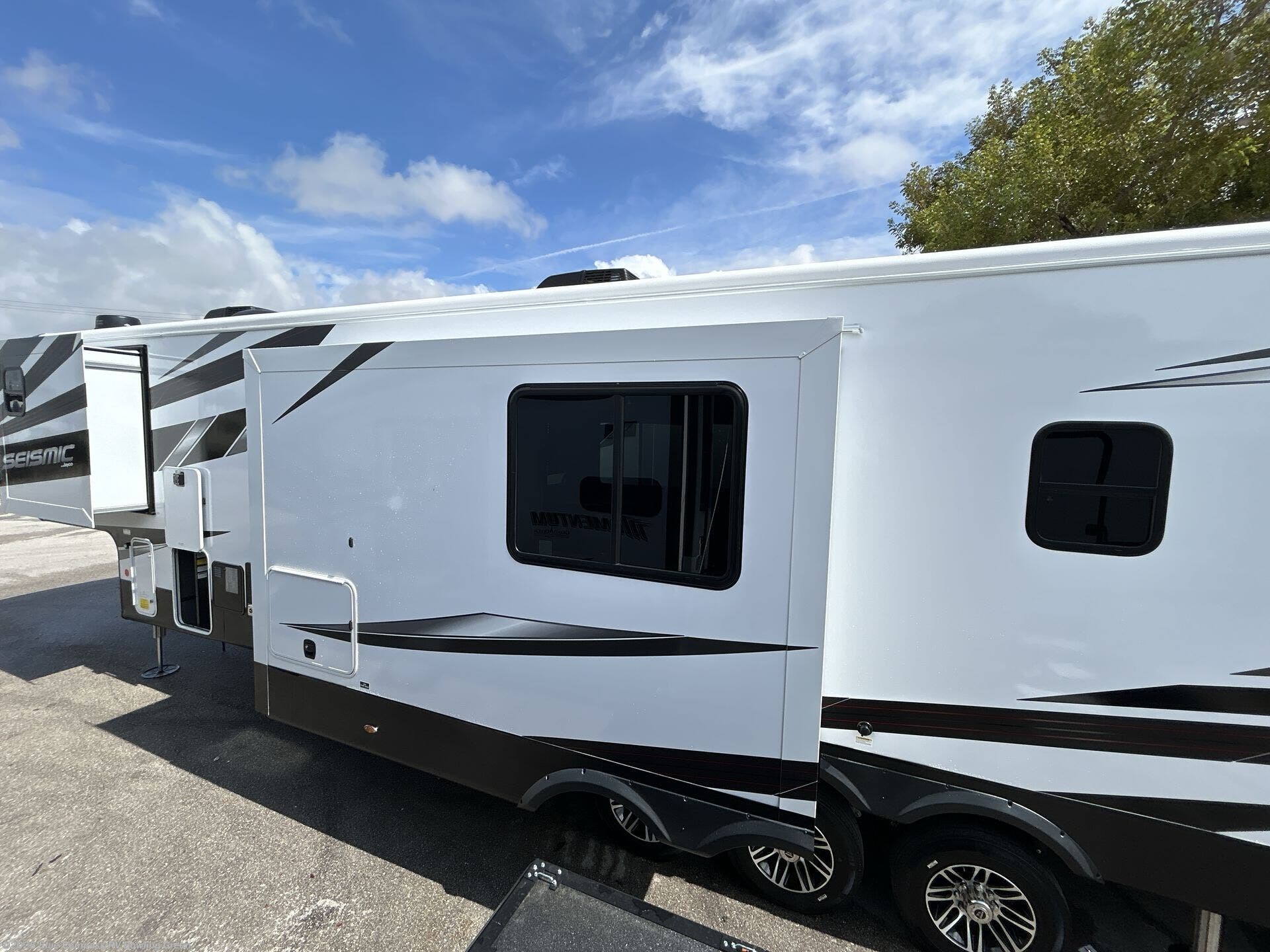 Take your outdoor adventures up a notch with this Seismic toy hauler. You can take the whole gang along for some fun with triple slides and dual entry for easy access going in and out. Your friends will sleep comfortably on the convertible sofas with overhead queen bed above in the 14' cargo garage space. There is also a storage space/loft above for their things and additional sleeping if needed. Inside, a full bath can be shared by all to get cleaned up each day, and all can gather inside in the spacious living area featuring dual opposing slides. Theater seating and an L-shaped tri-fold sofa create plenty of space for lounging. There is also a dining table for four inside and the second table in the garage area allows for more seating during meals inside when the weather isn't that nice. Two side awnings provide protection from the elements, along with a rear awning, and the rear ramp party deck with steps create even more outdoor living space to enjoy!