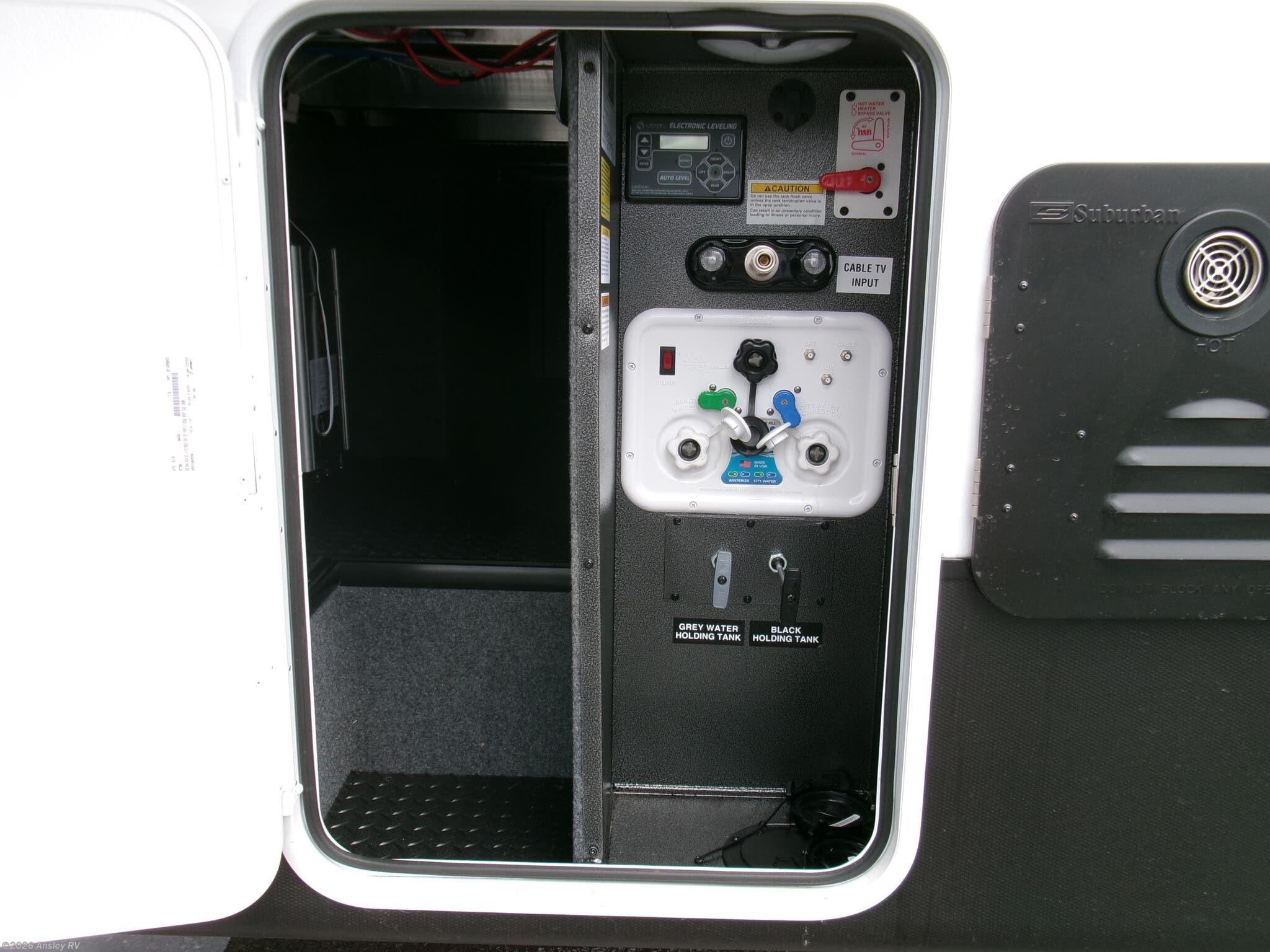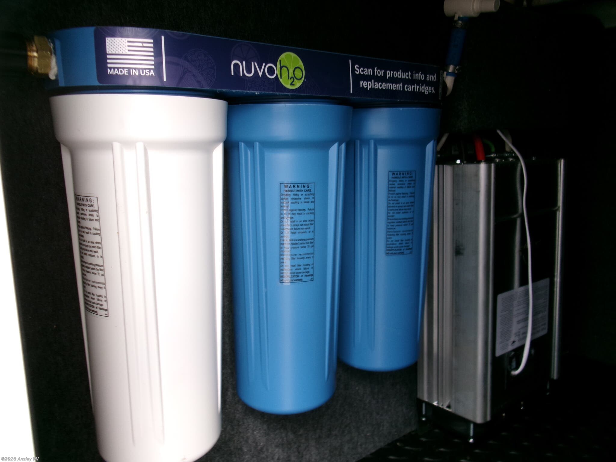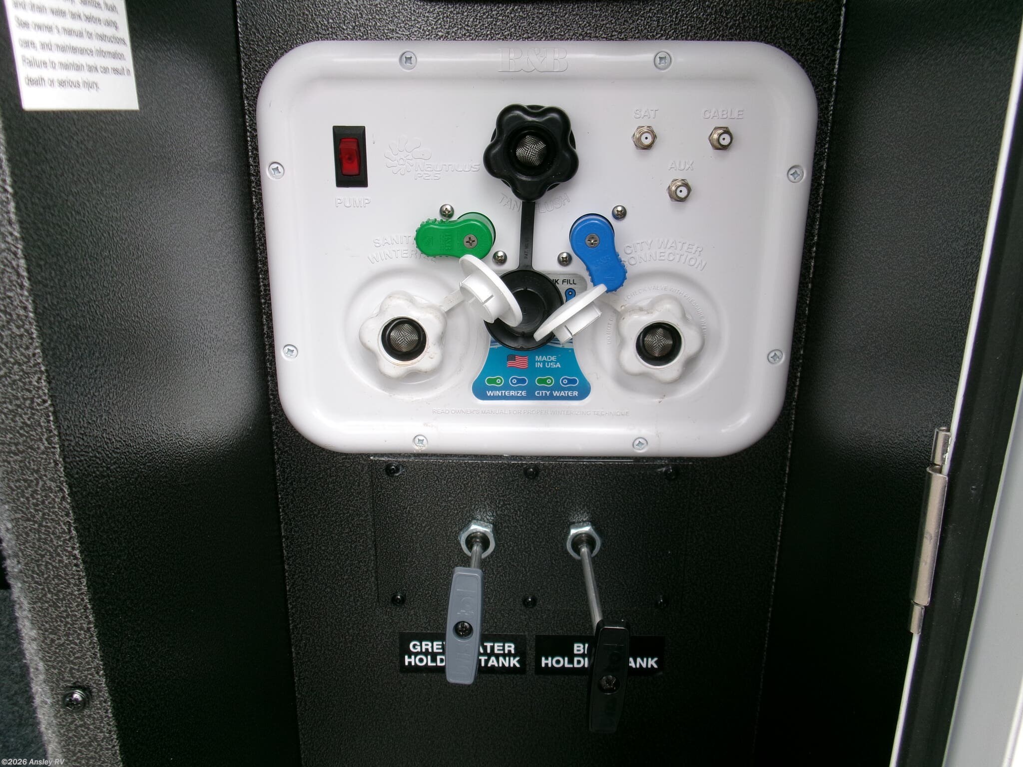- A comprehensive water system with 106 gallons of fresh water capacity, and 87 gallons each for black and grey water tanks
