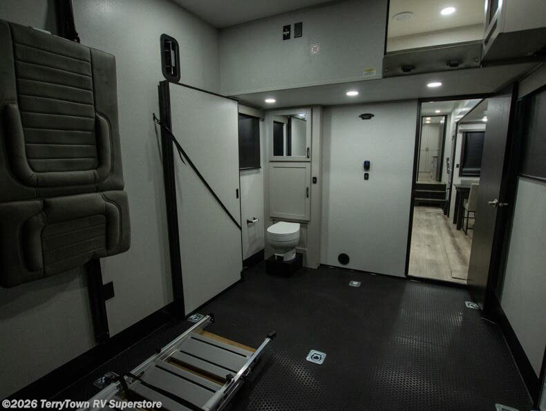 Get ready for outdoor adventures in this spacious toy hauler. Your guests will have the 13' 6" garage with queen bed with convertible sofa and a loft for added sleeping space, plus there is overhead storage for your things and a side man door to come and go easily. The main living area includes dual opposing slides with an L-shaped tri-fold sofa along the roadside and your dinette and refrigerator plus pantry in the curbside slide. Head up the steps to your front private bedroom with the dual entry bath accessible from the hall and inside the master bedroom. Here you will all enjoy a walk-in shower, toilet, and vanity with a sink, plus overhead storage. The bedroom features a third slide out housing a queen bed for added floor space, plus a full front walk-in closet, a dresser, and washer/dryer prep!