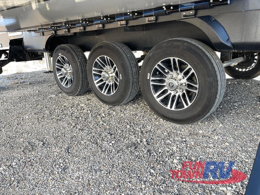 Get ready for outdoor adventures in this spacious toy hauler. Your guests will have the 13' 6" garage with queen bed with convertible sofa and a loft for added sleeping space, plus there is overhead storage for your things and a side man door to come and go easily. The main living area includes dual opposing slides with an L-shaped tri-fold sofa along the roadside and your dinette and refrigerator plus pantry in the curbside slide. Head up the steps to your front private bedroom with the dual entry bath accessible from the hall and inside the master bedroom. Here you will all enjoy a walk-in shower, toilet, and vanity with a sink, plus overhead storage. The bedroom features a third slide out housing a queen bed for added floor space, plus a full front walk-in closet, a dresser, and washer/dryer prep!
