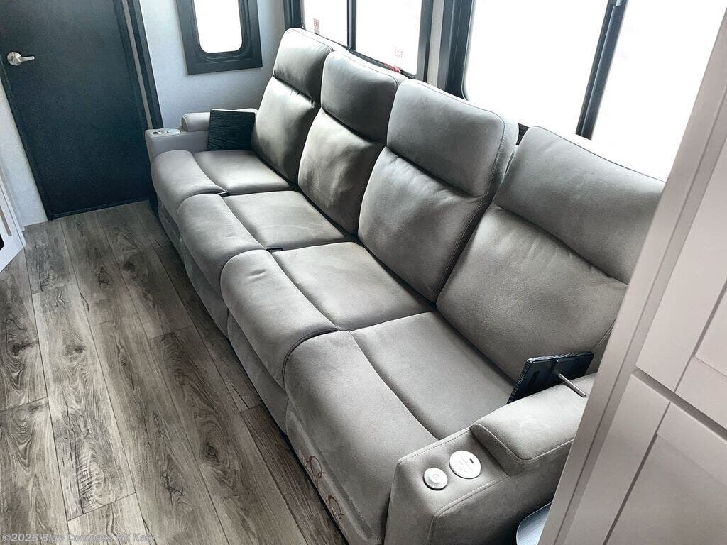 Get ready for outdoor adventures in this spacious toy hauler. Your guests will have the 13' separate garage area with its own half bath, a queen bed with rear convertible sofas, plus a loft for more sleeping or storage space. The main living area includes a large slide out for added space, and here you can relax on the sofa that sits across from the entertainment center with a 50" TV. The chef will love the U-shaped kitchen counter, 17 cu. ft. 12V refrigerator, and residential oven with a three burner cooktop. Up front, the private bedroom includes a king bed with a queen bed option, a slide out with dual wardrobes and a dresser, and quick access to the dual entry full bath! The exterior is just as accommodating with its 40" exterior TV, rear party deck and side patio party deck, and triple awnings for ample protection against the sun!