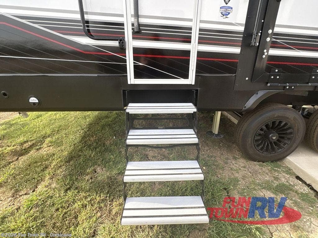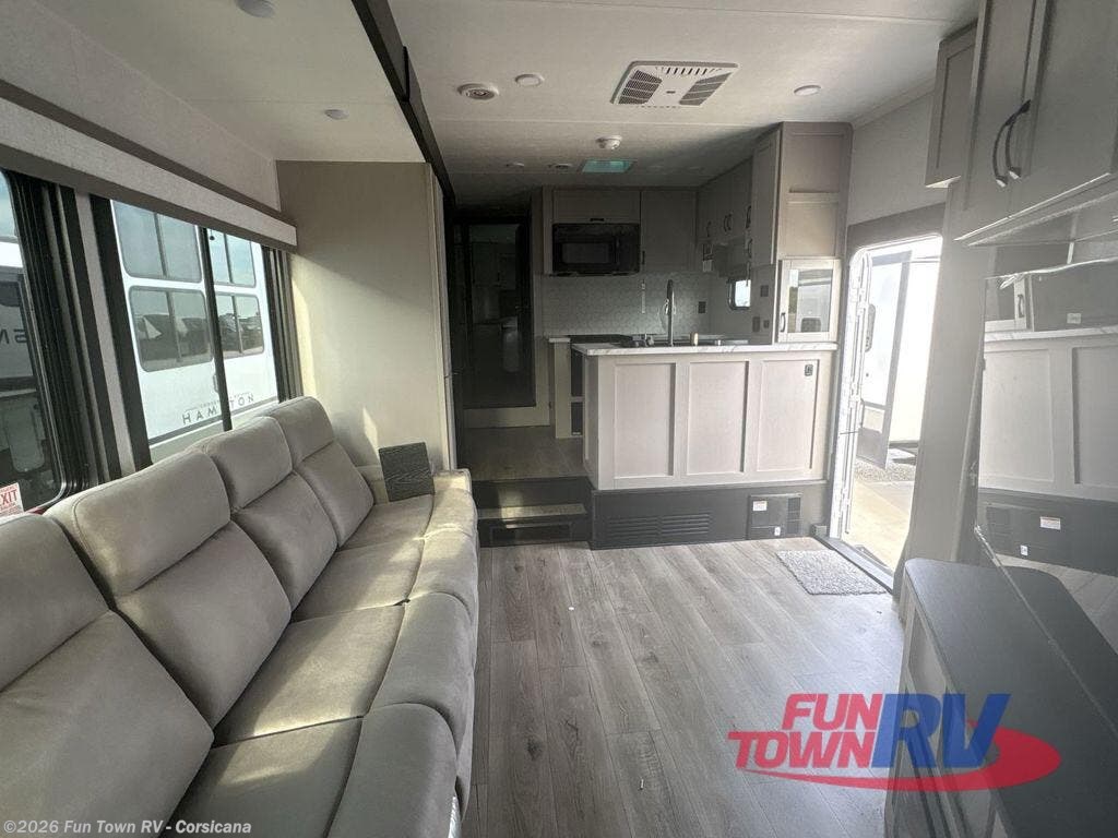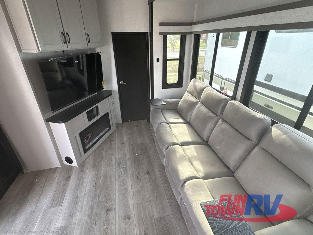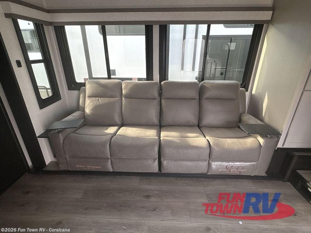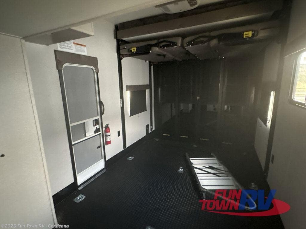 Get ready for outdoor adventures in this spacious toy hauler. Your guests will have the 13' separate garage area with its own half bath, a queen bed with rear convertible sofas, plus a loft for more sleeping or storage space. The main living area includes a large slide out for added space, and here you can relax on the sofa that sits across from the entertainment center with a 50" TV. The chef will love the U-shaped kitchen counter, 17 cu. ft. 12V refrigerator, and residential oven with a three burner cooktop. Up front, the private bedroom includes a king bed with a queen bed option, a slide out with dual wardrobes and a dresser, and quick access to the dual entry full bath! The exterior is just as accommodating with its 40" exterior TV, rear party deck and side patio party deck, and triple awnings for ample protection against the sun!