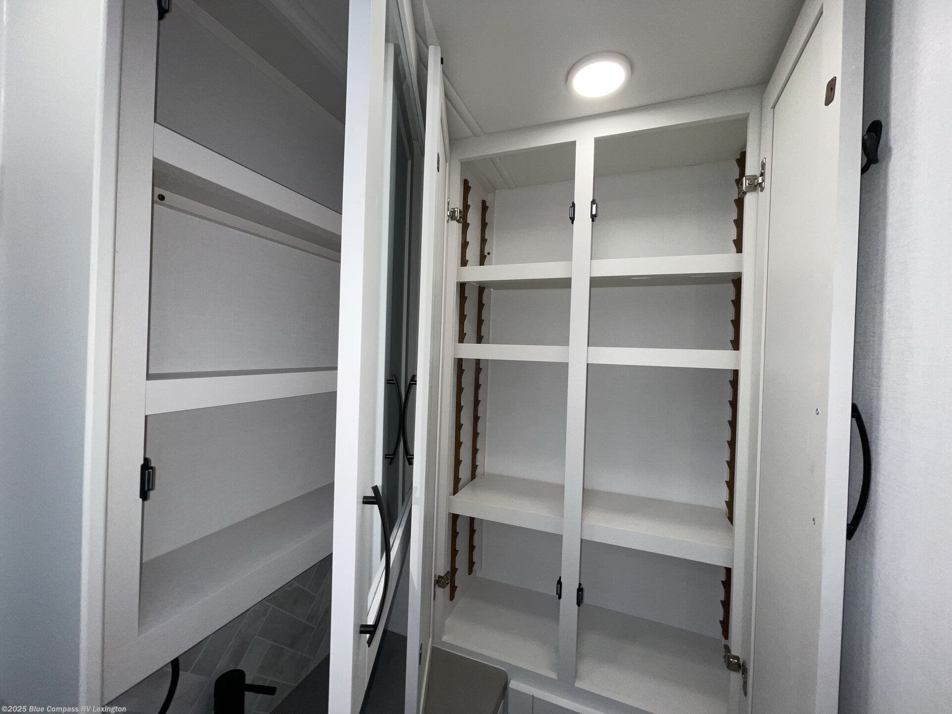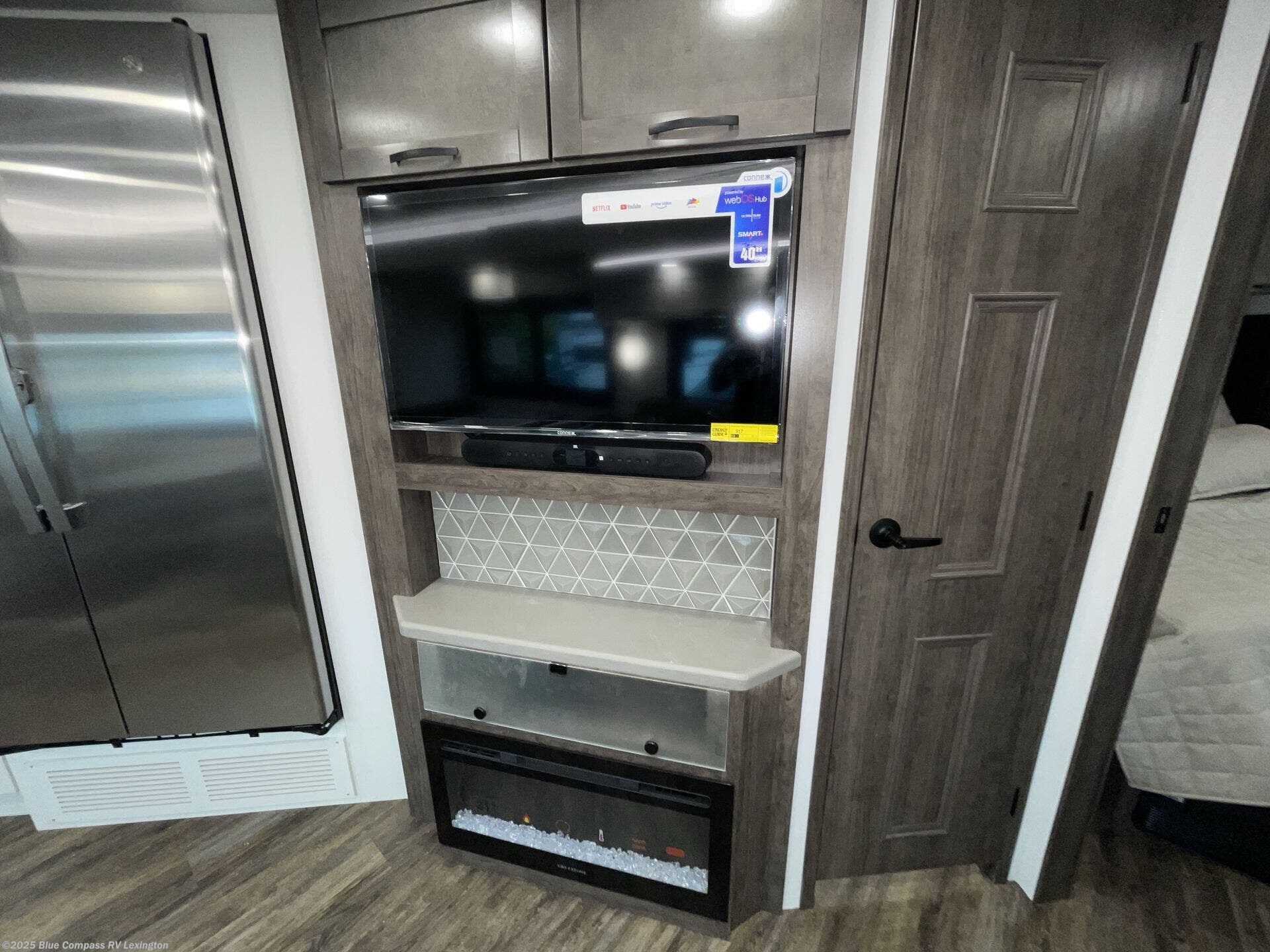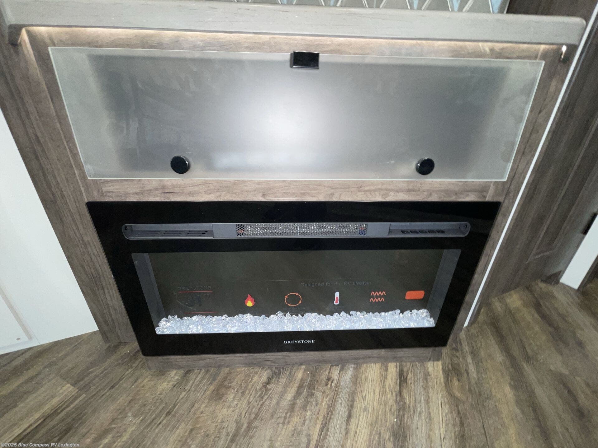 You will find lots to love with this motorhome! From the bath and a half to the bunk over cab and outside entertainment center. The chef can prepare their best meals with the two burner induction cooktop and the residential refrigerator. There's a large pantry next to the booth dinette so you can quickly grab a snack during game night or if you prefer to relax instead then you can enjoy the fireplace and 39" LED HD Smart Fire TV while sitting on the 93" reclining sofa. The master suite has a king bed slide with a power head lift to lay your head on at night, an LED HD Smart TV with a wardrobe and storage area next to it, as well as an area prepped to add an optional washer and dryer. You even have access to the full rear bathroom which has a 30" x 36" shower and a wardrobe to keep your linens close.