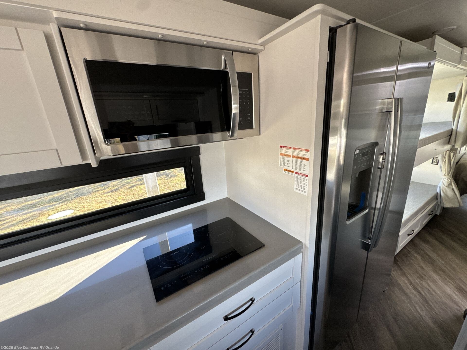 The whole family can join in on the fun with this motorhome! The bunk over cab, the set of bunk beds and king bed slide with power head lift in the rear private bedroom offer comfortable places to sleep. Plus, the hide-a-bed sofa and the booth dinette can also transform into extra sleeping spaces when you're not using the dinette for meals and the sofa for seating to watch a movie on the 50" LED HD Smart TV and fireplace. Everyone will stay squeaky clean with the 30" x 36" shower in the full bathroom, and their bellies full with the two-burner induction cooktop and residential refrigerator!