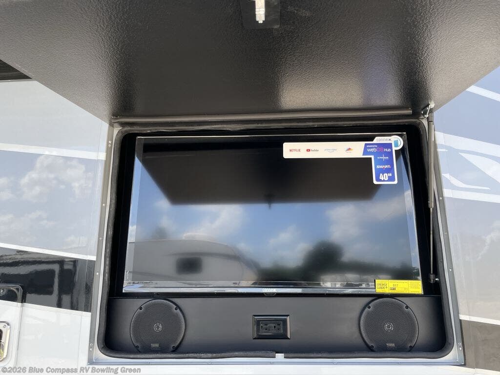 This Seneca Super C diesel motorhome is stunning, and it has sleeping space scattered all throughout! There is a private bedroom with a 72" x 80" king bed slide that can be used by the owners of this coach, and if there are any children, they will appreciate the set of bunk beds with a tablet holder at each bunk. Out in the main living area, you'll find a hide-a-bed sofa and booth dinette which can both be used as lounging or sleeping spaces, and the last sleeping location is included above the cab with the overhead bunk. The living area is comfortable and residential with its fireplace and 50" LED TV, and you'll have an additional entertainment center on the exterior which comes with an exterior LED TV mounted on a swivel bracket, outside speakers, and an AM/FM radio.