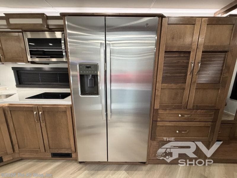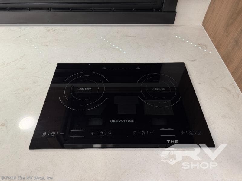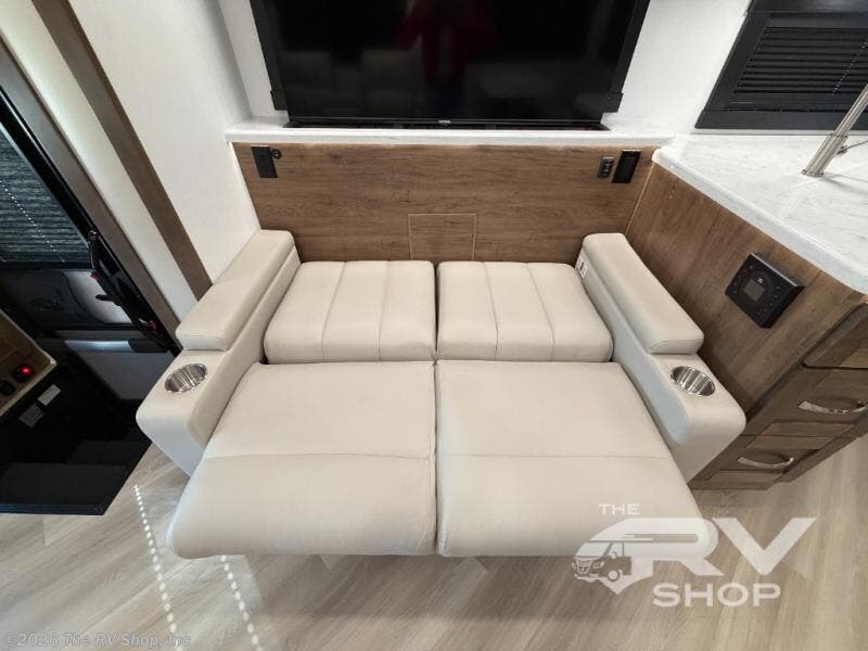 There is room for your small family to go on a country excursion together in this motorhome! The chef can prepare their best meals with the two-burner induction cooktop, enjoy them at the booth dinette, and store any leftovers in the residential refrigerator, plus there is a hutch to store your dishes. The 50" LED Smart TV is on a lift above the jackknife sofa and across from the power theater seating. You could even watch the big game outside with the exterior entertainment center that comes with outside speakers and an LED HD Smart TV mounted on a swivel bracket, plus you will be protected by the 23' electric awning!