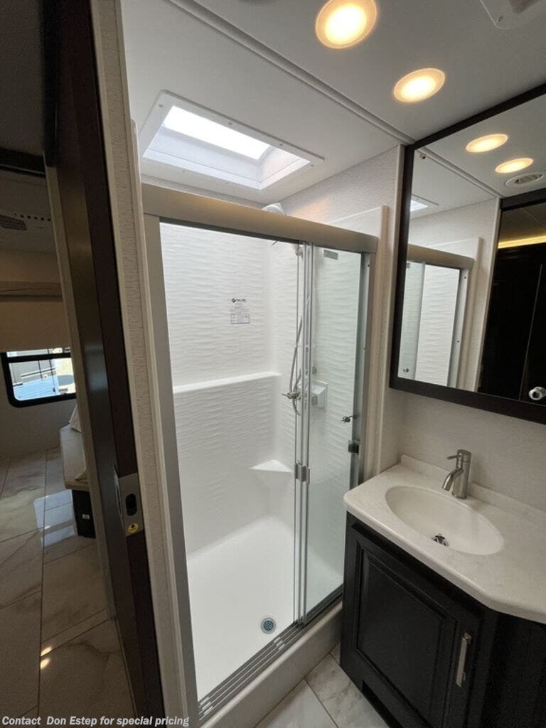 - One-piece, fiberglass shower with glass door, skylight and light