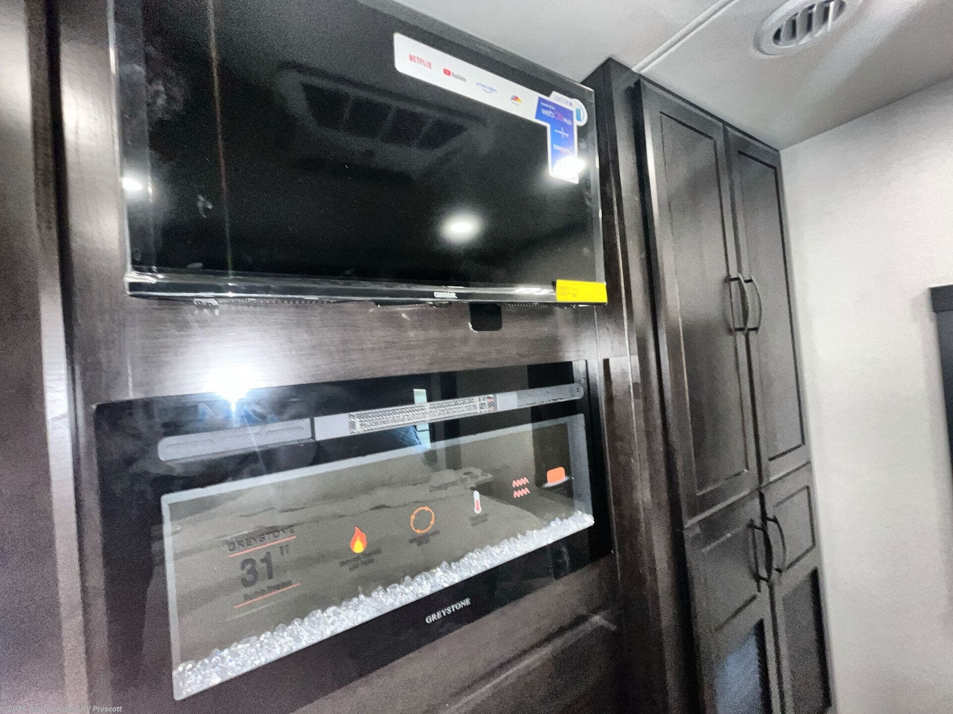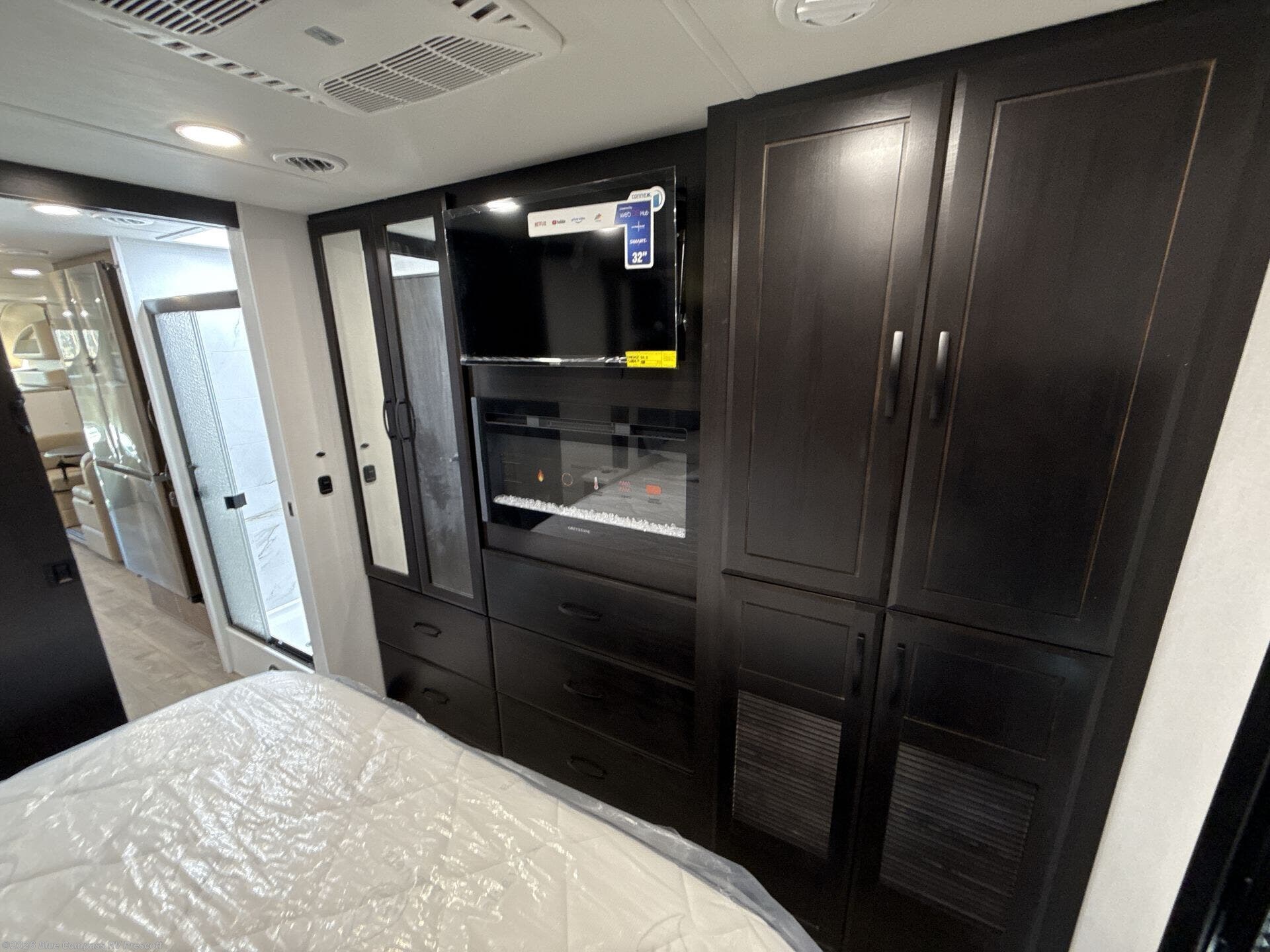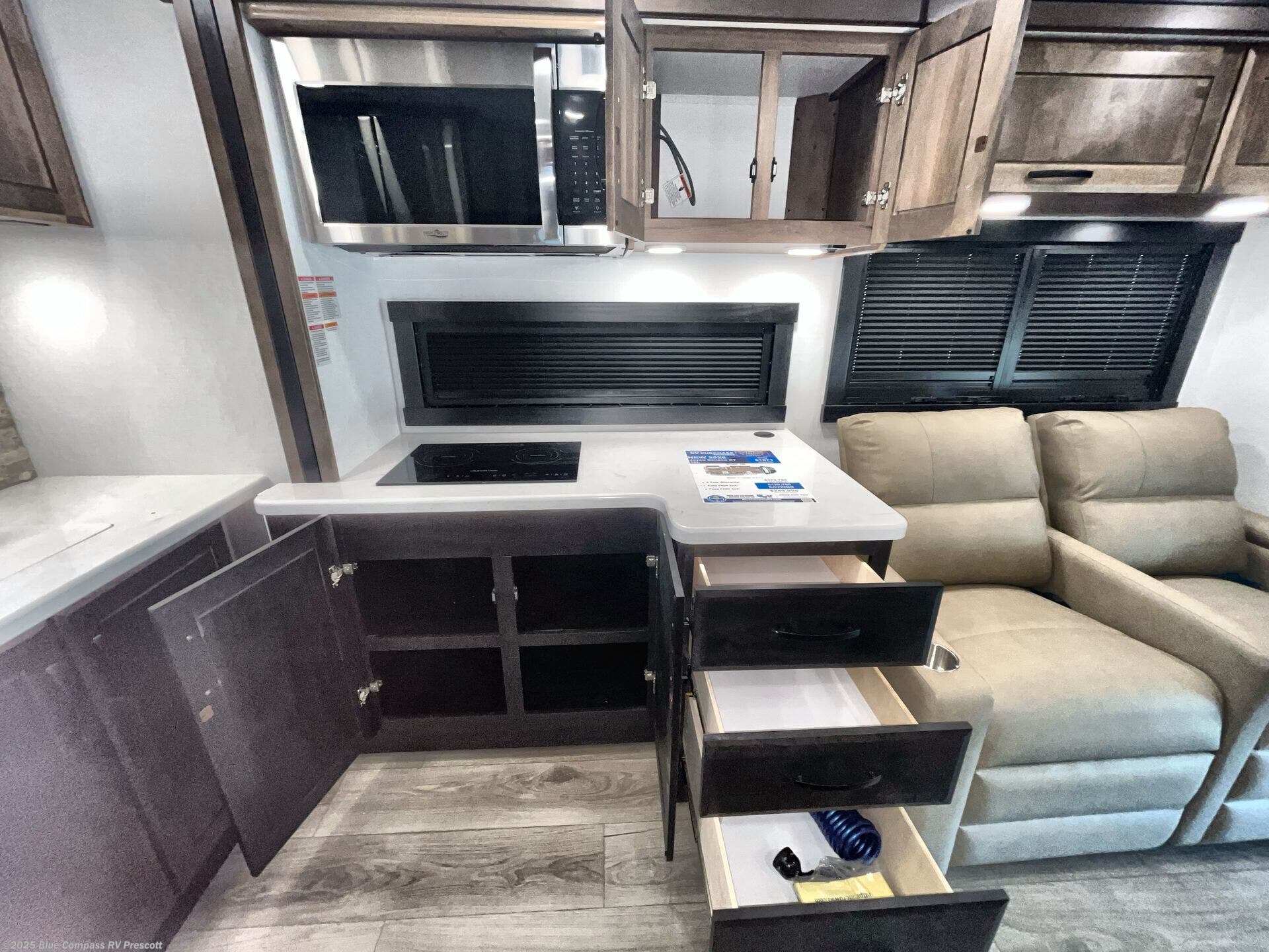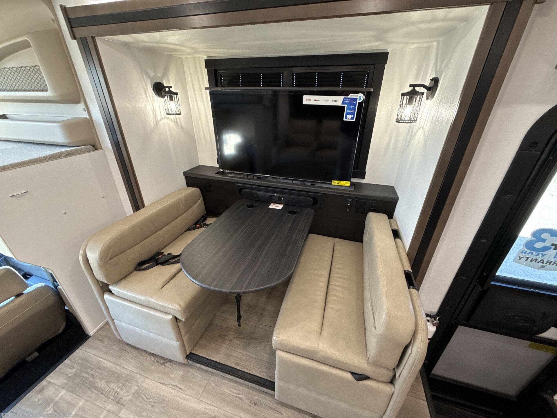 You will get a good night's rest each night in this motorhome! The rear private bedroom has a 72" x 80" king bed slide with power head lift across from a fireplace, a wardrobe, a TV cabinet, and an area prepped for an optional washer and dryer combo so you can have clean clothes throughout your entire trip. The separated bathroom makes it easy for one person to clean up in the 30" x 36" shower while another uses the private toilet and sink. Prepare your best home cooked meals with the two burner cooktop then enjoy them at the 38" x 70" booth dinette with a 50" TV lift above it. The cabover bunk provides a comfortable place to sleep and the 60" tri-fold sofa can also be a sleeping space too!