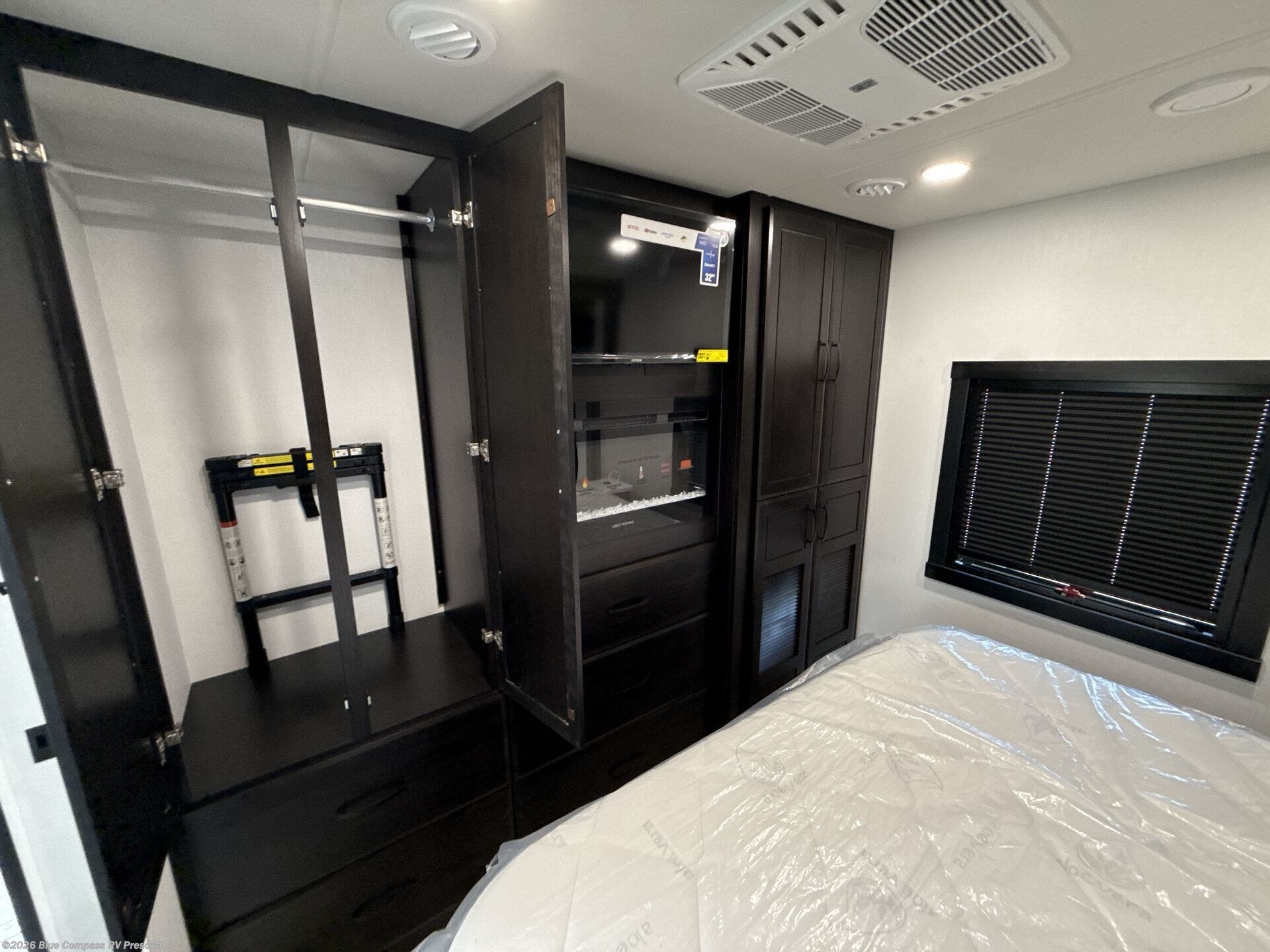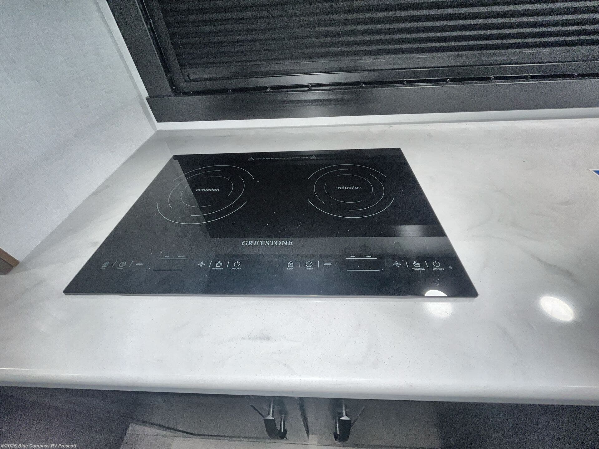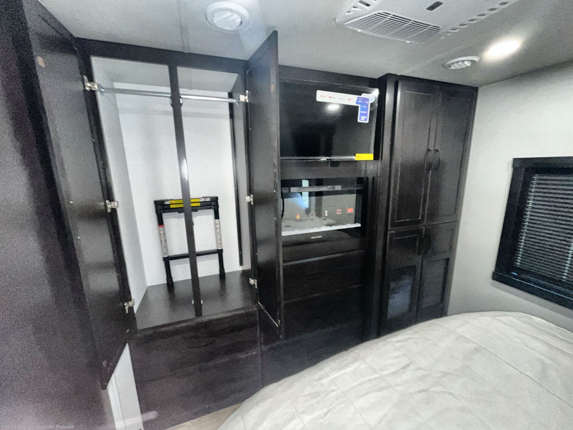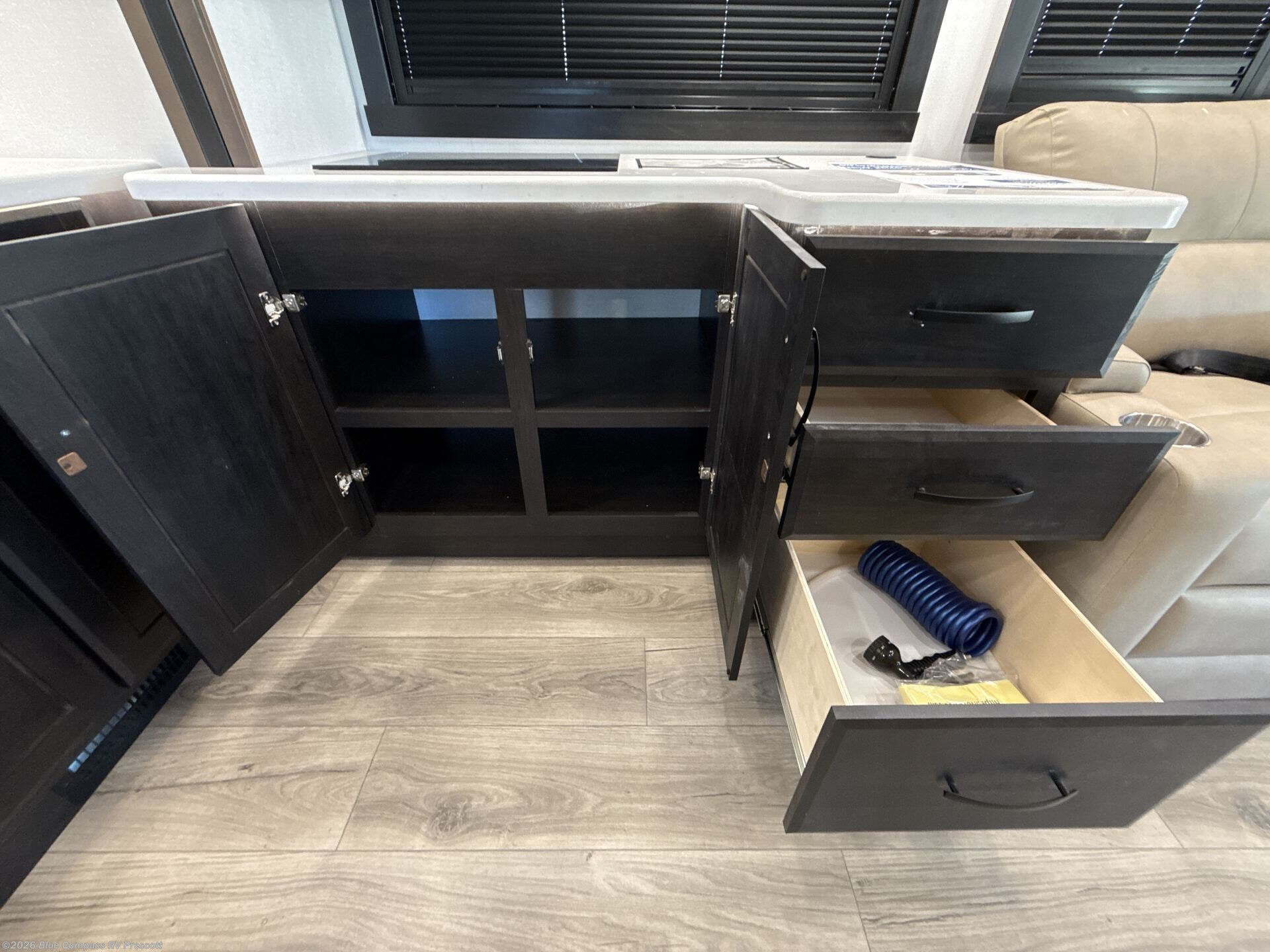 You will get a good night's rest each night in this motorhome! The rear private bedroom has a 72" x 80" king bed slide with power head lift across from a fireplace, a wardrobe, a TV cabinet, and an area prepped for an optional washer and dryer combo so you can have clean clothes throughout your entire trip. The separated bathroom makes it easy for one person to clean up in the 30" x 36" shower while another uses the private toilet and sink. Prepare your best home cooked meals with the two burner cooktop then enjoy them at the 38" x 70" booth dinette with a 50" TV lift above it. The cabover bunk provides a comfortable place to sleep and the 60" tri-fold sofa can also be a sleeping space too!