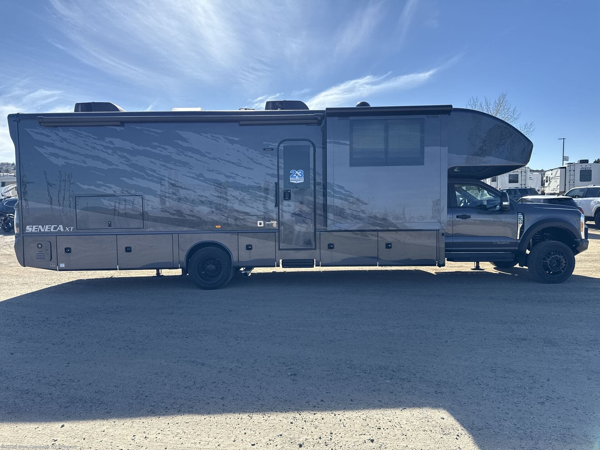 You won't find a more rugged look than with these Jayco Seneca XT Super C diesel motorhomes! They are built with an integrated front and rear auxiliary lighting and a 2 inch BDS radius arm suspension lift. The Ford F600 4x4 chassis, along with the JRide Premium ride and handling package helps them handle well on and off the pavement creating an all-terrain vehicle. The mandatory Customer Value package makes life even more comfortable with features like a 200W solar panel with dual controller to go off-grid, a convection microwave oven for quick meals, plus backup and side-view cameras to prevent accidents. Come choose your favorite one!