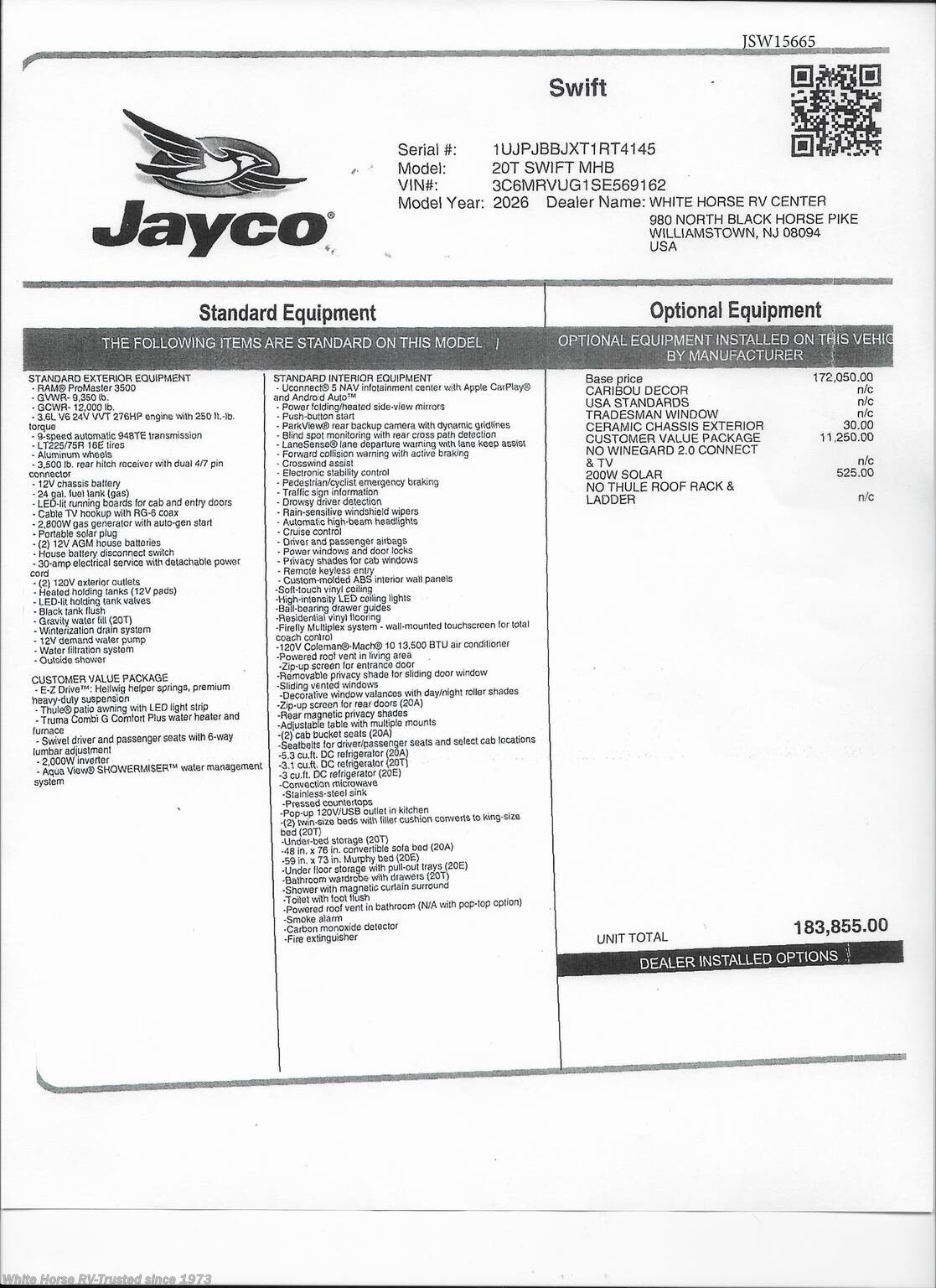 This Stock # JSW15665 also has the following factory options included: Caribou Interior Decor, & Ceramic Chassis Exterior & 200 W Solar ... all backed by Jayco’s 2+3-year warranty. MSRP $183,855.