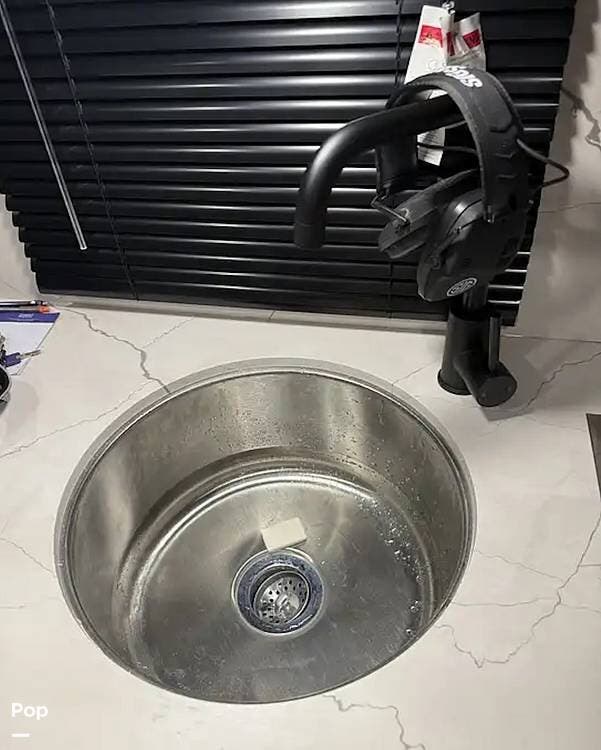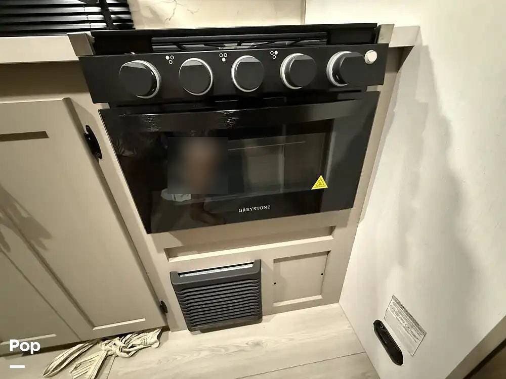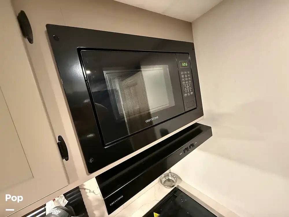 The central living space is bright and open, featuring a theater-style sofa and removable dinette table, surrounded by panoramic windows that invite the outdoors in. When it's time to cook, the fully equipped kitchen makes it easy -- stainless-steel sink with pull-down sprayer, 3-burner glass-top range with oven, microwave, and a spacious 10 cu. ft. 12V refrigerator. The solid-surface countertops add a refined touch whether you're prepping meals or pouring that first cup of morning coffee.