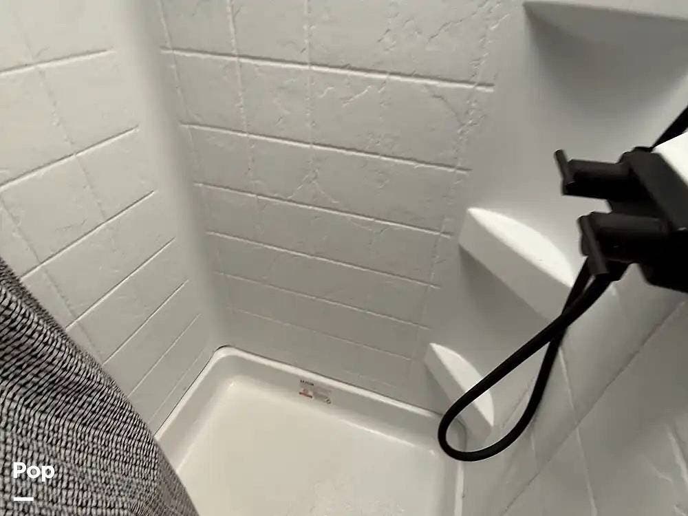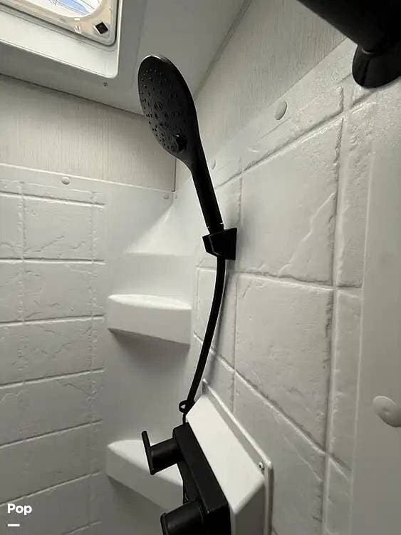 The rear bathroom gives you a true home-style setup with a large walk-in shower, porcelain foot-flush toilet, plenty of storage, and modern fixtures.