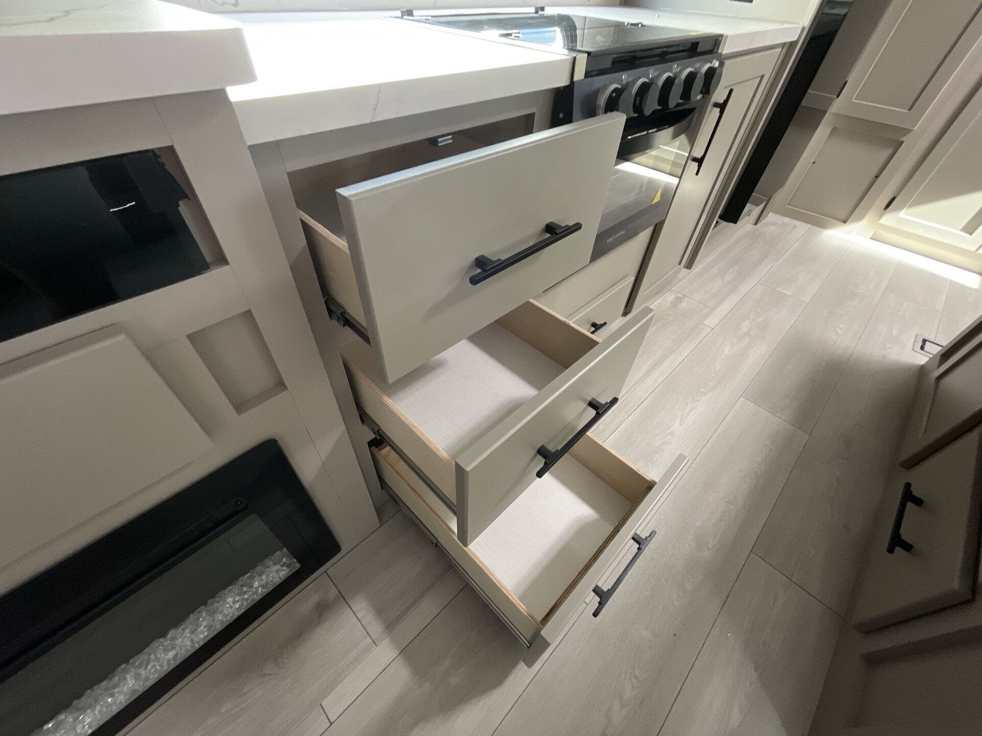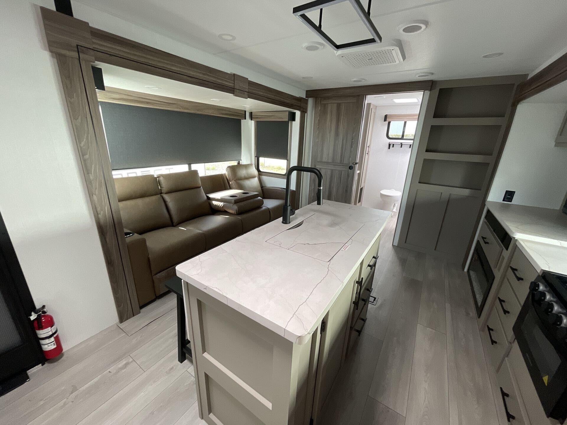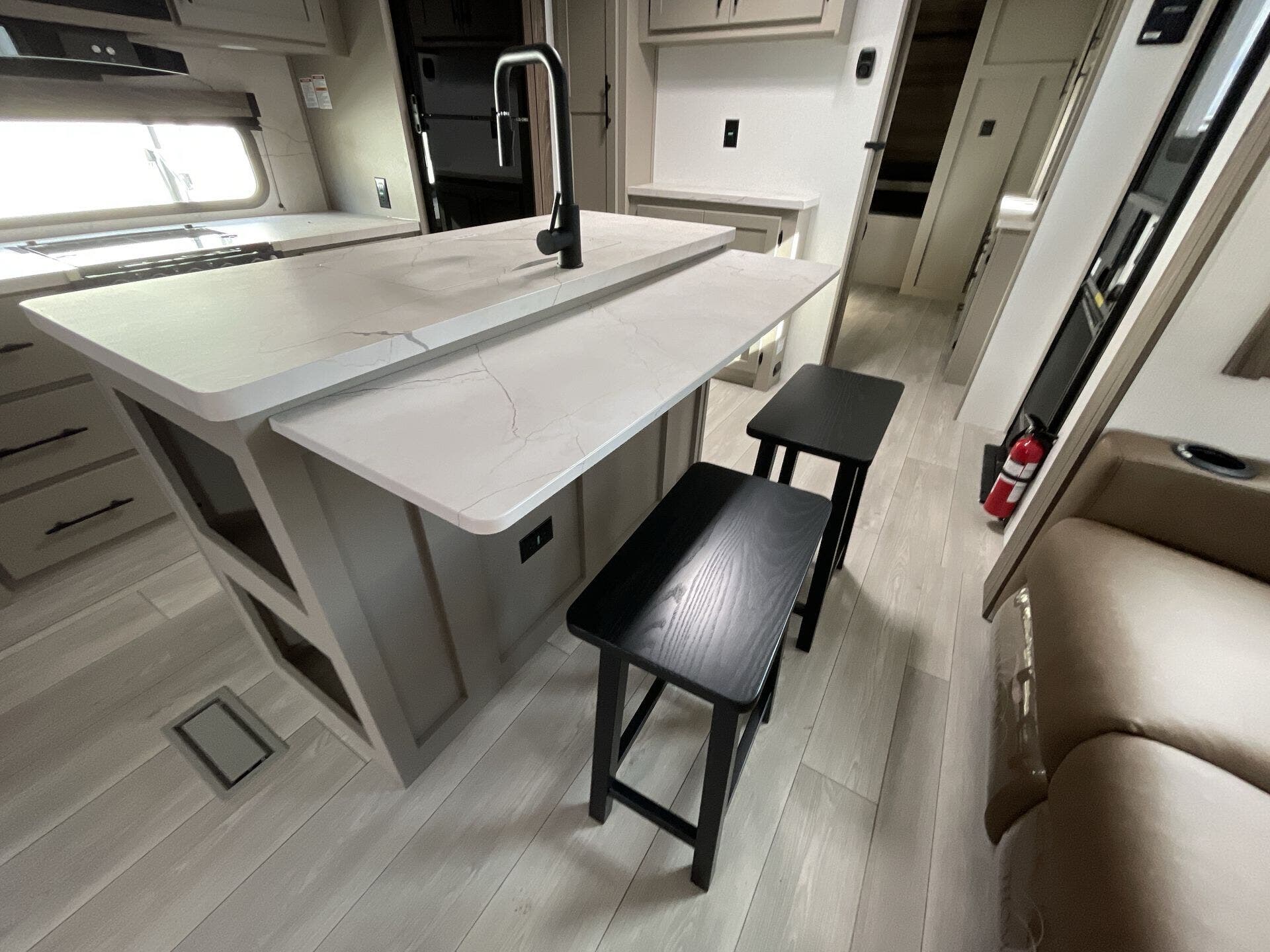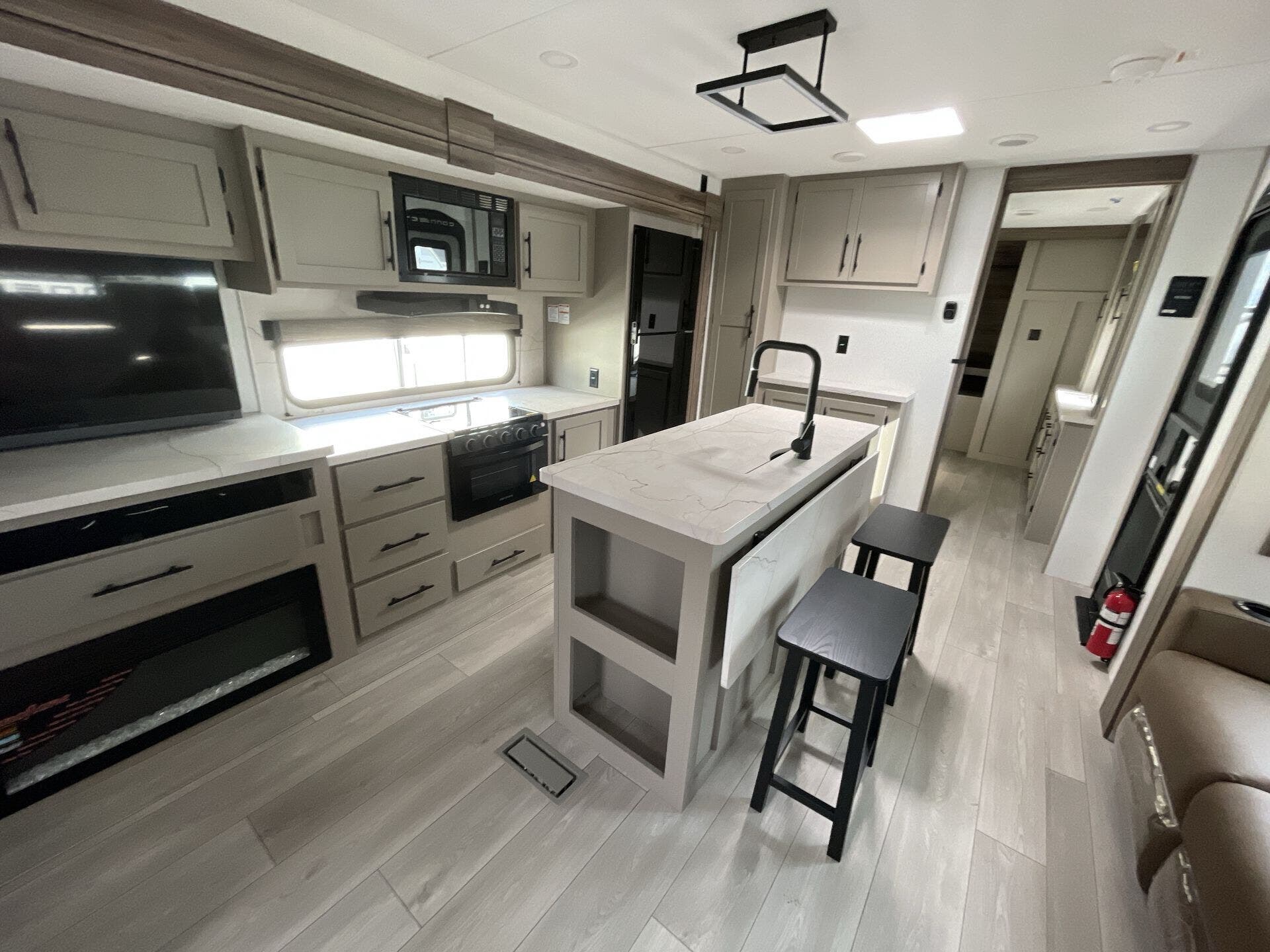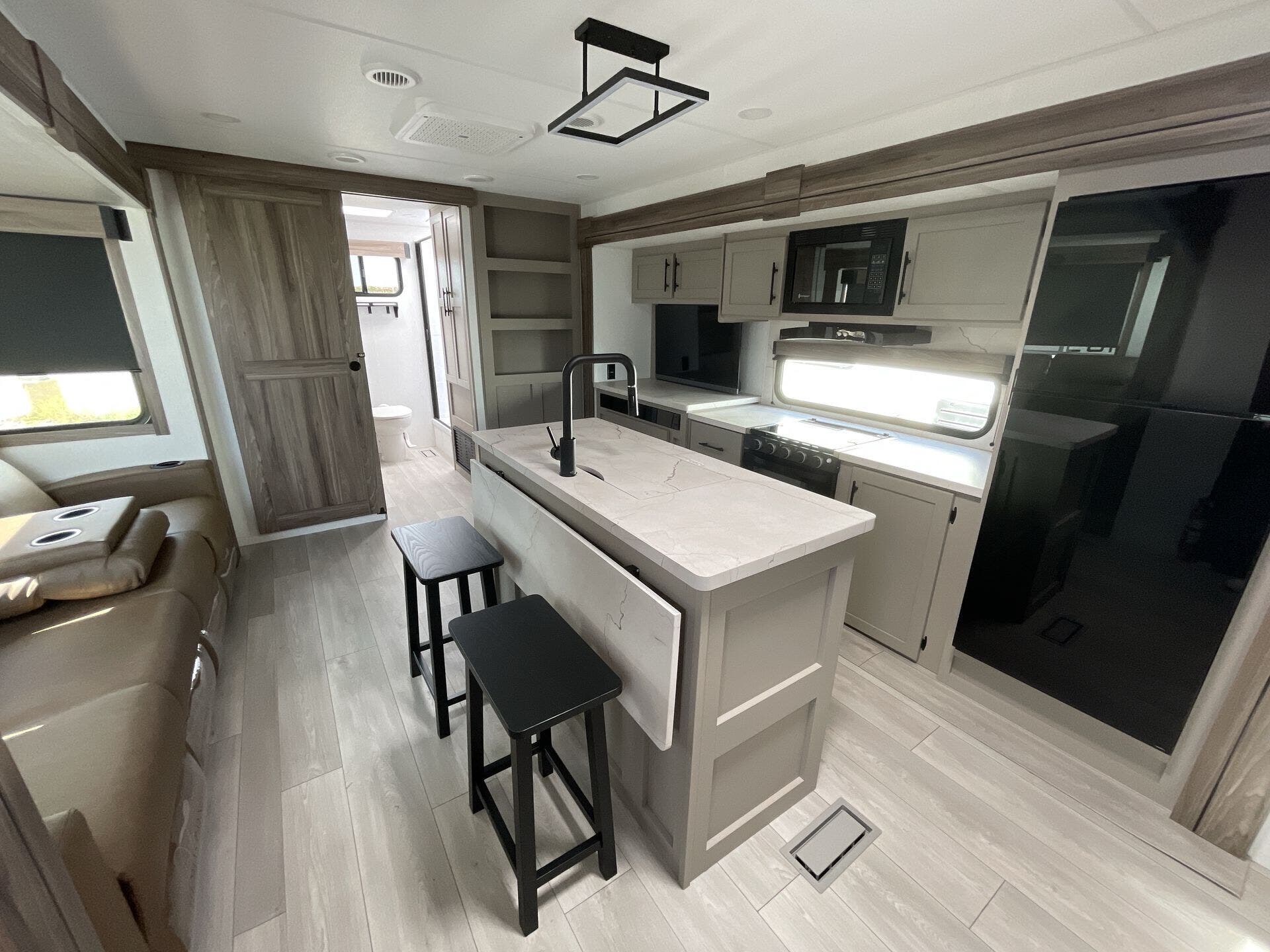 Step inside and you’ll be greeted by an open living area featuring panoramic windows, a cozy sofa or theater seating, and a booth dinette or optional free-standing table. The entertainment center is perfectly placed for relaxing evenings, while the stylish kitchen offers residential touches including solid-surface counters, stainless-steel appliances, generous cabinetry, and a large pantry. Whether you’re whipping up a quick snack or a full meal, the 293RB’s design makes cooking easy and enjoyable.