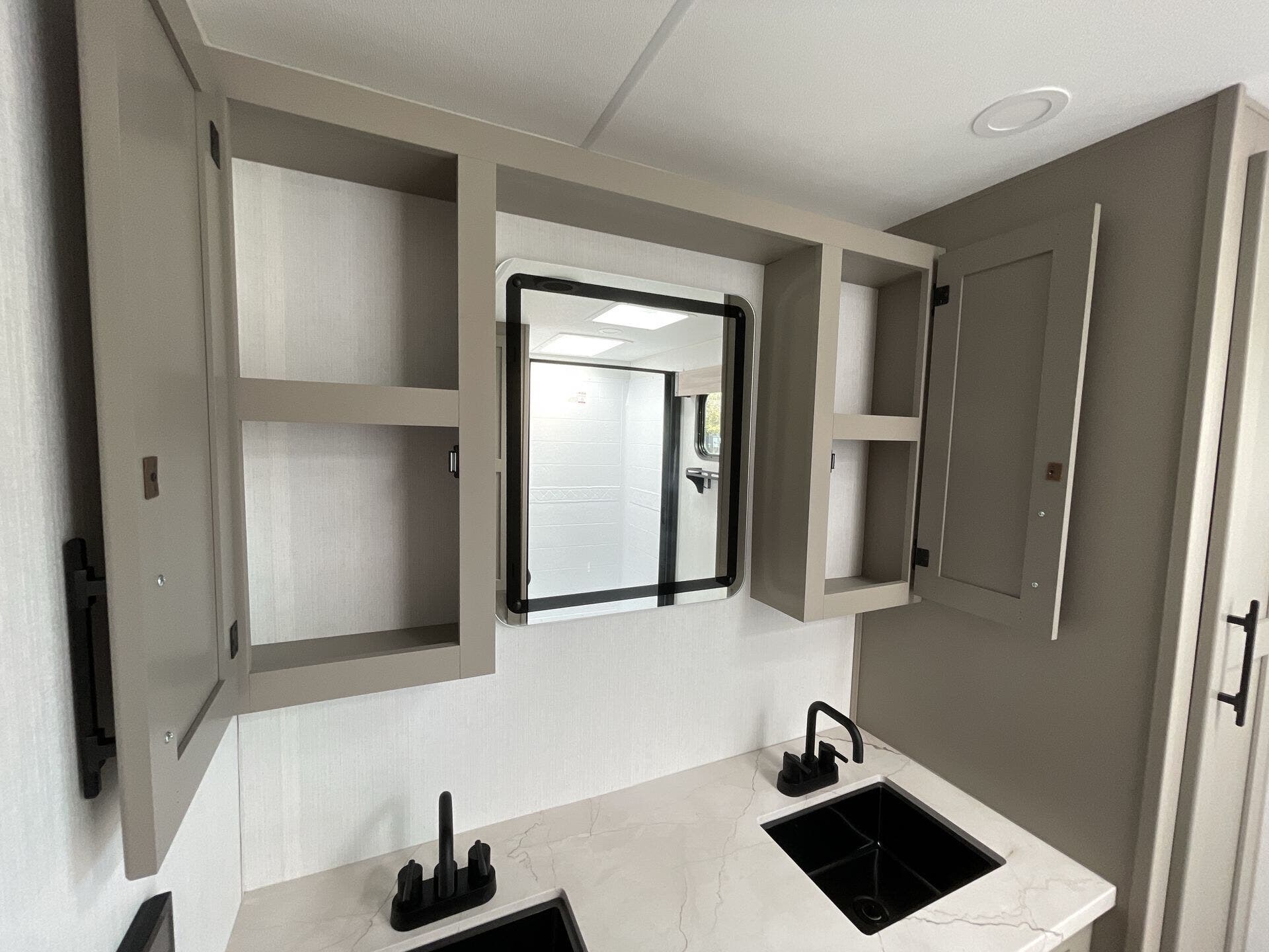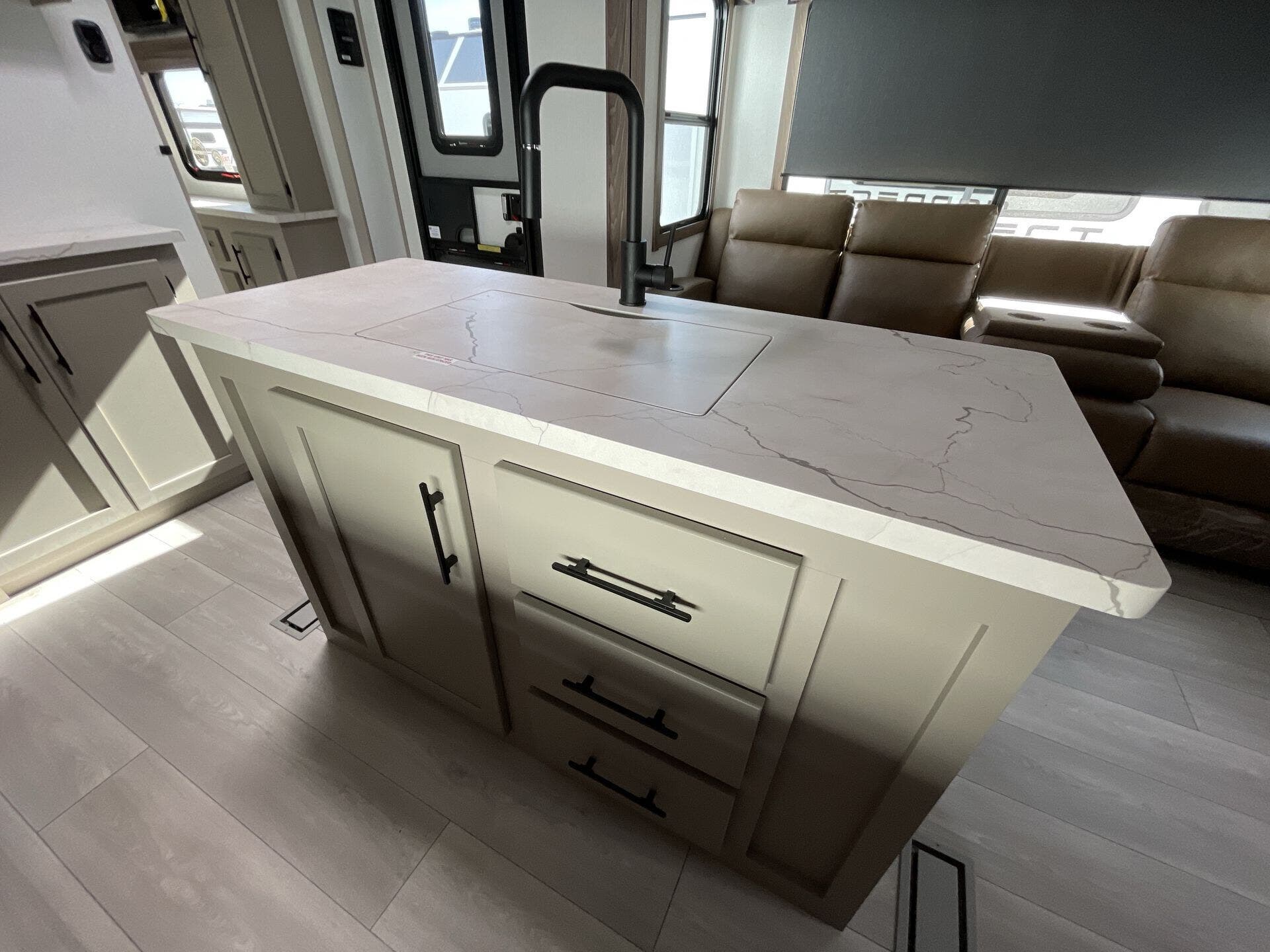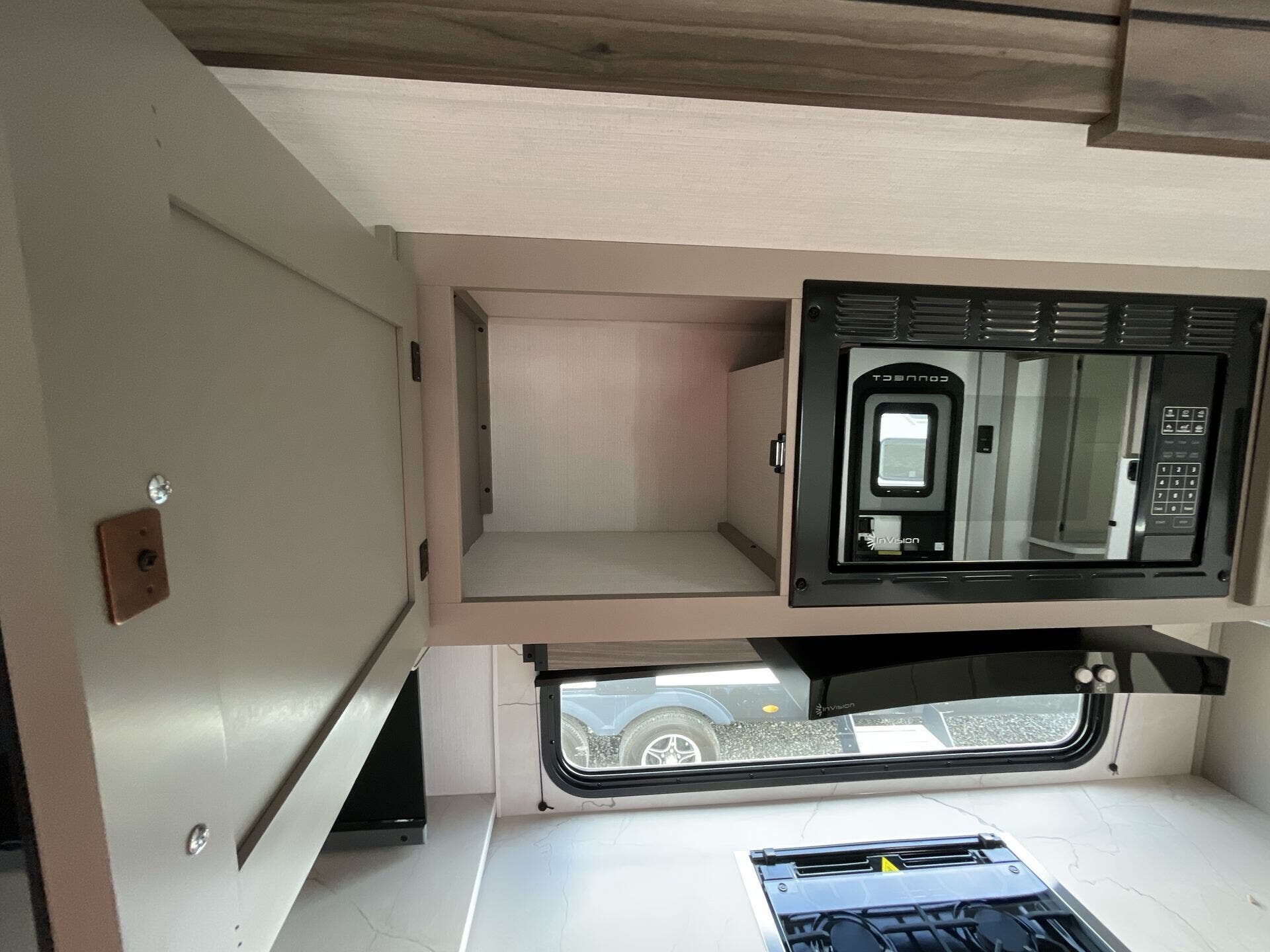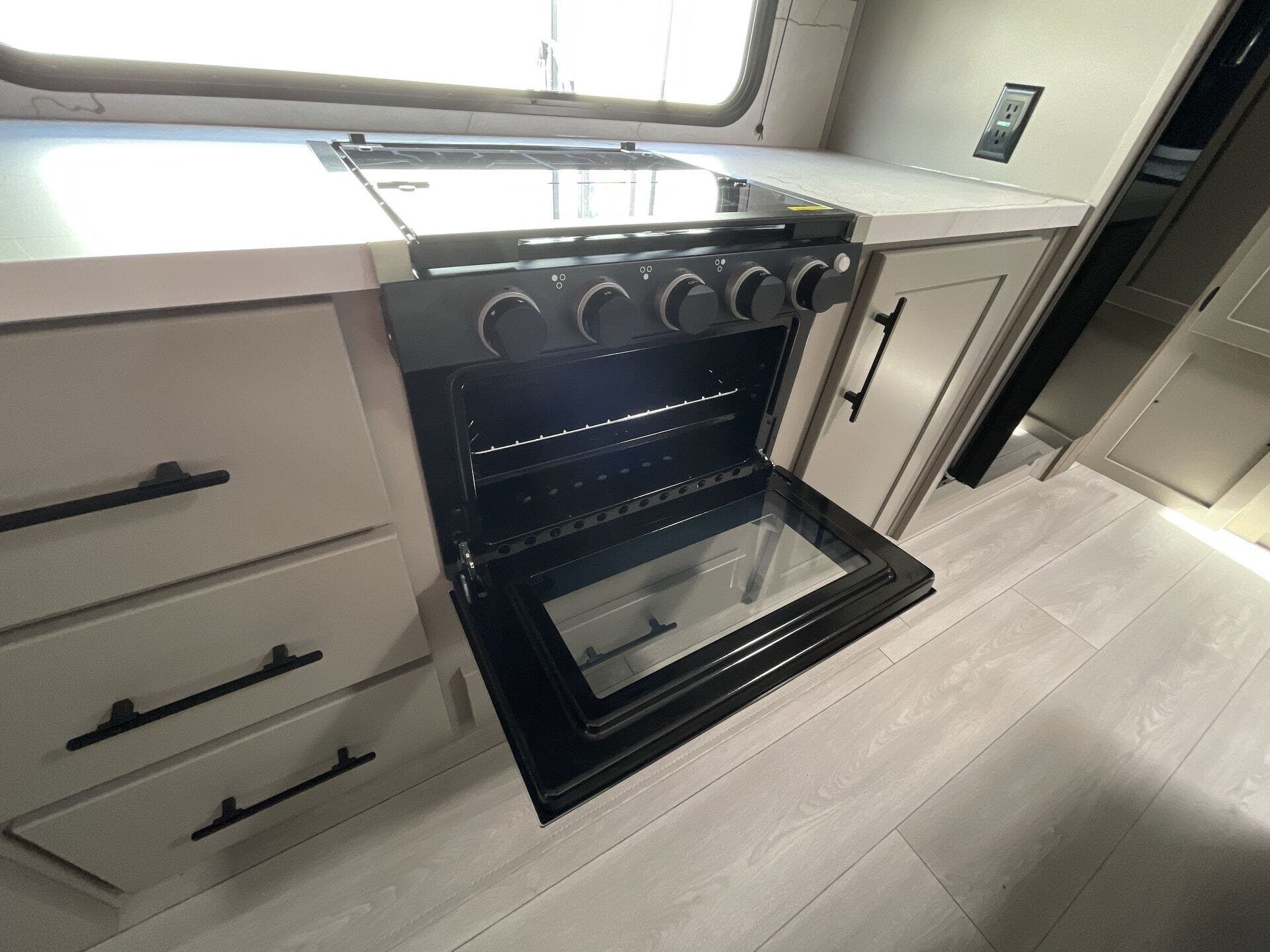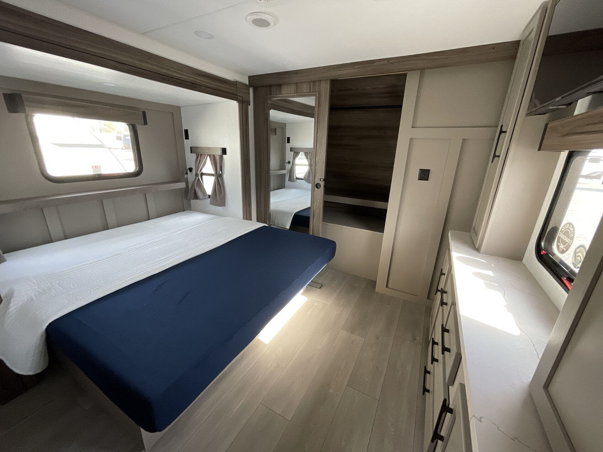 Step inside and you’ll be greeted by an open living area featuring panoramic windows, a cozy sofa or theater seating, and a booth dinette or optional free-standing table. The entertainment center is perfectly placed for relaxing evenings, while the stylish kitchen offers residential touches including solid-surface counters, stainless-steel appliances, generous cabinetry, and a large pantry. Whether you’re whipping up a quick snack or a full meal, the 293RB’s design makes cooking easy and enjoyable.