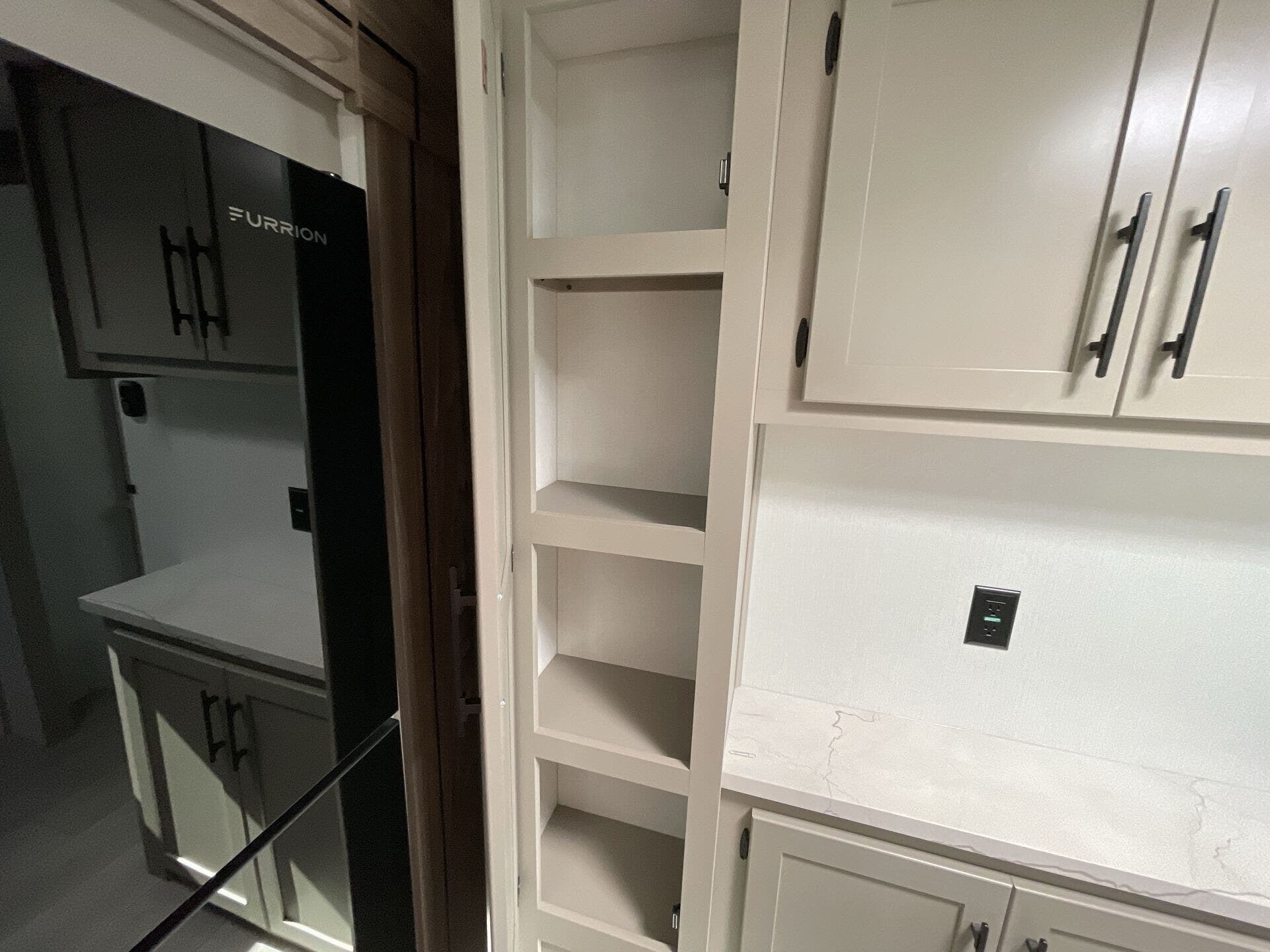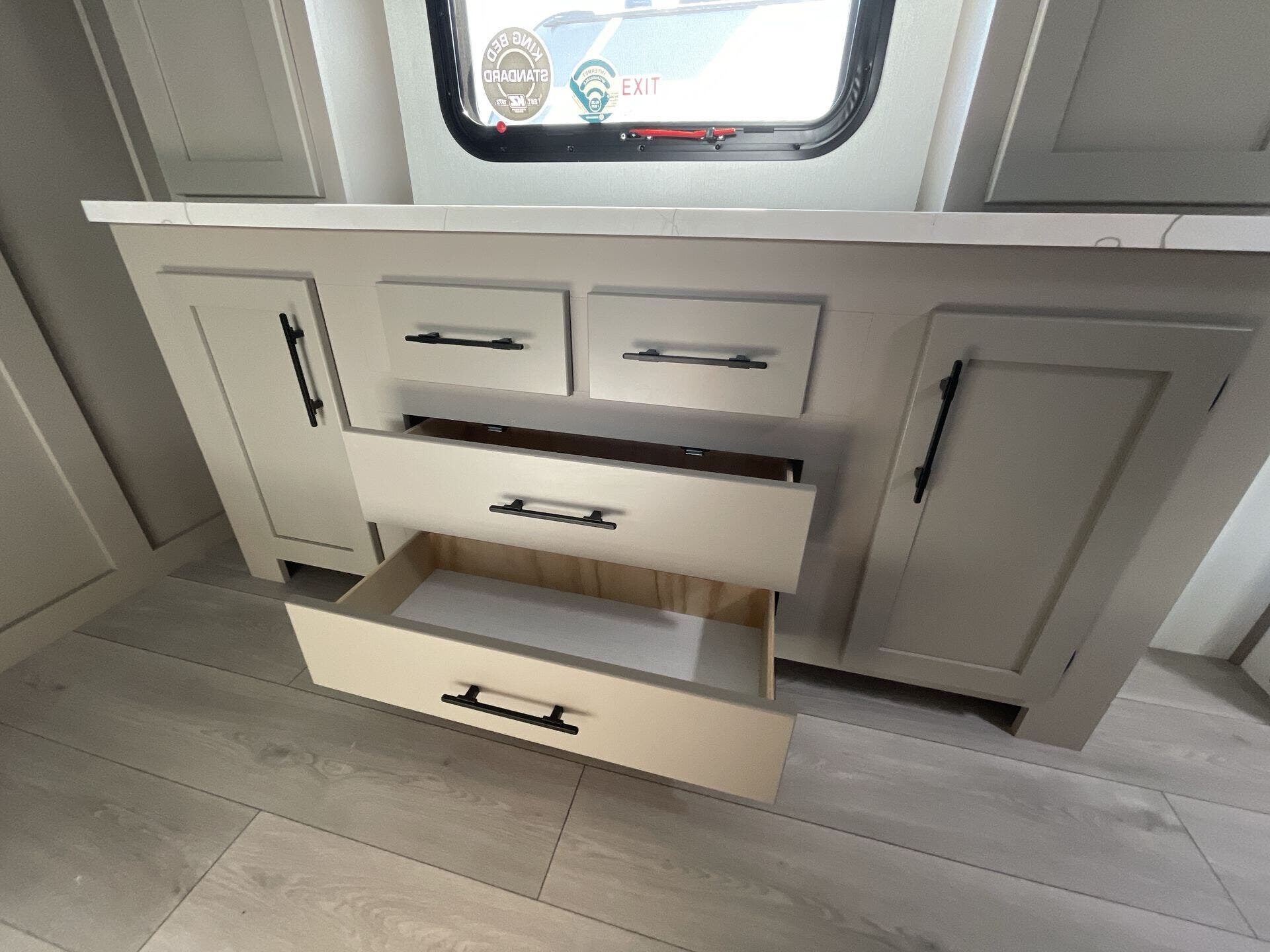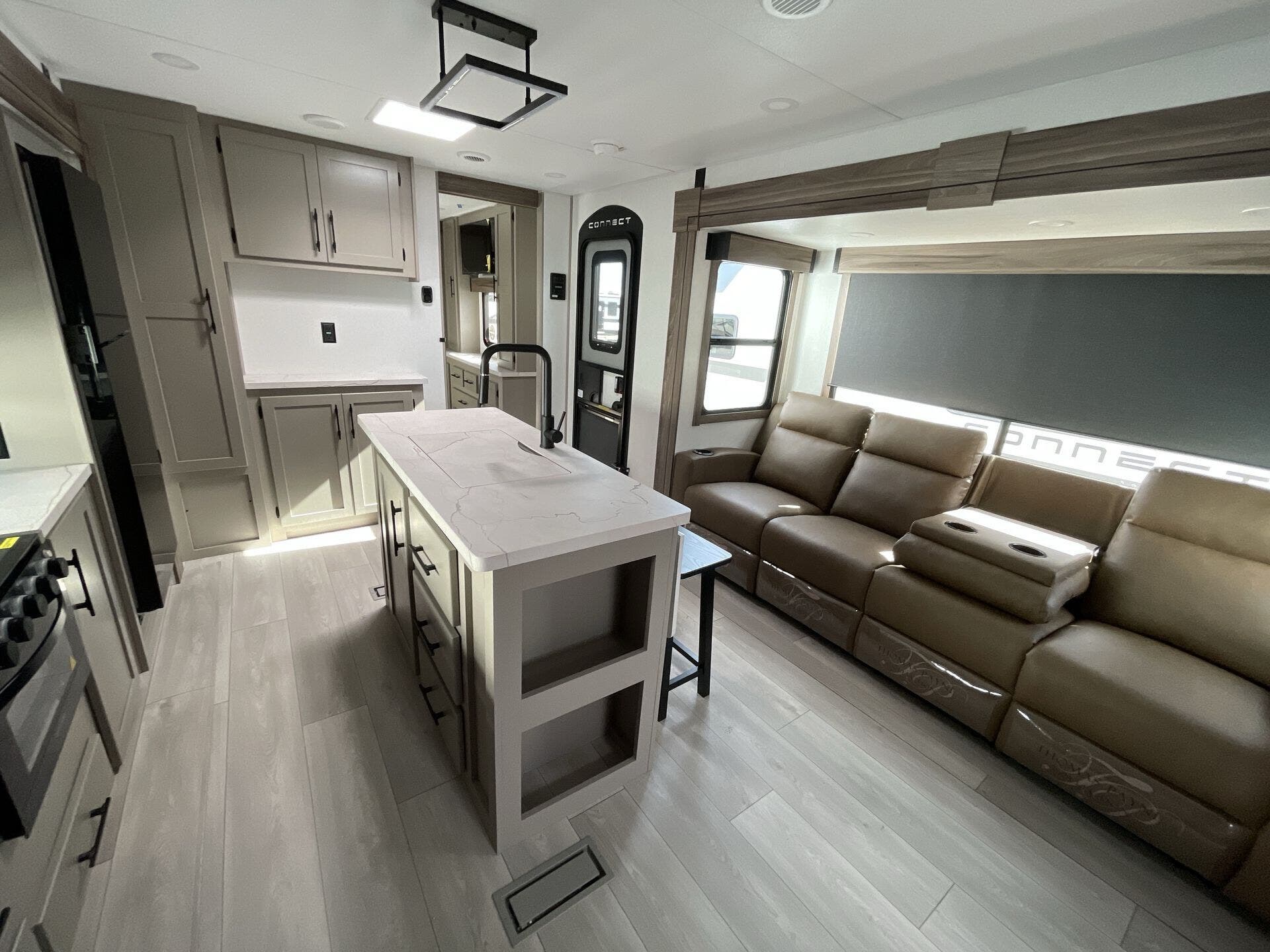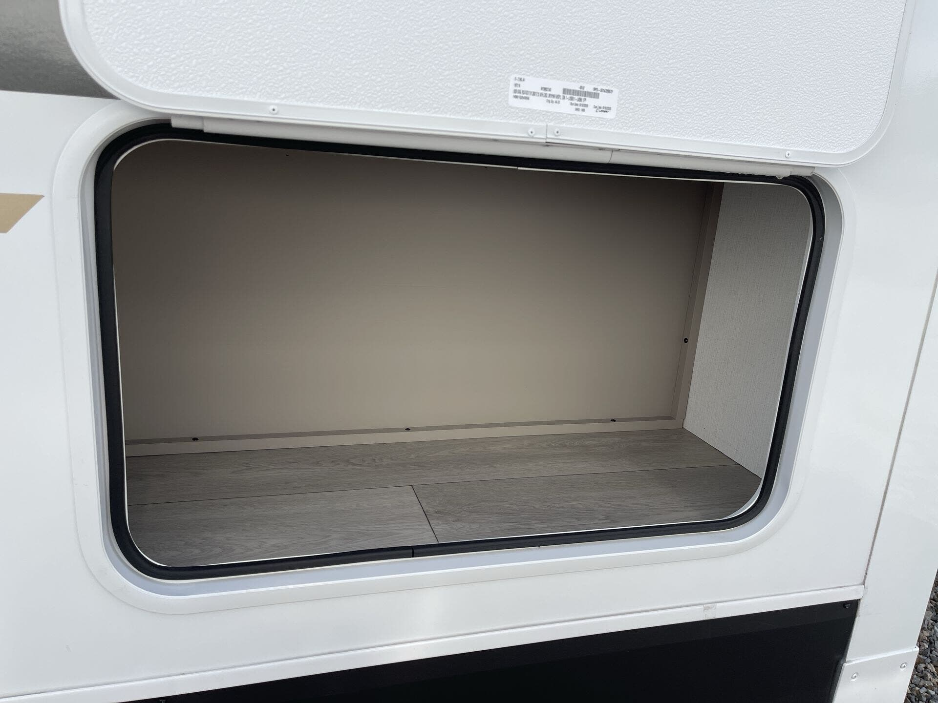 Step inside and you’ll be greeted by an open living area featuring panoramic windows, a cozy sofa or theater seating, and a booth dinette or optional free-standing table. The entertainment center is perfectly placed for relaxing evenings, while the stylish kitchen offers residential touches including solid-surface counters, stainless-steel appliances, generous cabinetry, and a large pantry. Whether you’re whipping up a quick snack or a full meal, the 293RB’s design makes cooking easy and enjoyable.