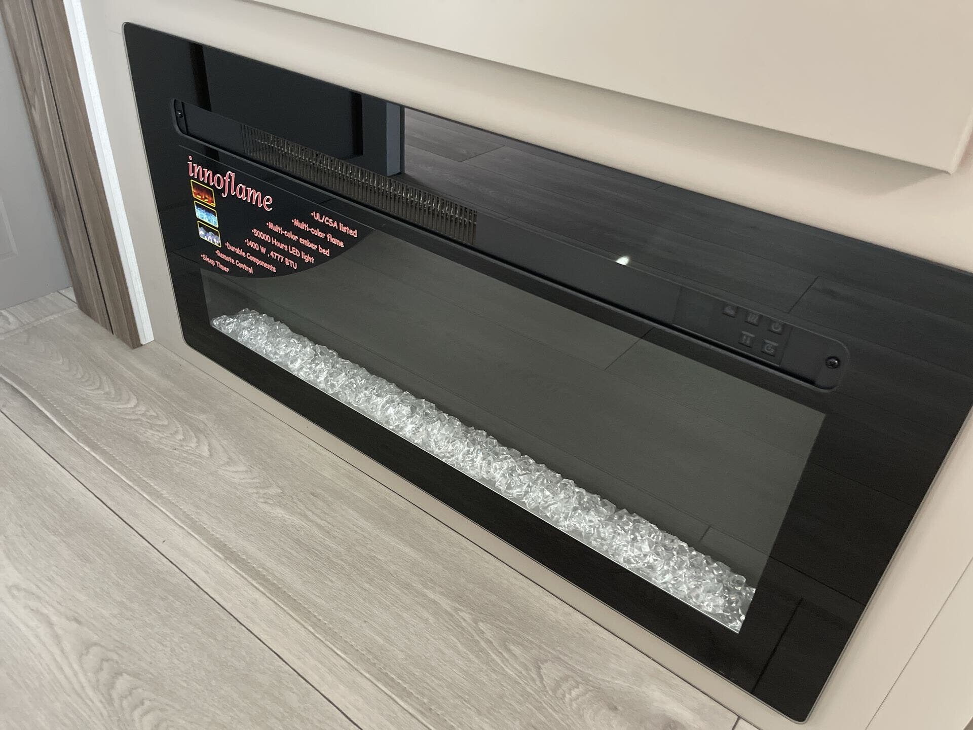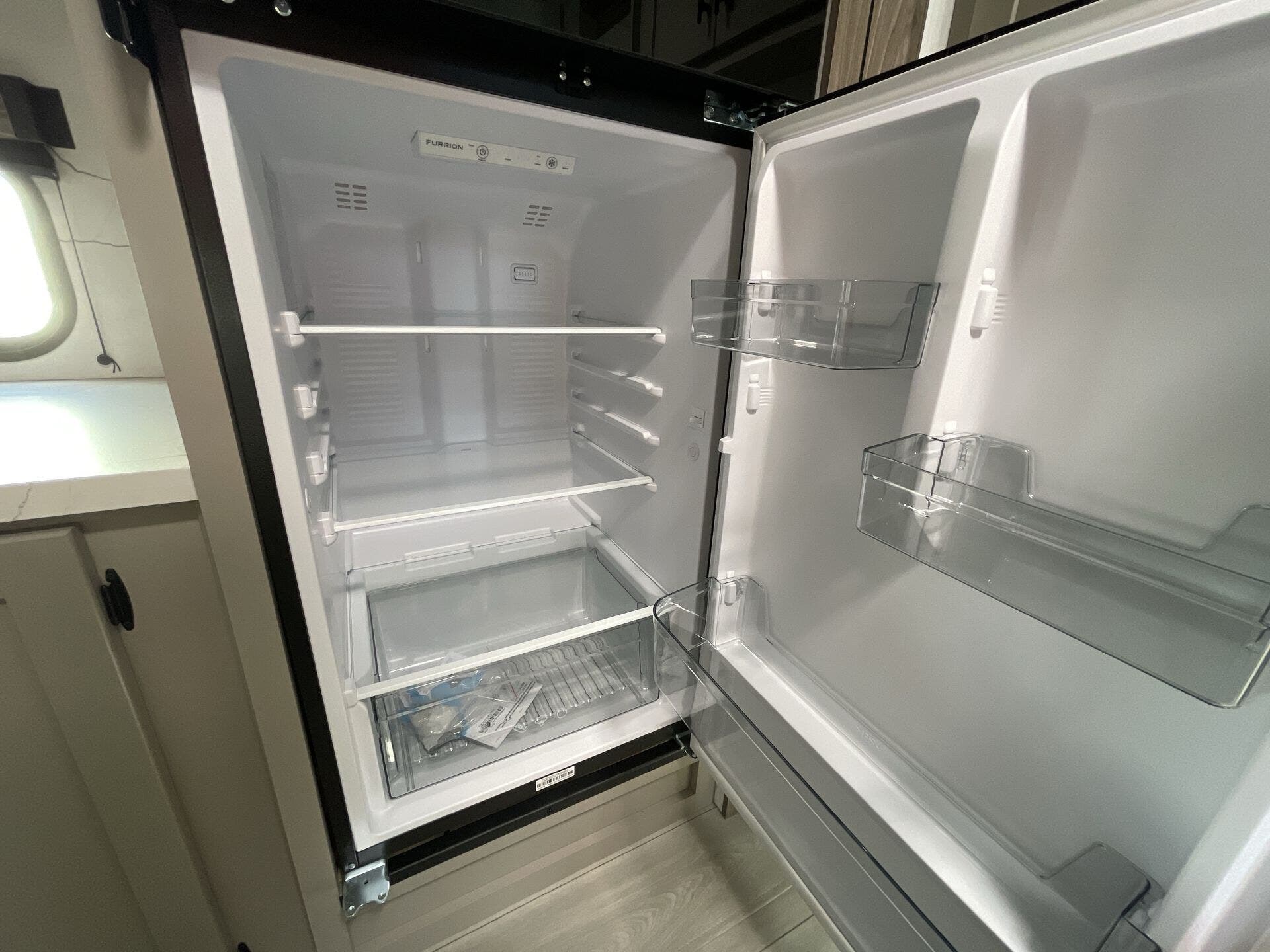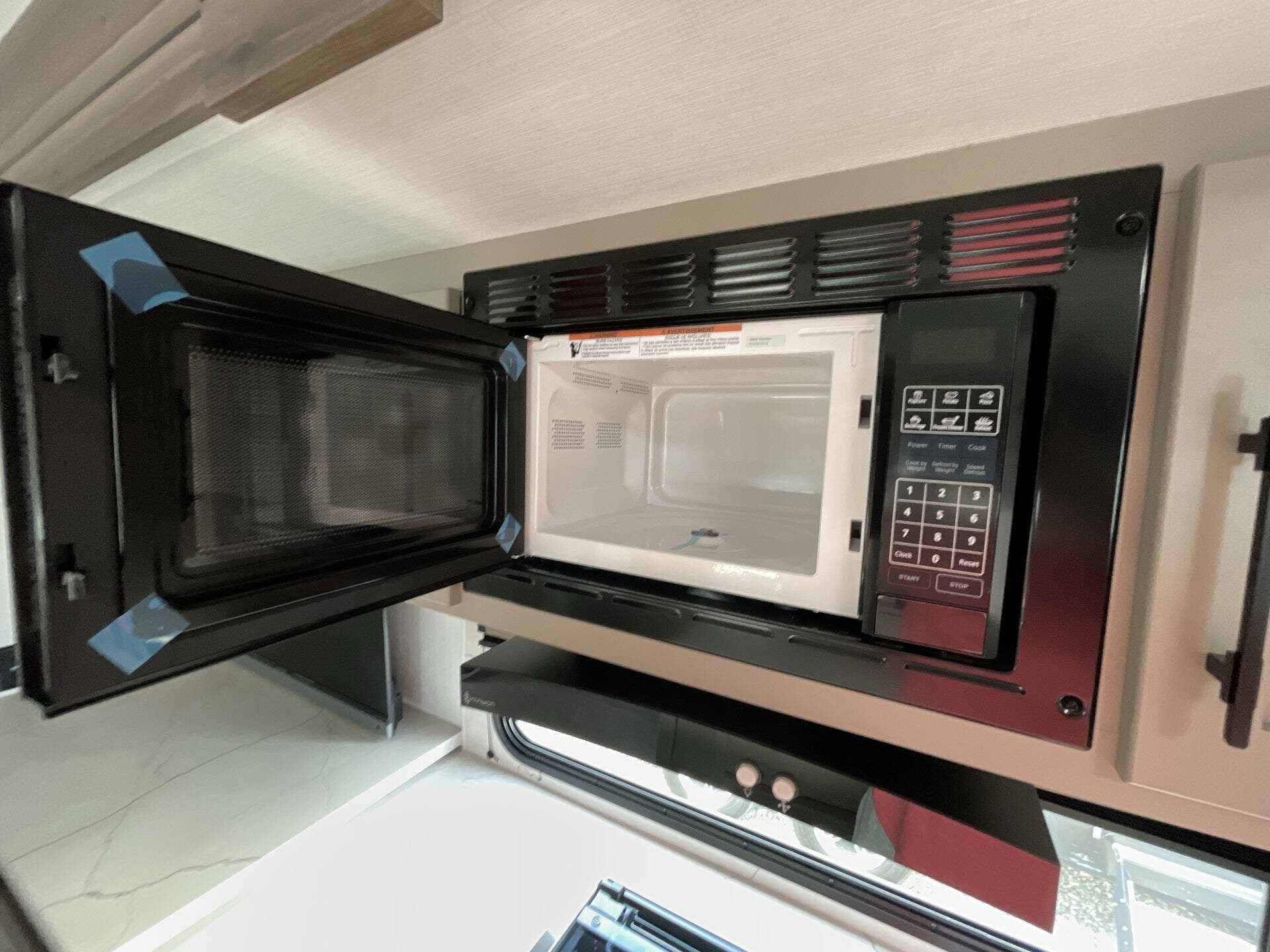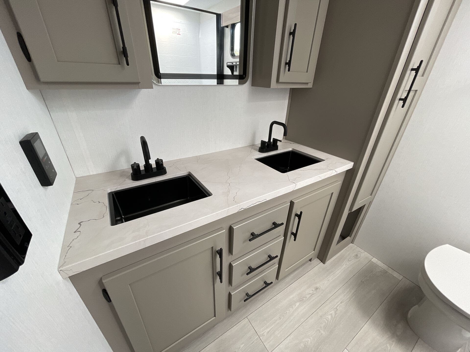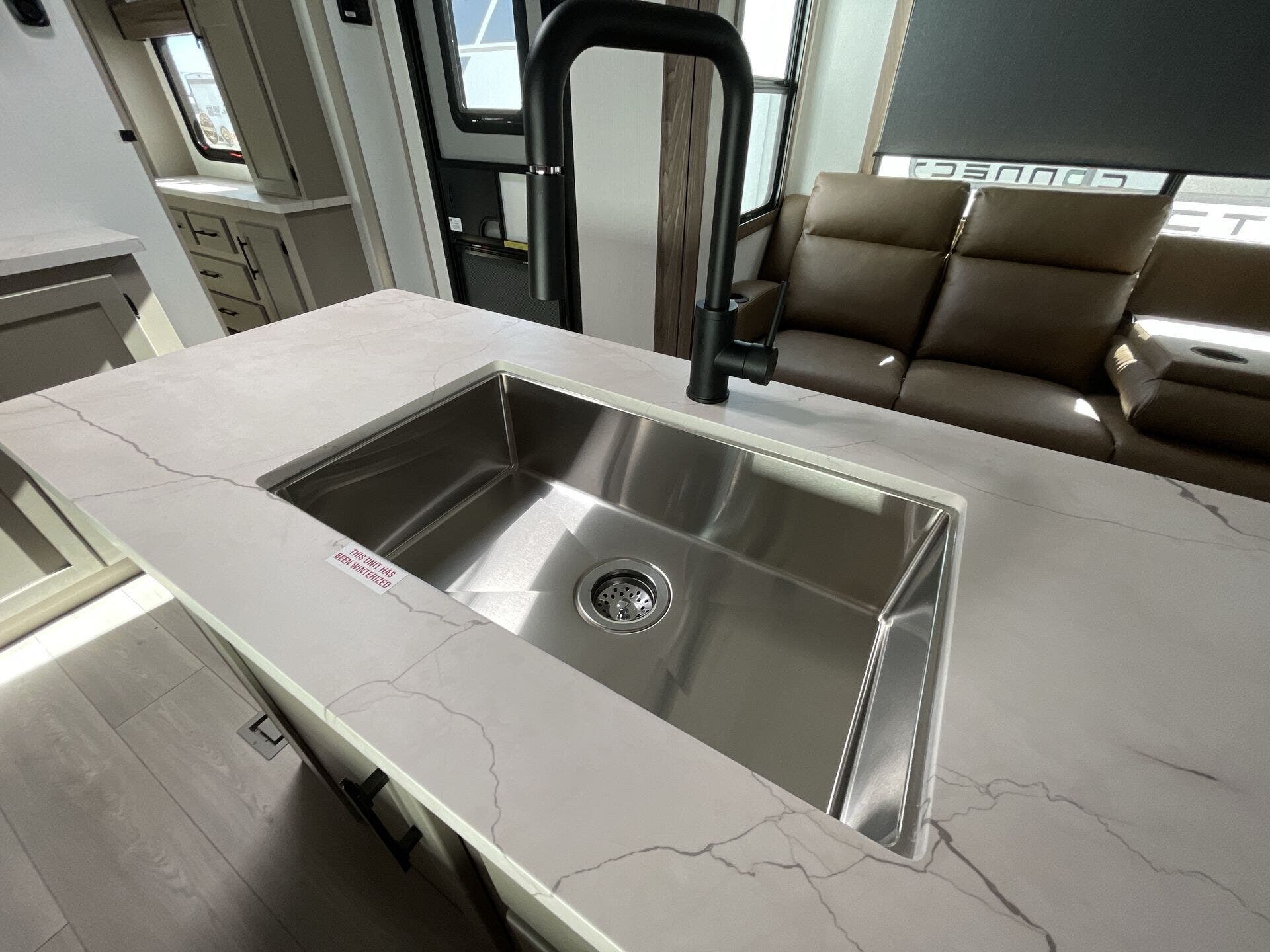Step inside and you’ll be greeted by an open living area featuring panoramic windows, a cozy sofa or theater seating, and a booth dinette or optional free-standing table. The entertainment center is perfectly placed for relaxing evenings, while the stylish kitchen offers residential touches including solid-surface counters, stainless-steel appliances, generous cabinetry, and a large pantry. Whether you’re whipping up a quick snack or a full meal, the 293RB’s design makes cooking easy and enjoyable.