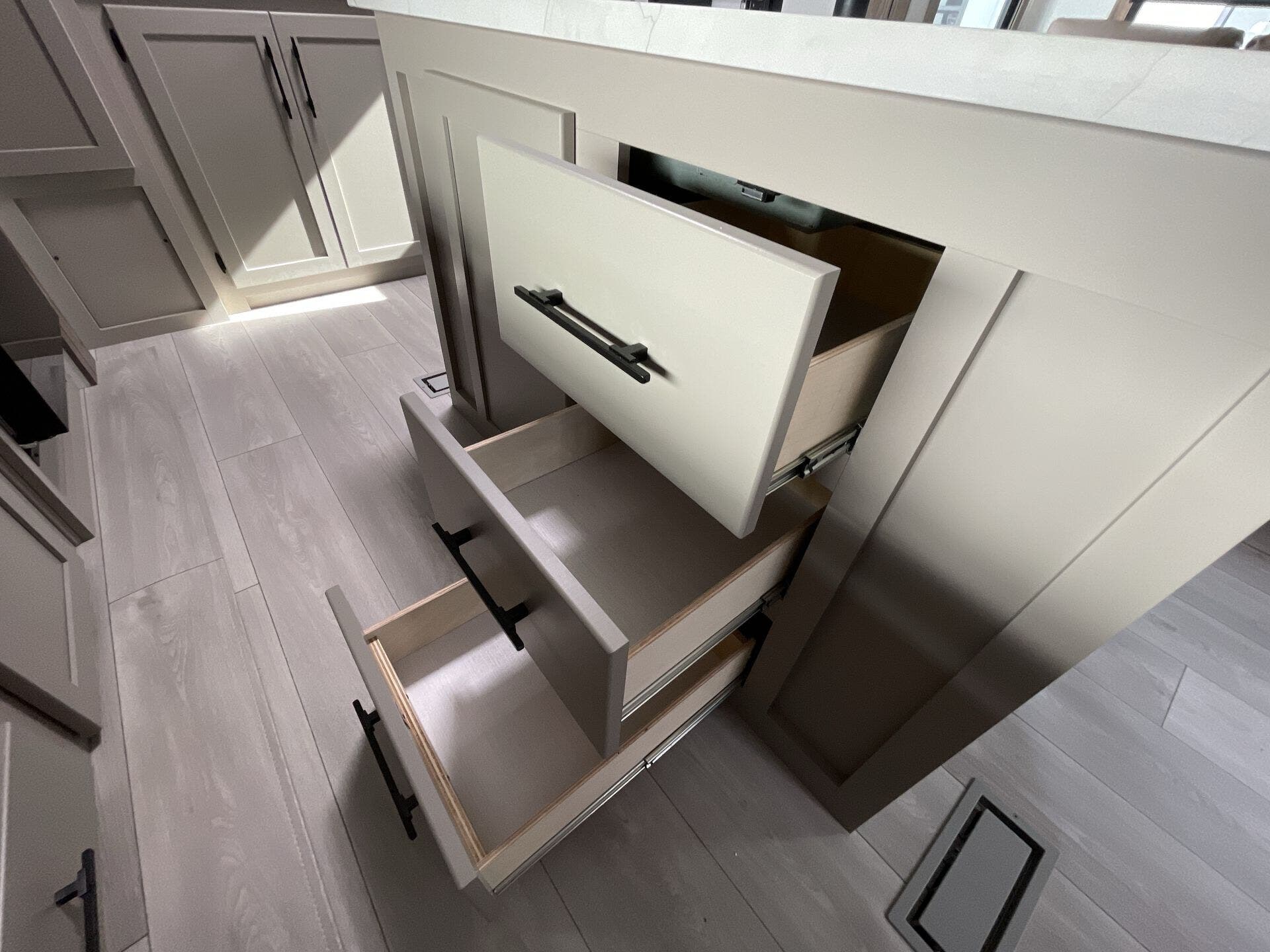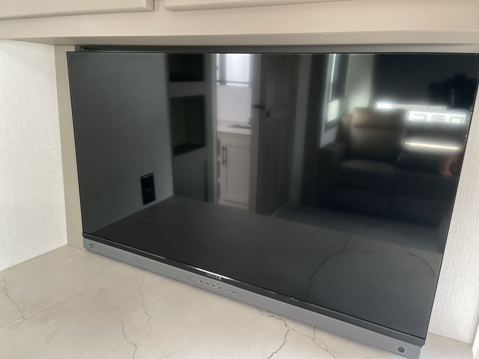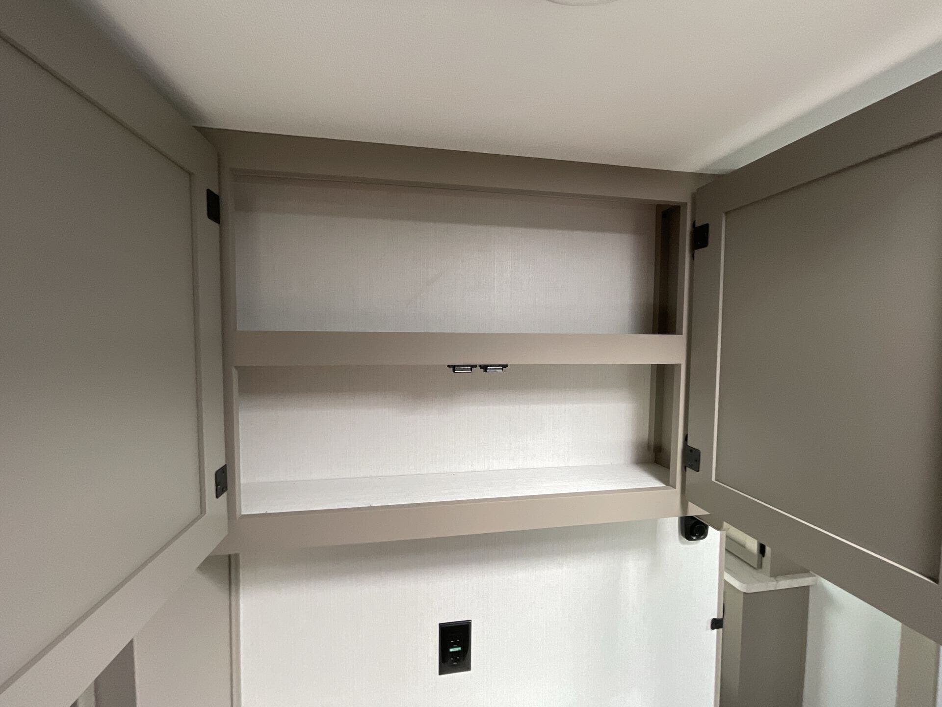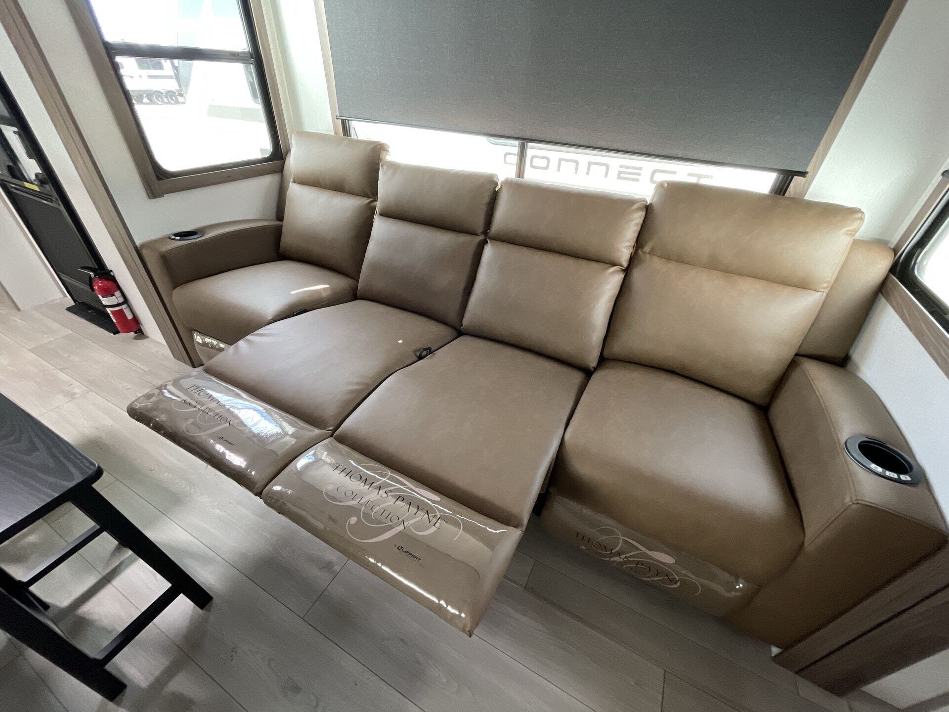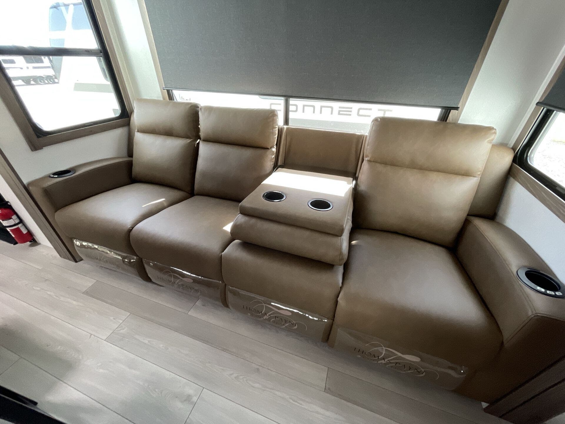 Step inside and you’ll be greeted by an open living area featuring panoramic windows, a cozy sofa or theater seating, and a booth dinette or optional free-standing table. The entertainment center is perfectly placed for relaxing evenings, while the stylish kitchen offers residential touches including solid-surface counters, stainless-steel appliances, generous cabinetry, and a large pantry. Whether you’re whipping up a quick snack or a full meal, the 293RB’s design makes cooking easy and enjoyable.